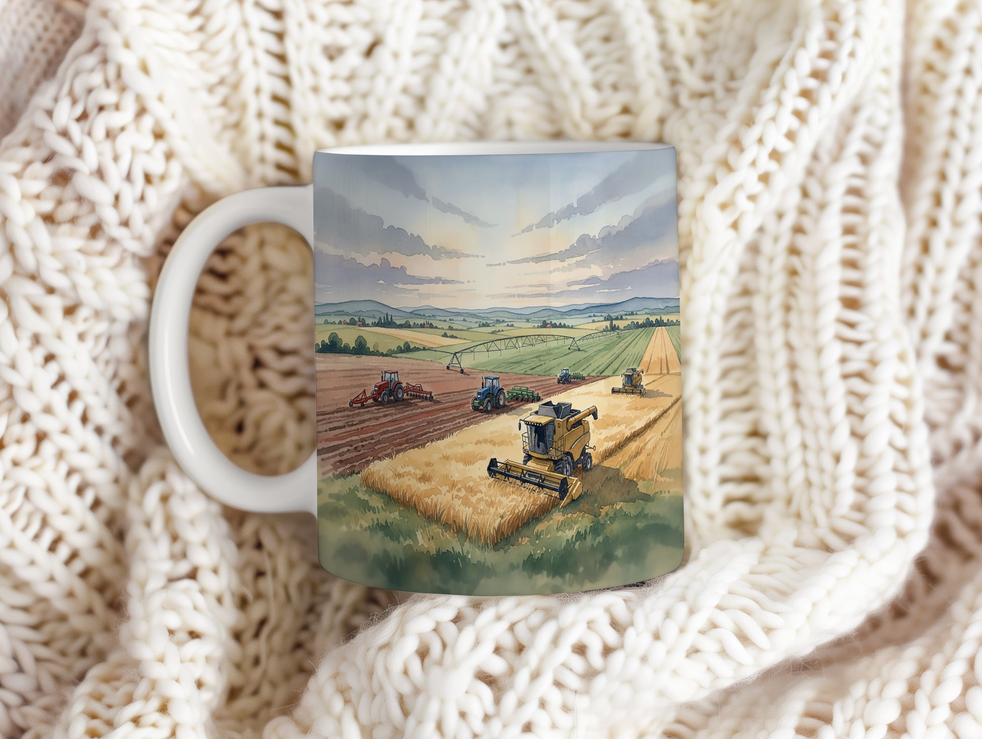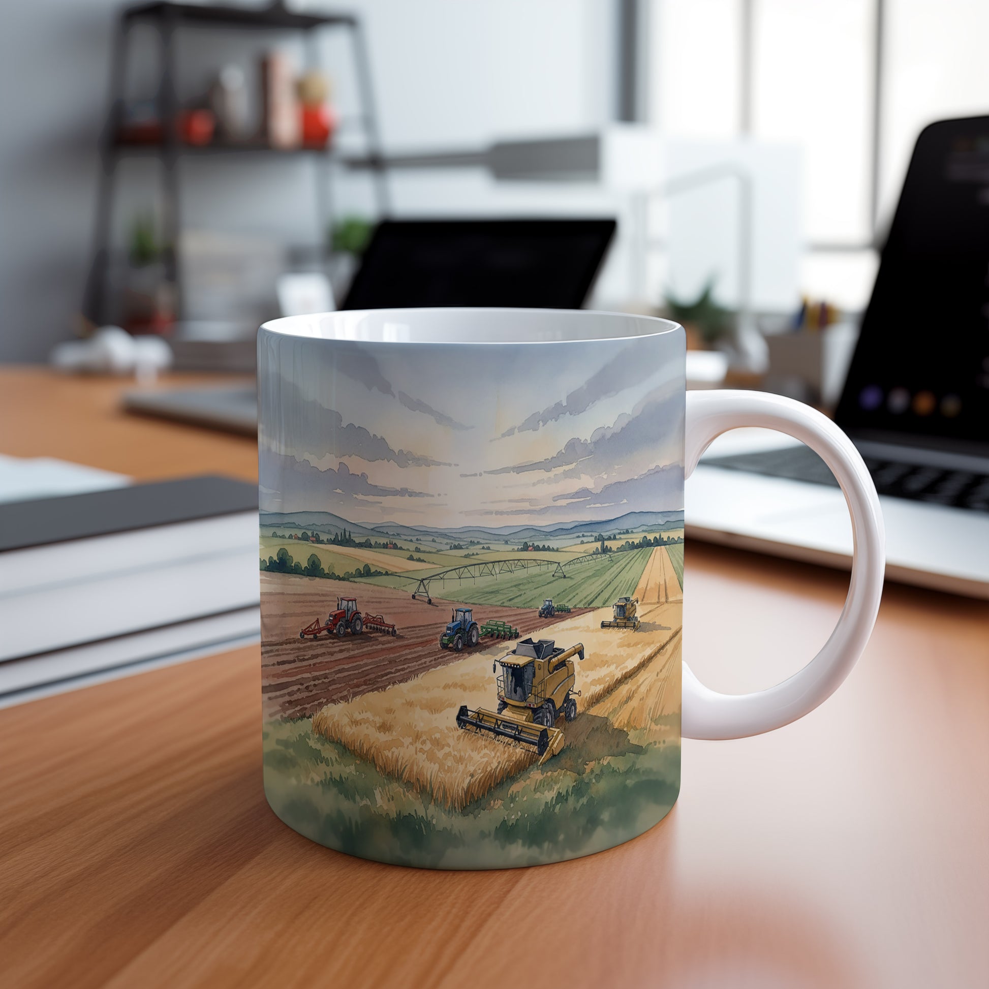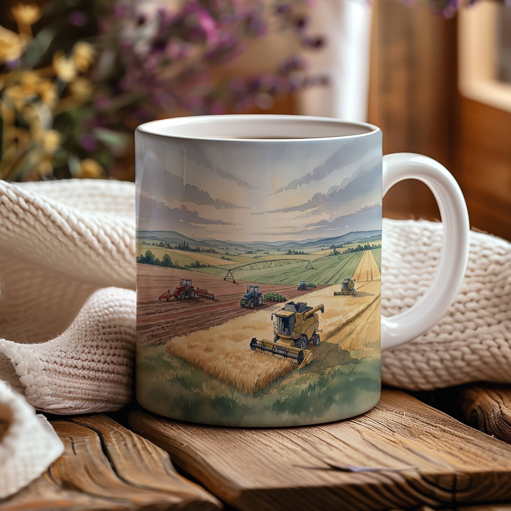 Objevte kouzlo sklizně s tímto hrnkem zdobeným akvarelem kombajnu na zlatavém poli. Ideální pro milovníky zemědělství. Hrnek 330 ml – vhodný do myčky i mikrovlnky.
