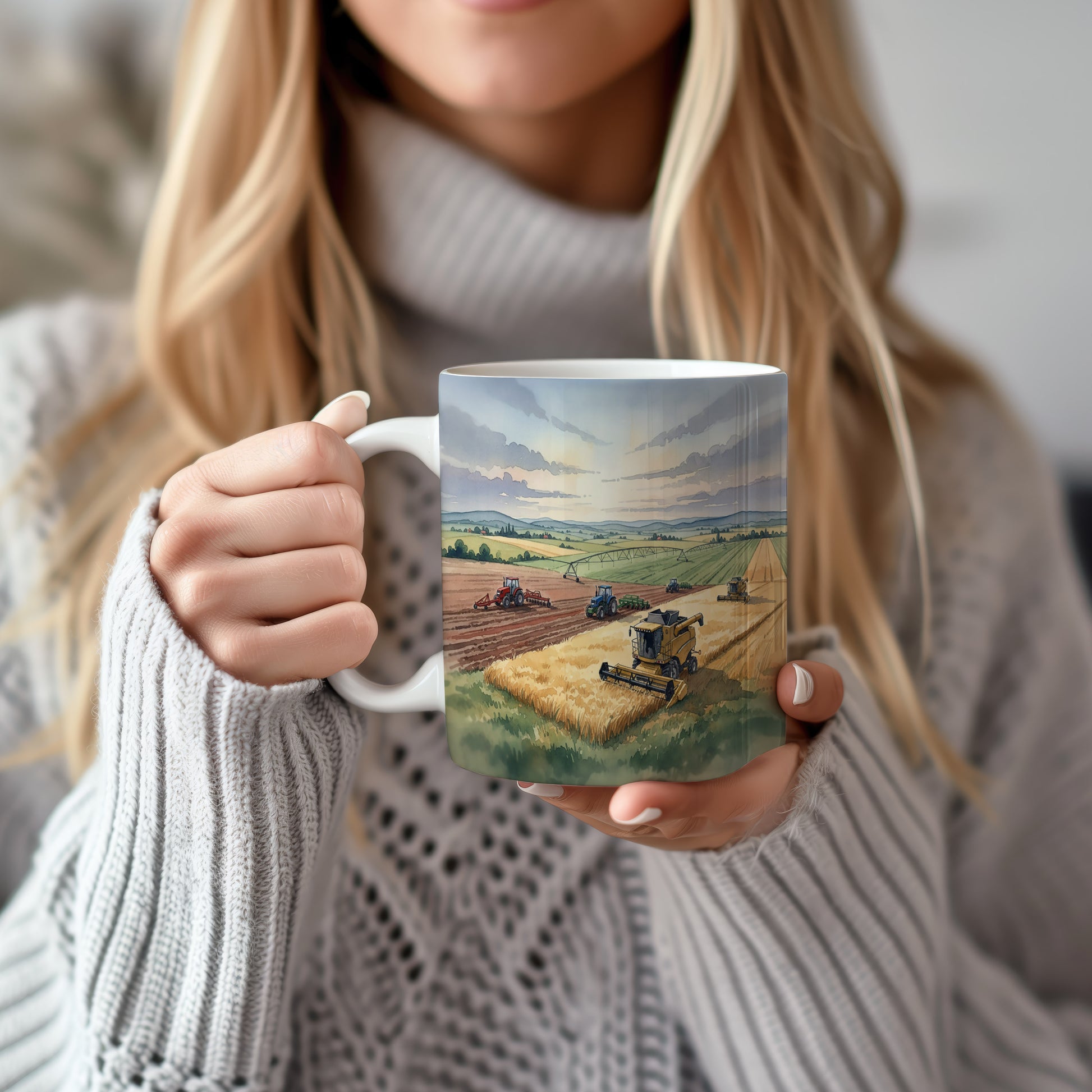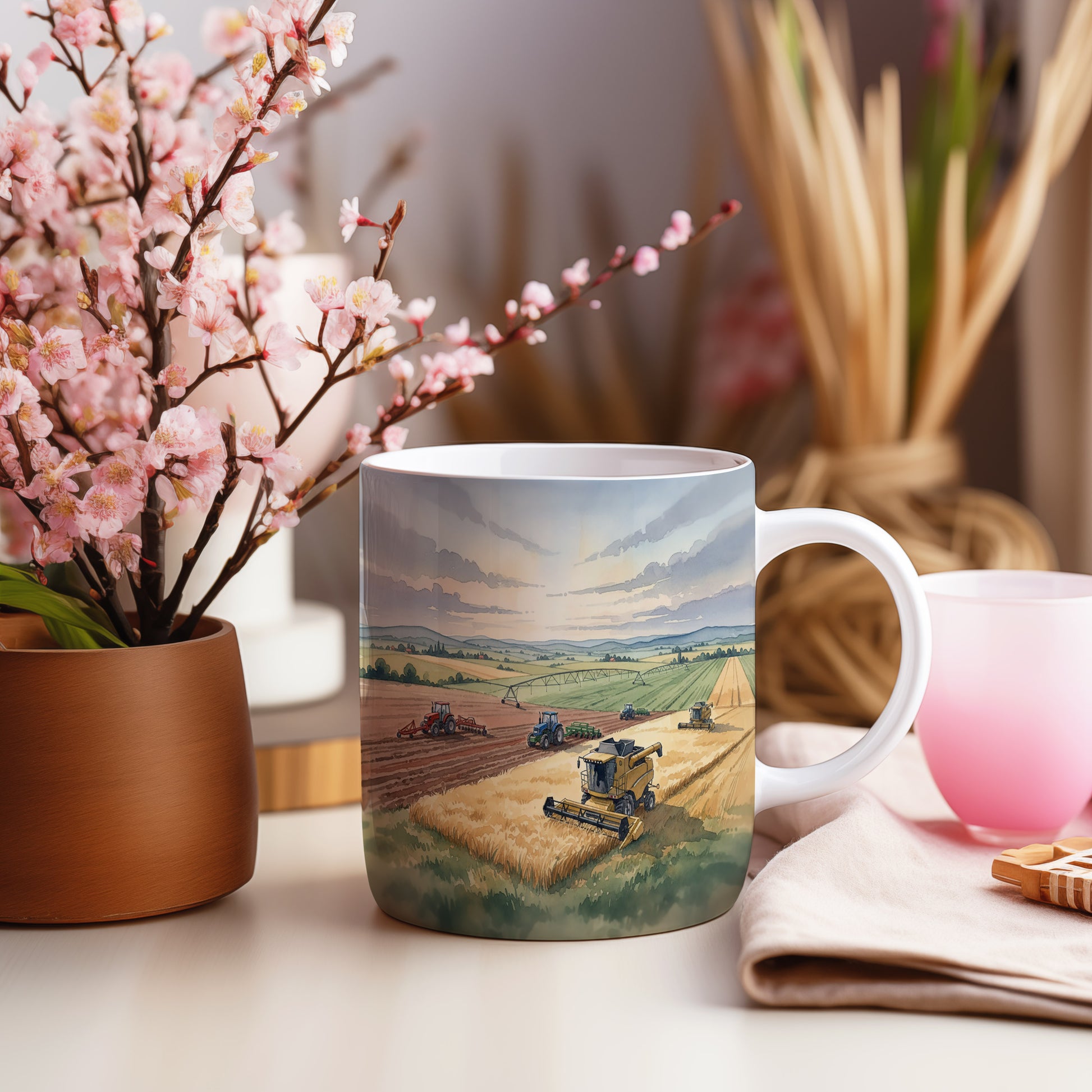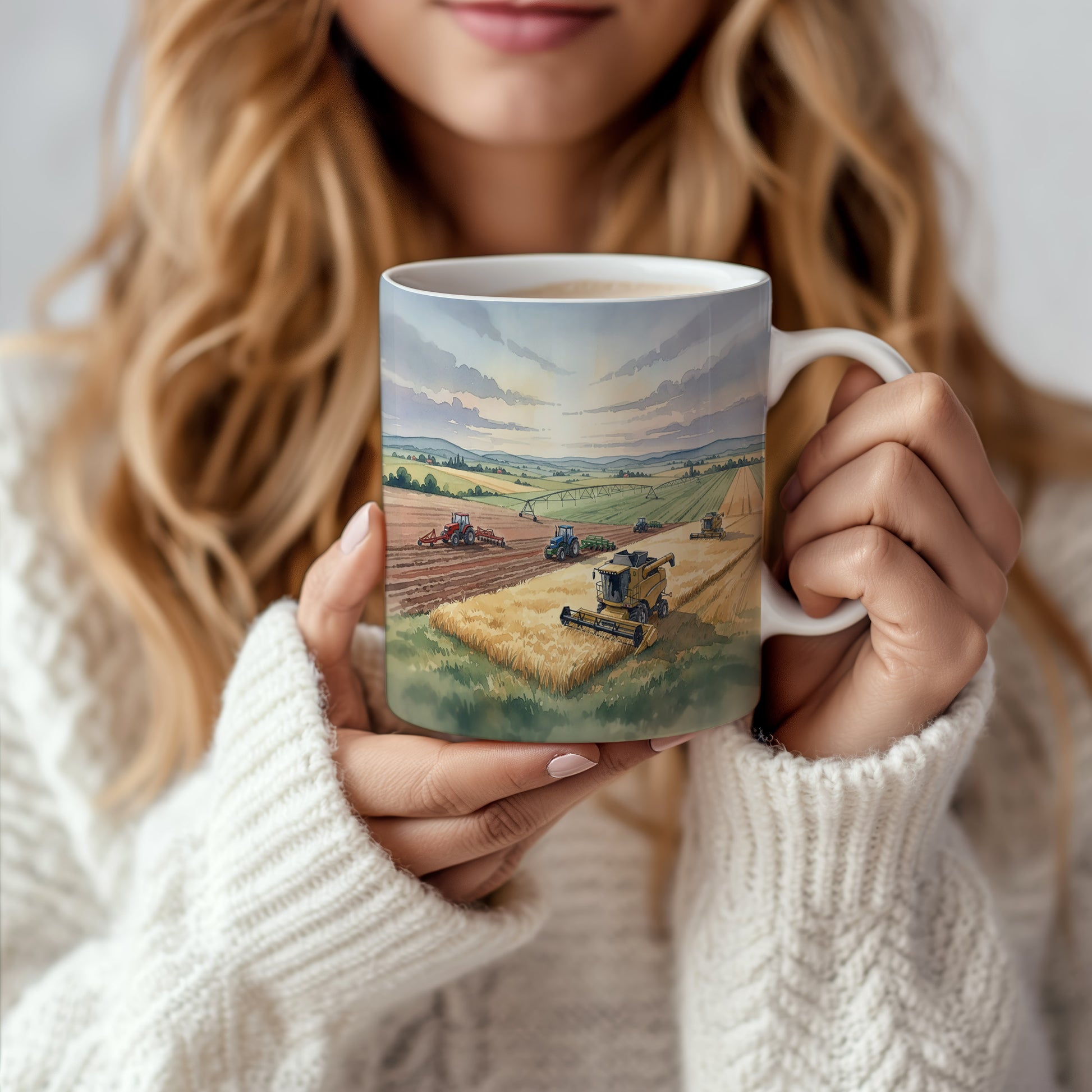 Objevte kouzlo sklizně s tímto hrnkem zdobeným akvarelem kombajnu na zlatavém poli. Ideální pro milovníky zemědělství. Hrnek 330 ml – vhodný do myčky i mikrovlnky.