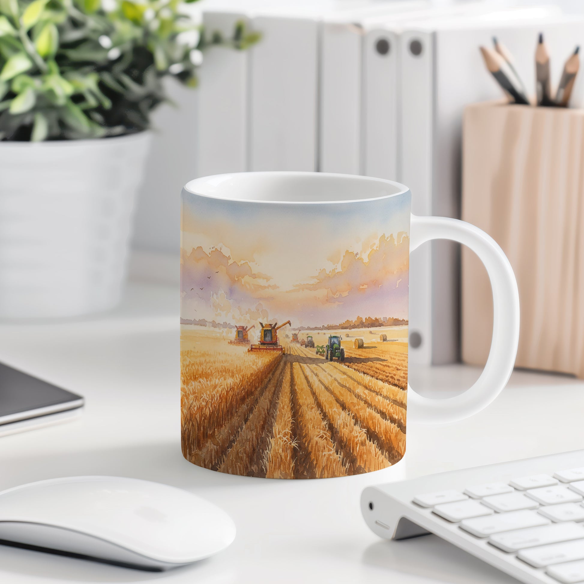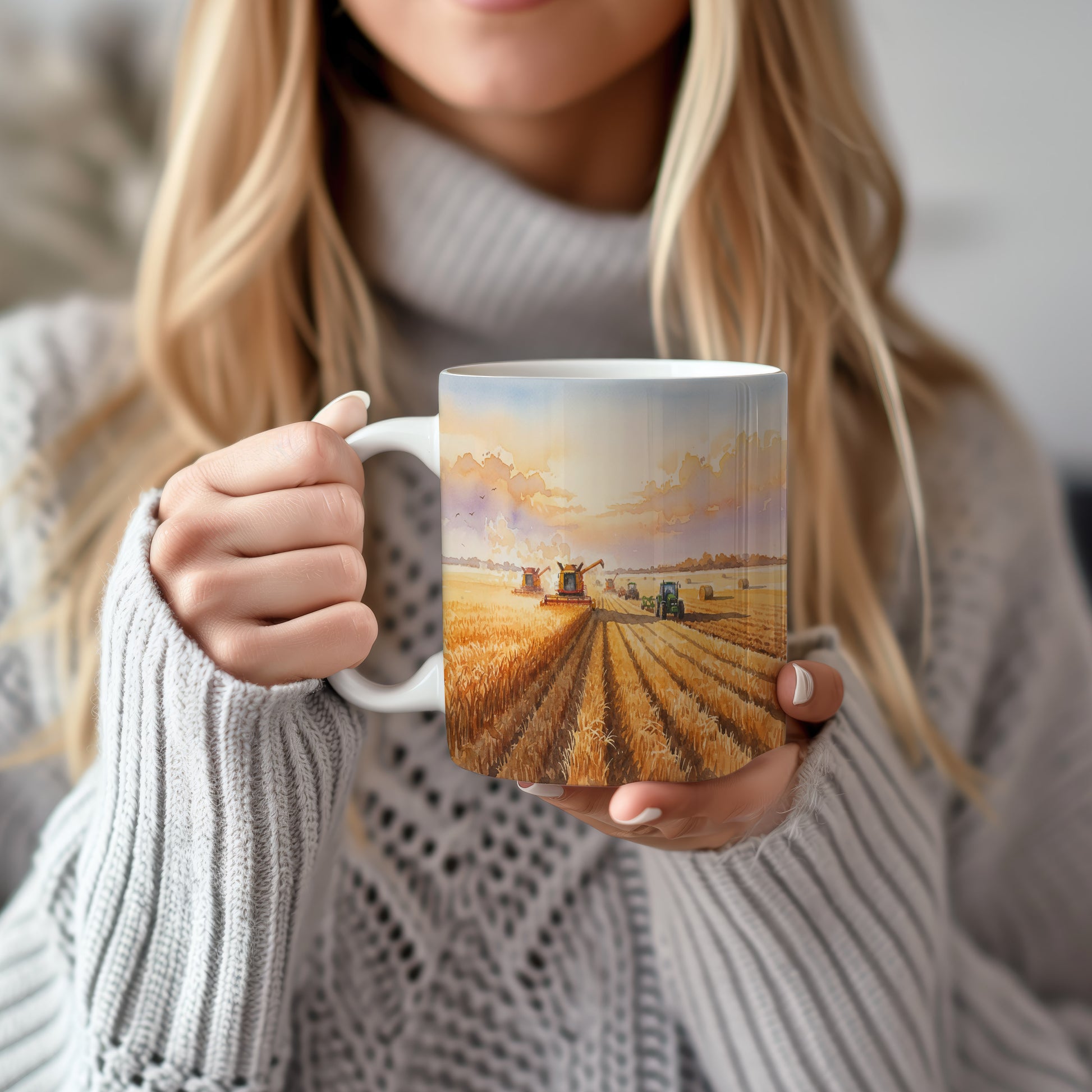 Objevte kouzlo venkova s hrnkem zdobeným akvarelovým motivem kombajnů na poli při západu slunce. Hrnek 330 ml – vhodný do myčky i mikrovlnky.