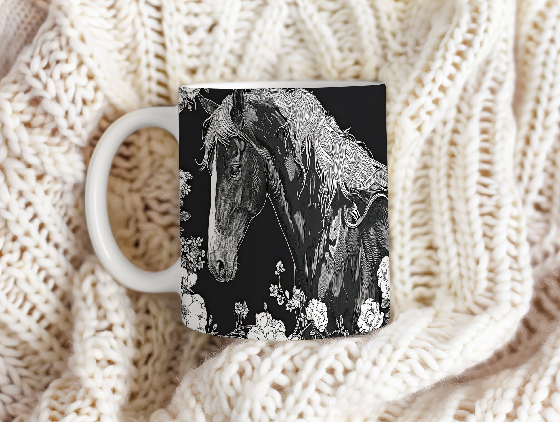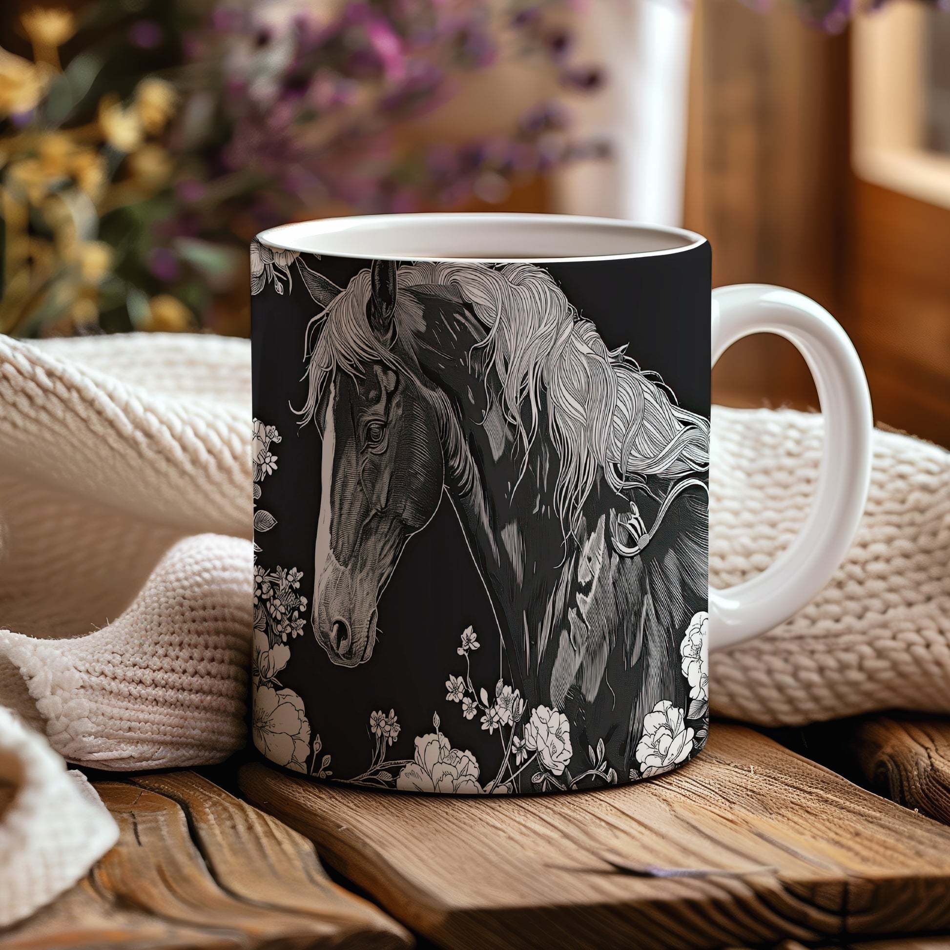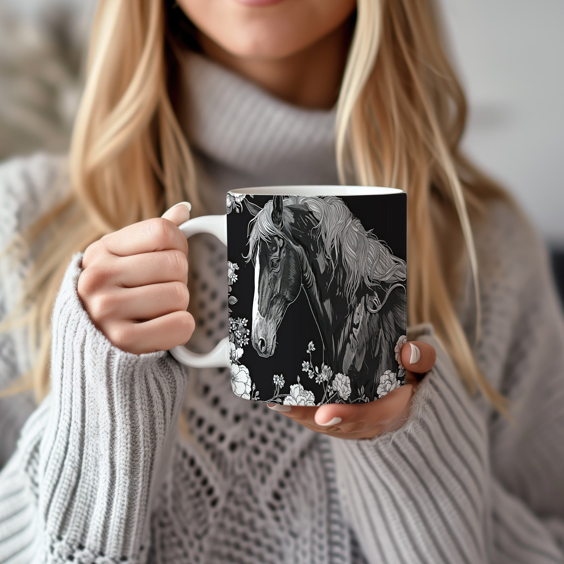 Stylový hrnek s realistickým motivem koně a květin. Tento hrnek je ideální pro milovníky jezdectví a přírody, skvělý tip na dárek pro každého, kdo má rád zvířata. Materiál: keramika. Objem: 330 ml. Vhodné do myčky i mikrovlnky. Používání tohoto hrnku přináší radost z každého doušku.