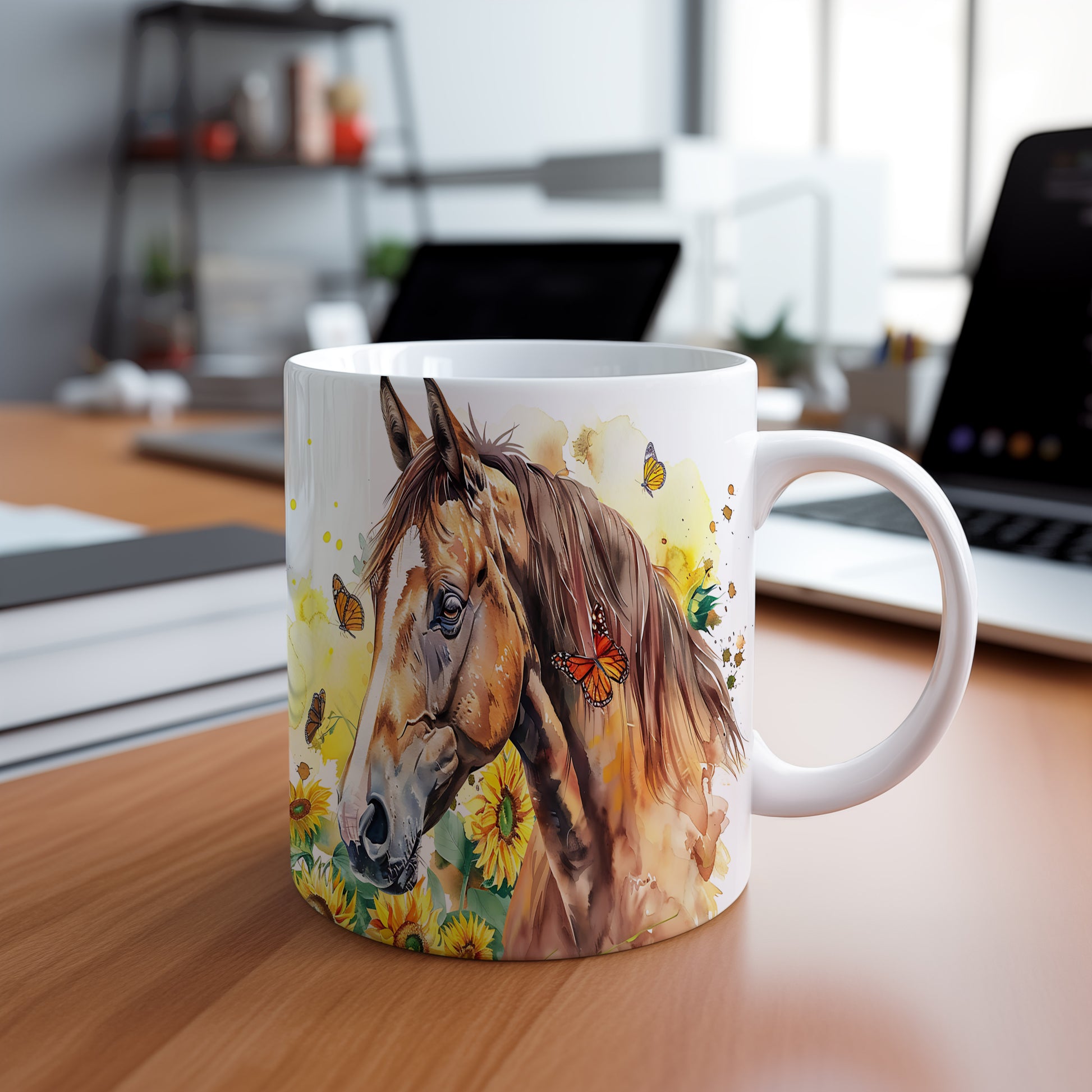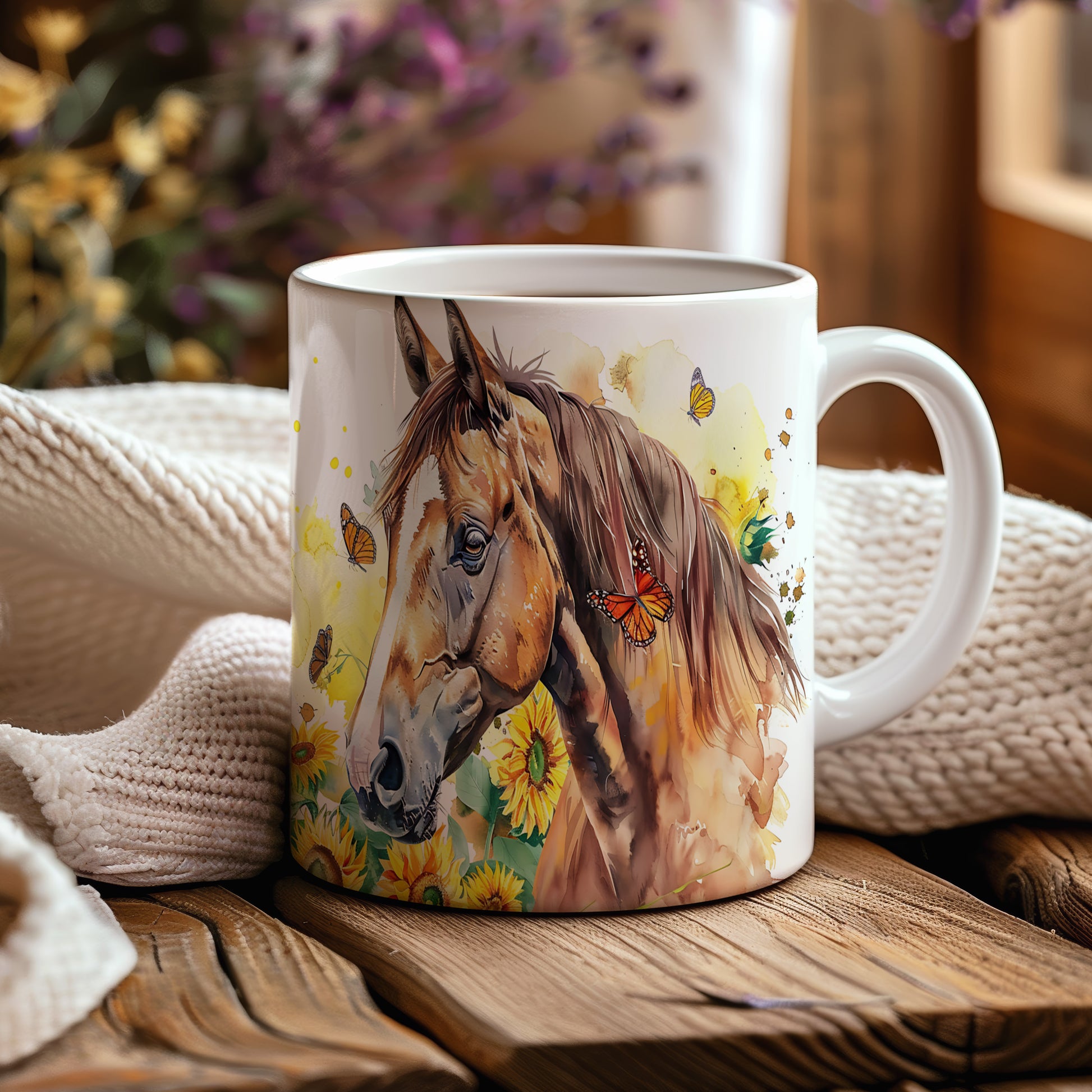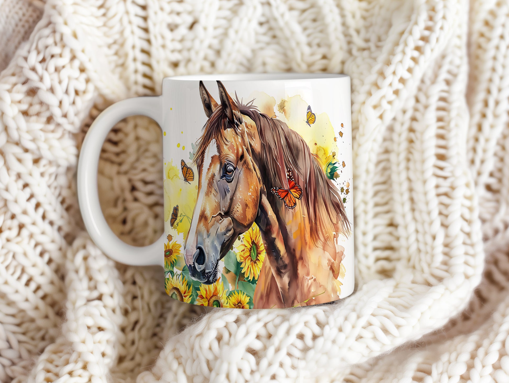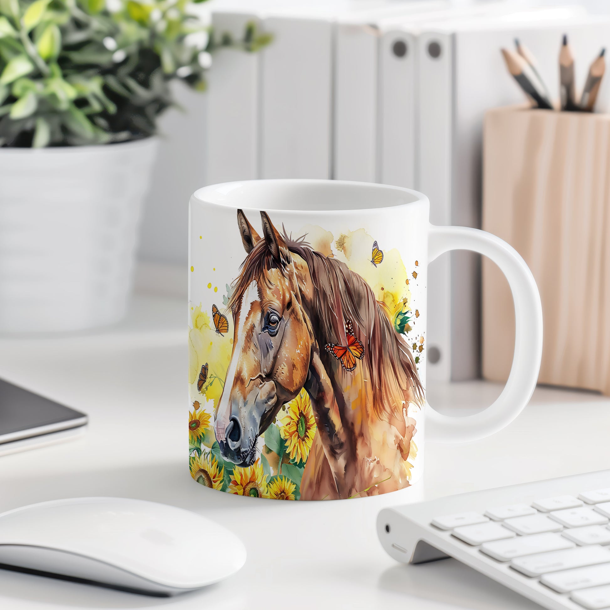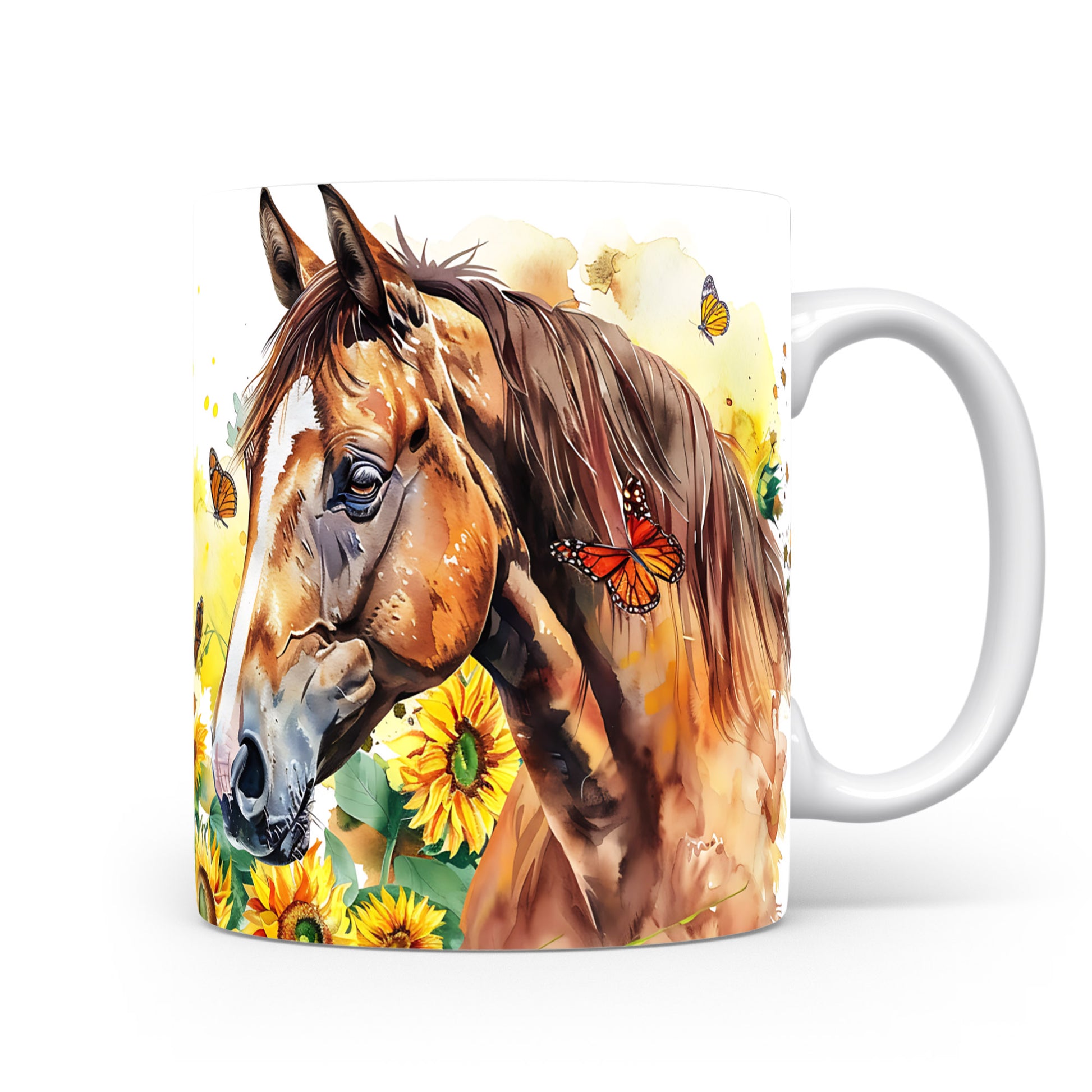 Hrnek s motivem koně obklopeného slunečnicemi a motýly je skvělou volbou pro milovníky přírody a zvířat. Tento hrnek je ideální jako dárek pro přátele nebo rodinu, kteří ocení krásu přírody. Materiál: keramika. Objem: 330 ml. Vhodné do myčky i mikrovlnky. Používání tohoto hrnku přináší radost z každého doušku.