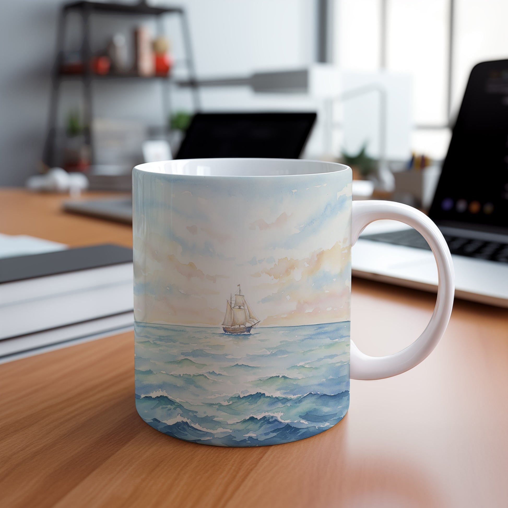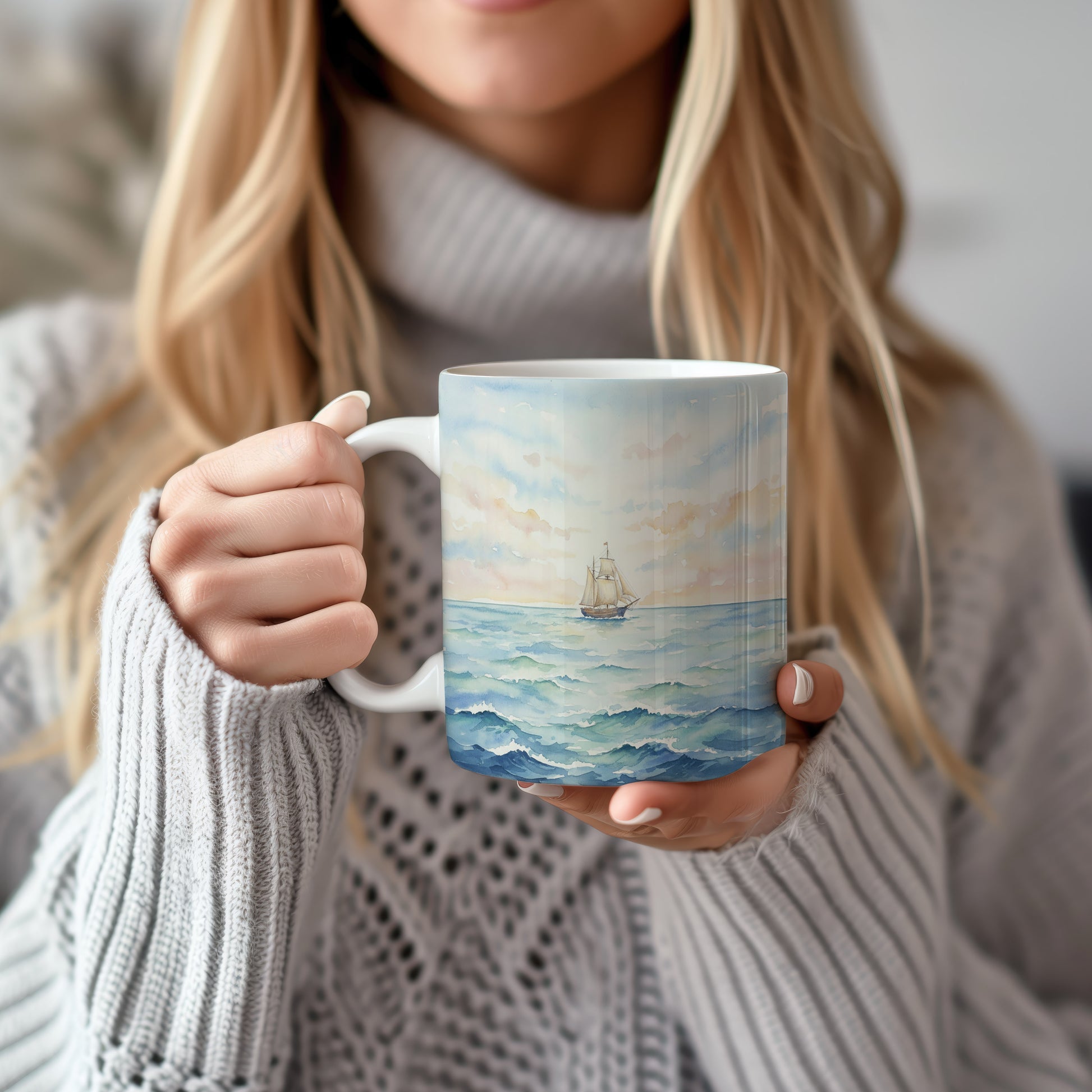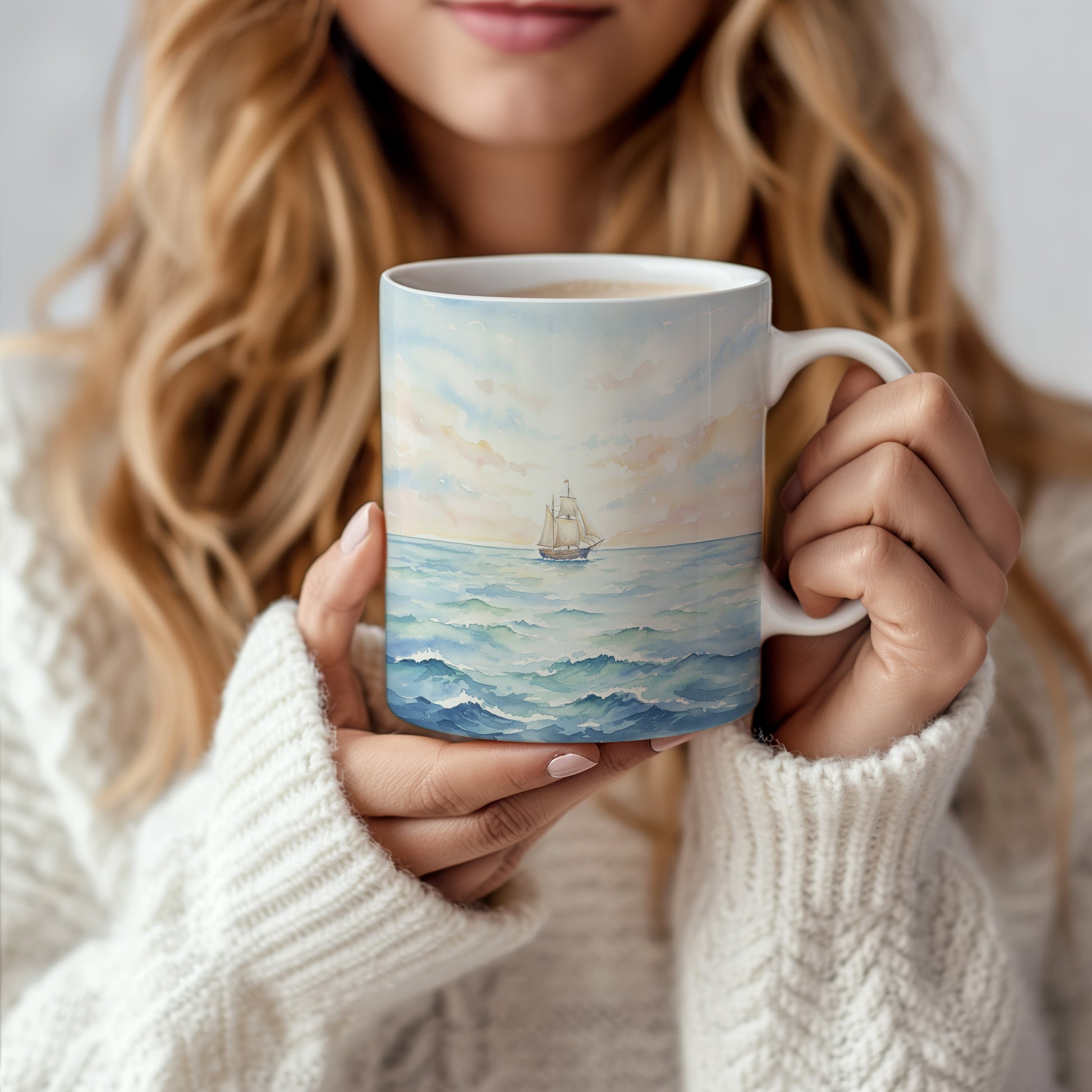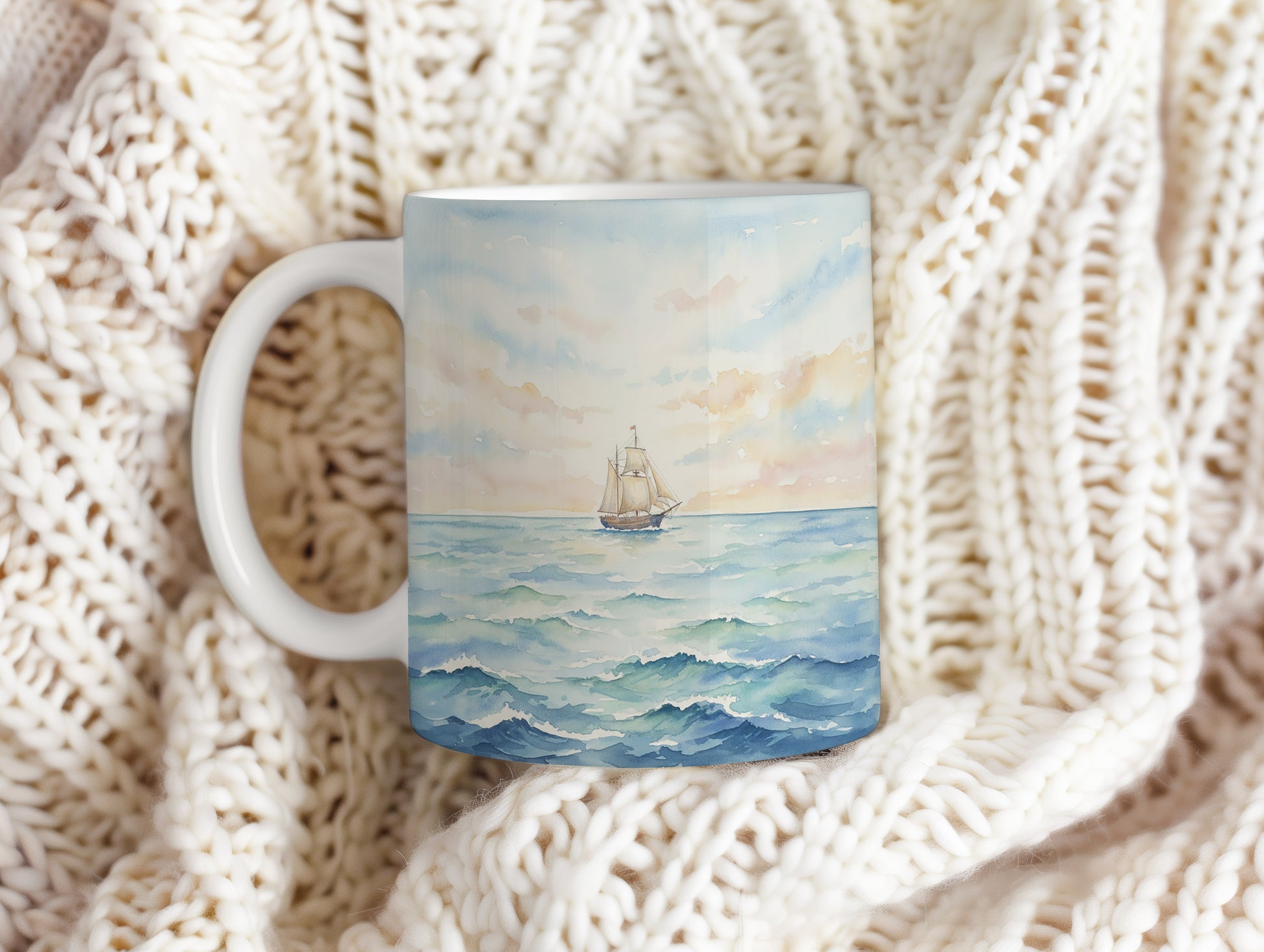 Objevte kouzlo moří s hrnkem, který zobrazuje majestátní plachetnici na otevřeném moři v jemných akvarelových tónech. Ideální pro milovníky námořních dobrodružství. Hrnek 330 ml – vhodný do myčky i mikrovlnky.