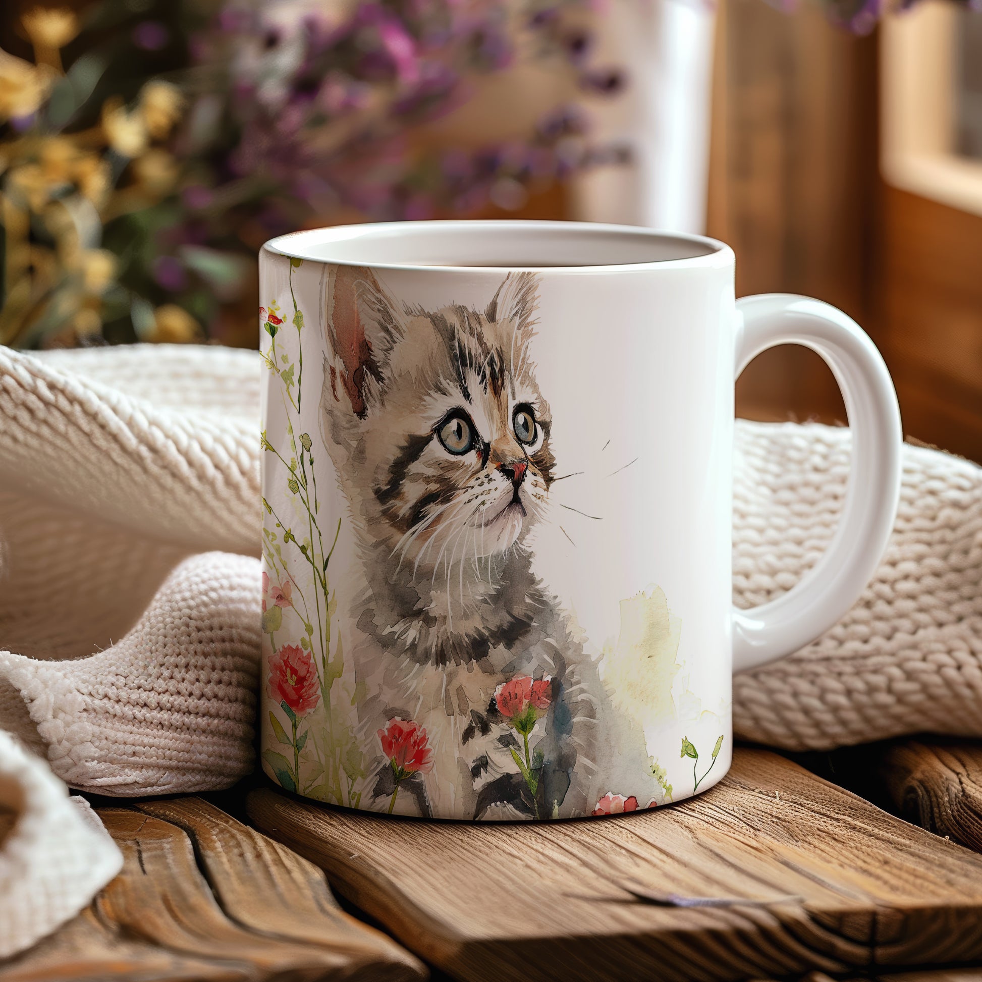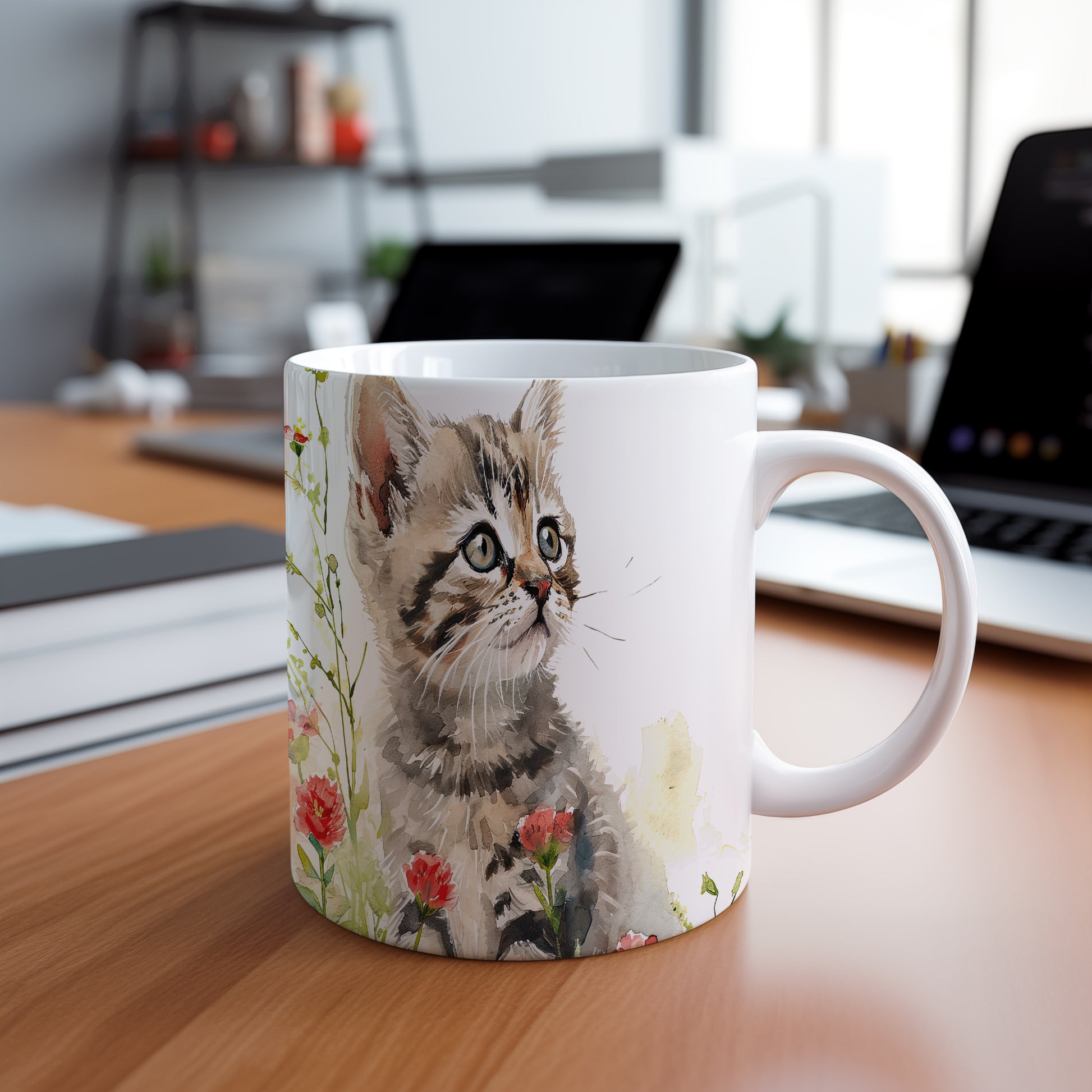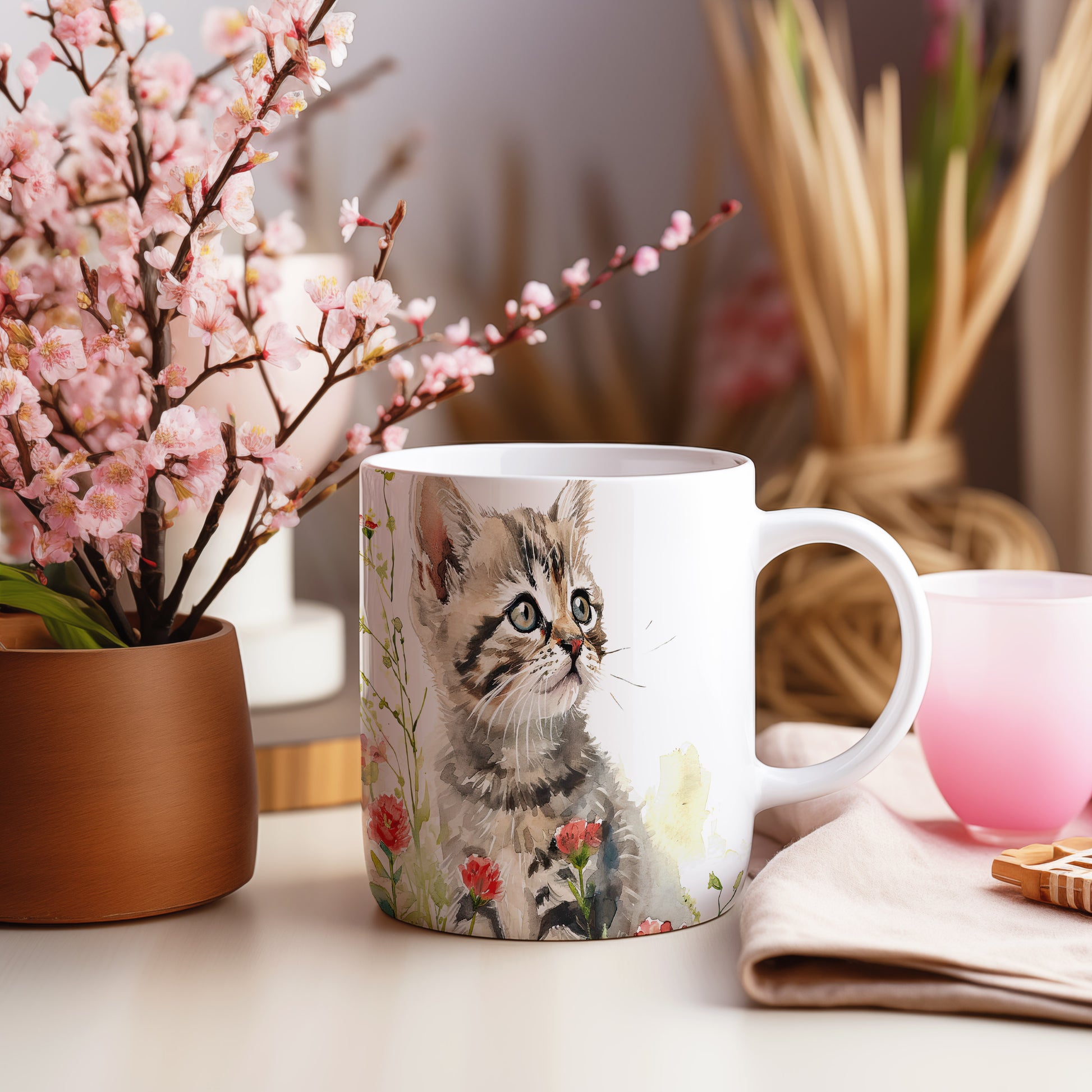 Hrnek s roztomilým motivem koťátka a květin. Tento stylový hrnek je ideální pro milovníky koček a květin, skvělý tip na dárek pro přátele nebo rodinu. Materiál: keramika. Objem: 330 ml. Vhodné do myčky i mikrovlnky. Užívejte si svůj oblíbený nápoj s tímto hrnkem a přidejte do svého dne trochu radosti.