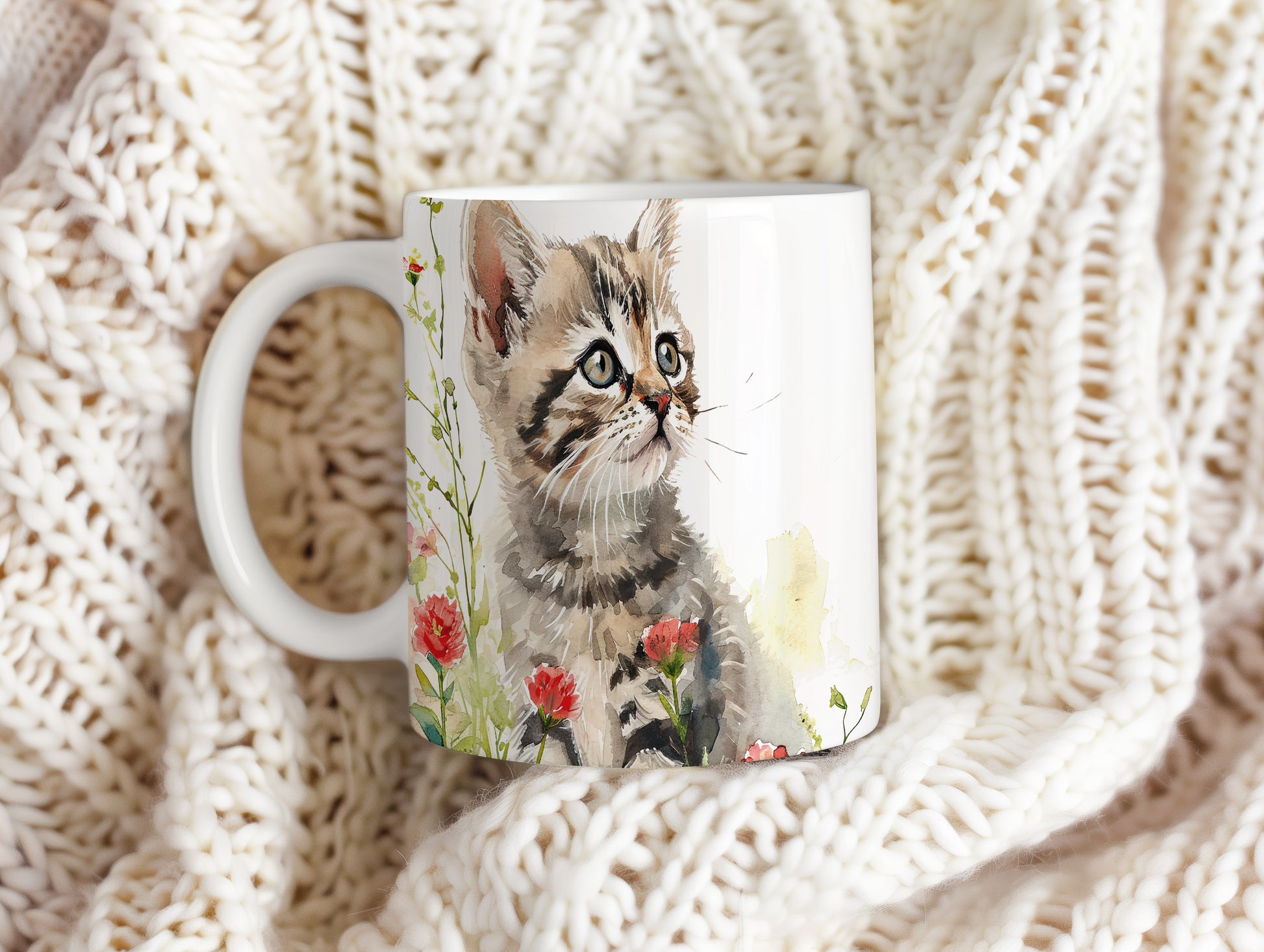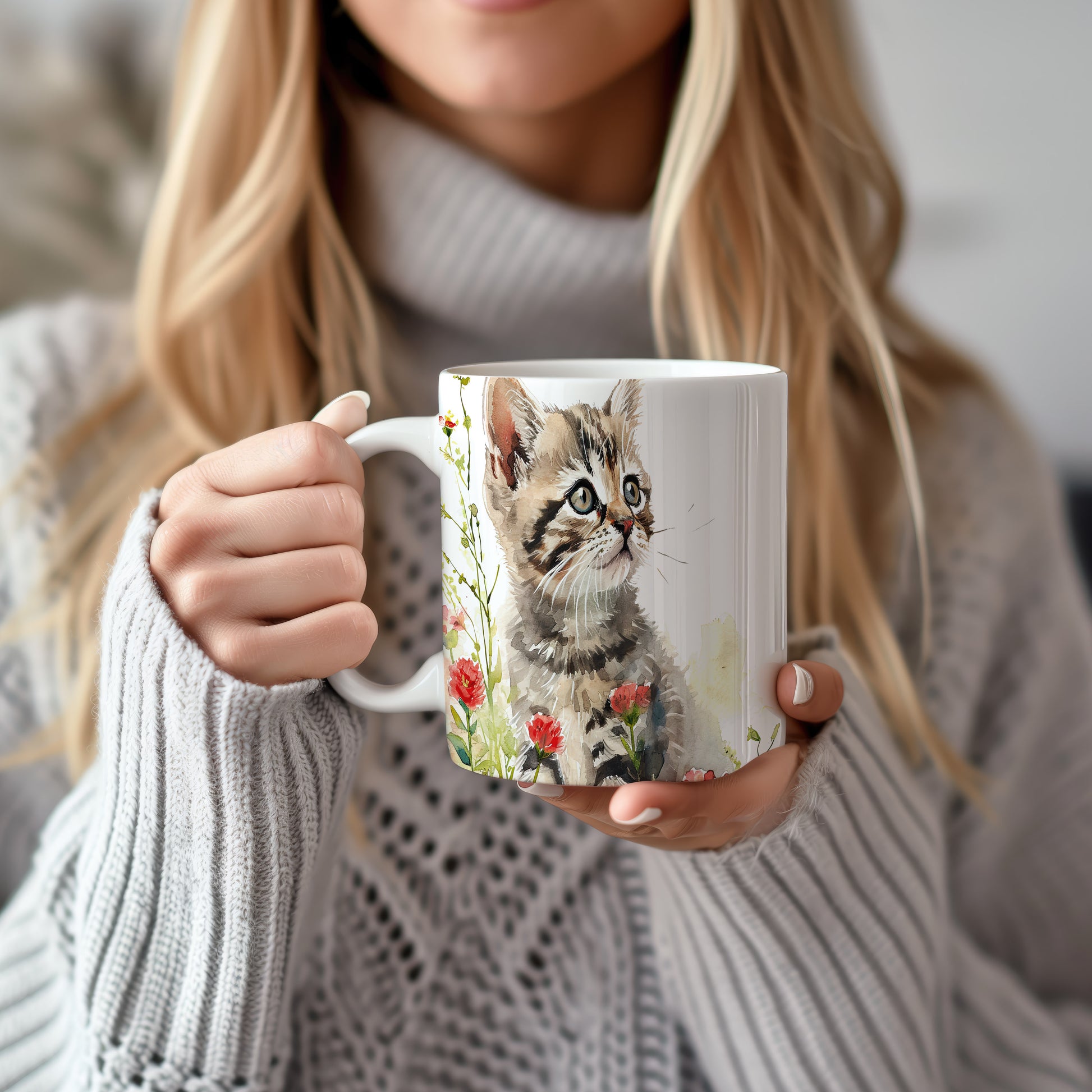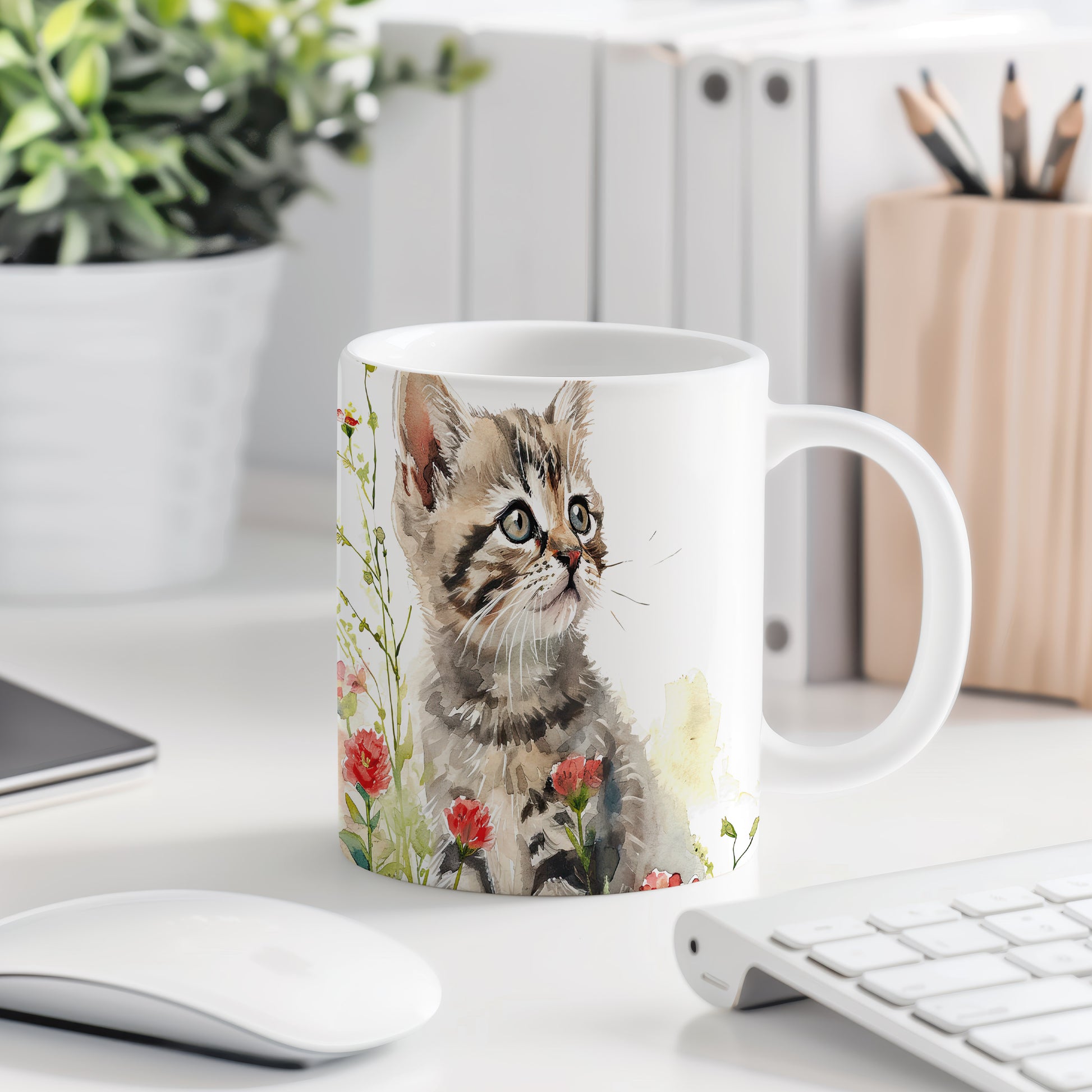 Hrnek s roztomilým motivem koťátka a květin. Tento stylový hrnek je ideální pro milovníky koček a květin, skvělý tip na dárek pro přátele nebo rodinu. Materiál: keramika. Objem: 330 ml. Vhodné do myčky i mikrovlnky. Užívejte si svůj oblíbený nápoj s tímto hrnkem a přidejte do svého dne trochu radosti.