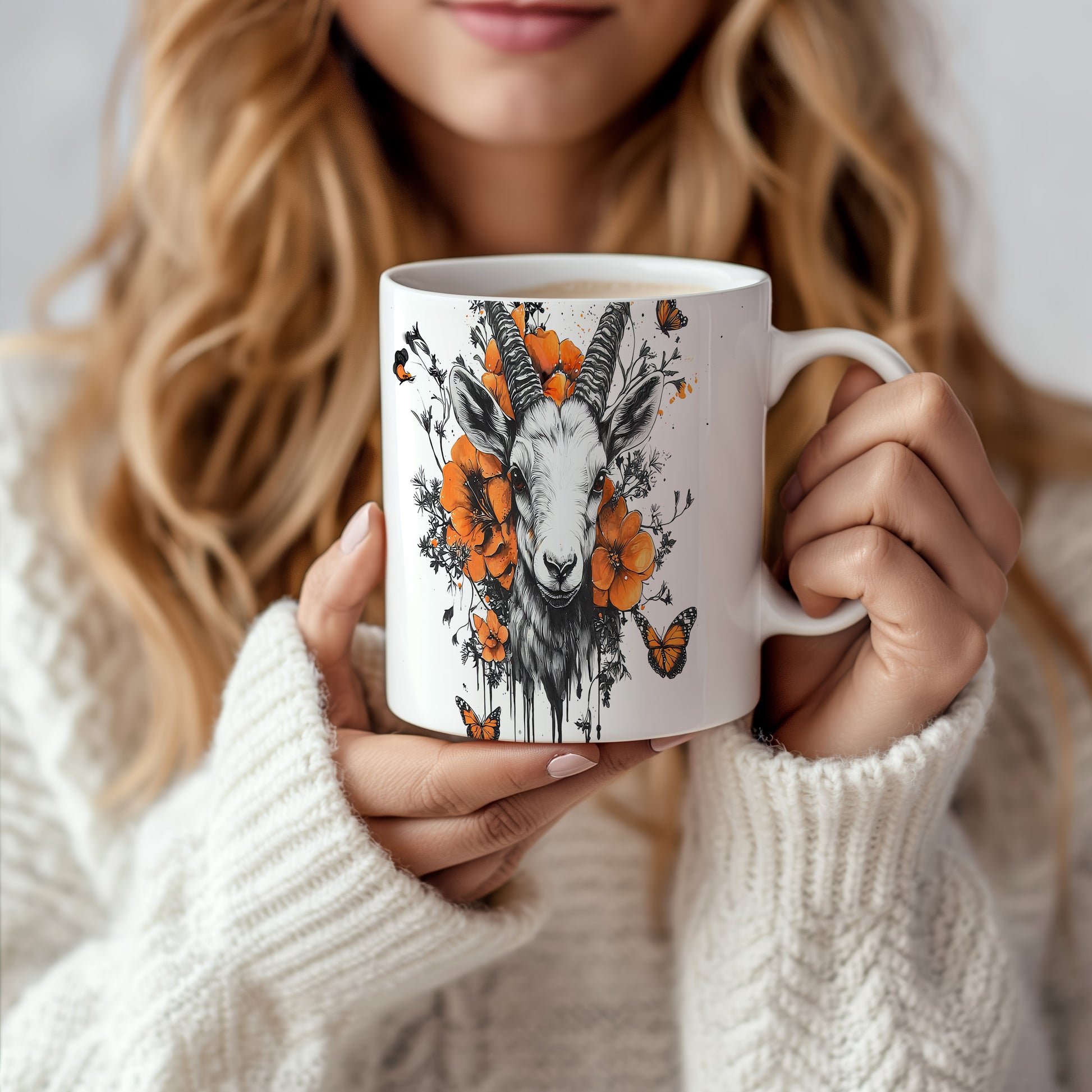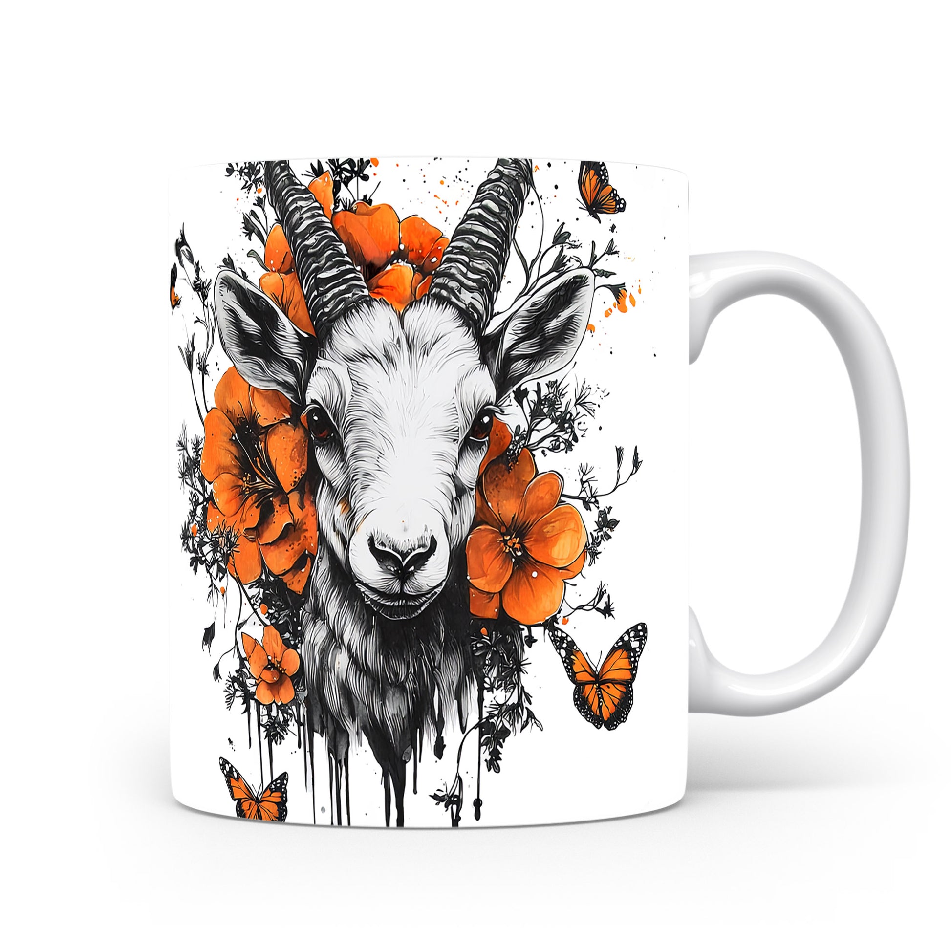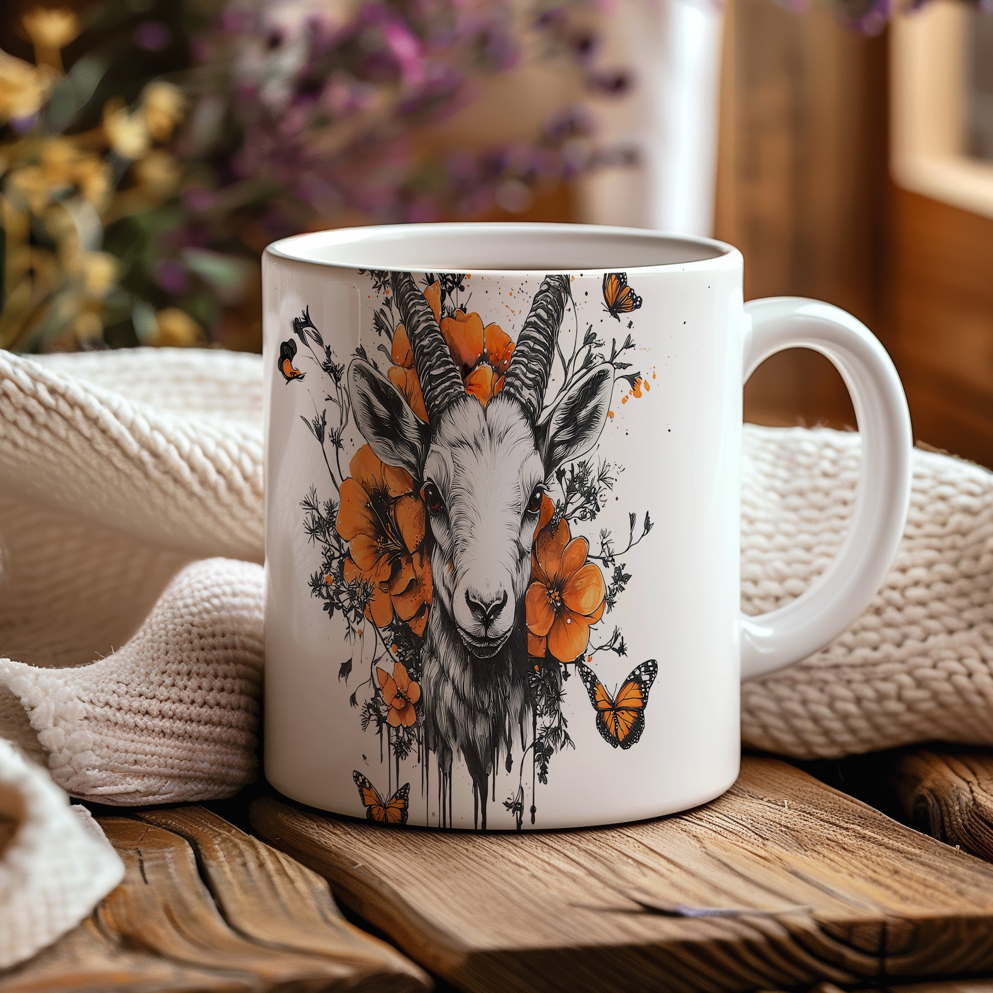 Hrnek s realistickým motivem kozy obklopené květinami a motýly. Tento originální design je ideální pro milovníky přírody a skvělý tip na dárek pro přátele. Materiál: keramika. Objem: 330 ml. Vhodné do myčky i mikrovlnky. Používání tohoto hrnku přinese do každého dne svěží nádech.