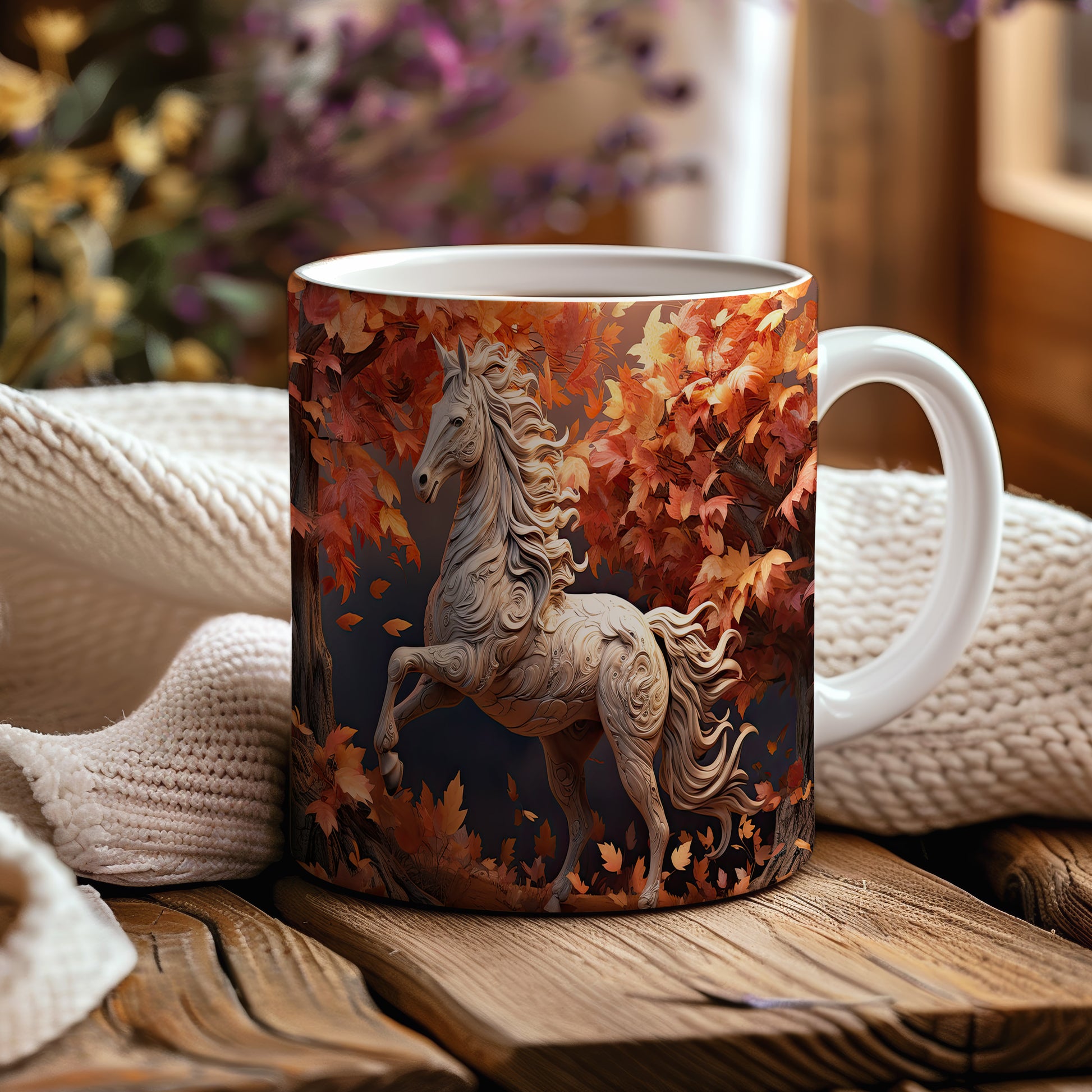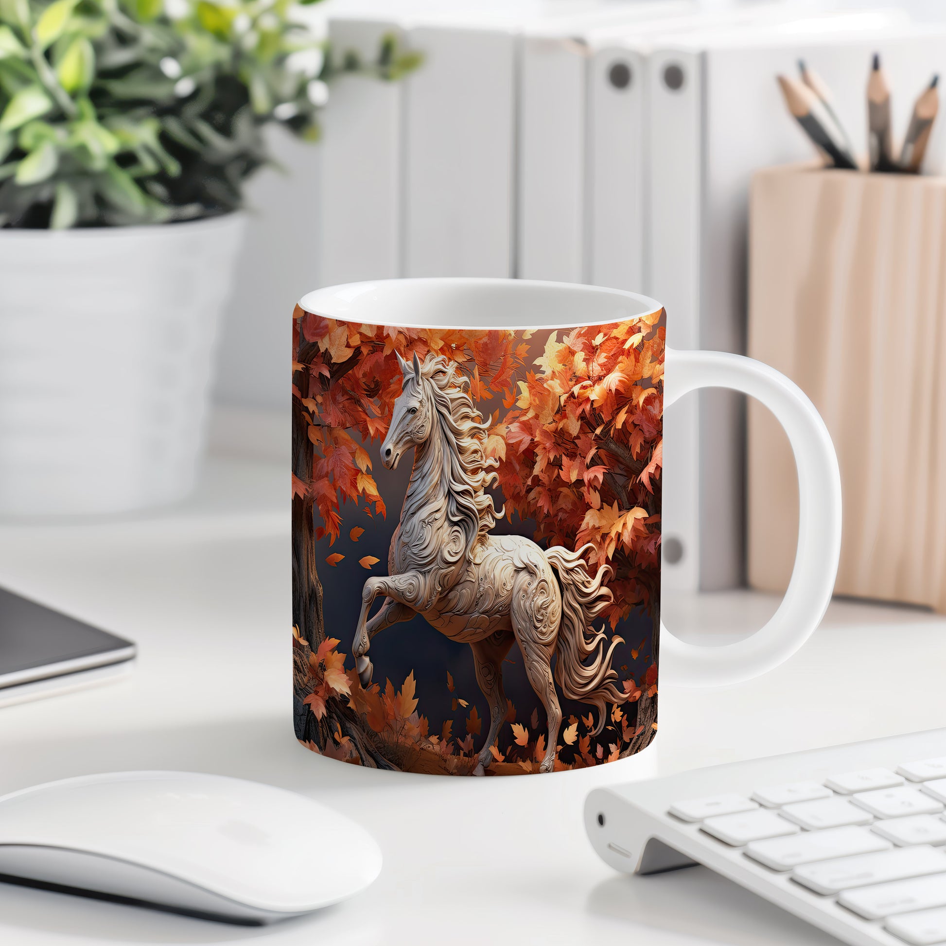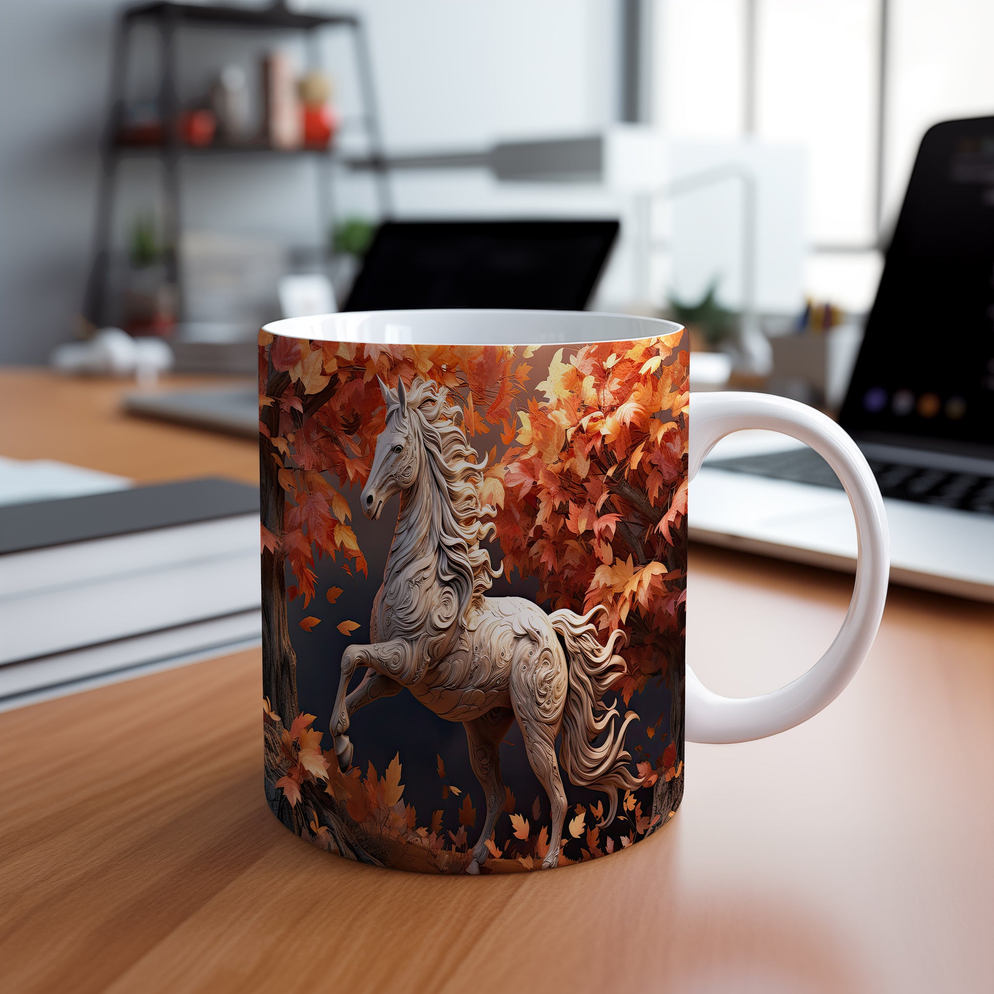 Tento hrnek zobrazuje elegantního koně obklopeného pestrobarevnými podzimními listy. Je ideální pro milovníky koní a přírody, skvělý tip na dárek pro každého, kdo ocení krásu zvířat. Materiál: keramika. Objem: 330 ml. Vhodné do myčky i mikrovlnky. Používáním tohoto hrnku si můžete vychutnat svůj oblíbený nápoj s nádechem přírody.