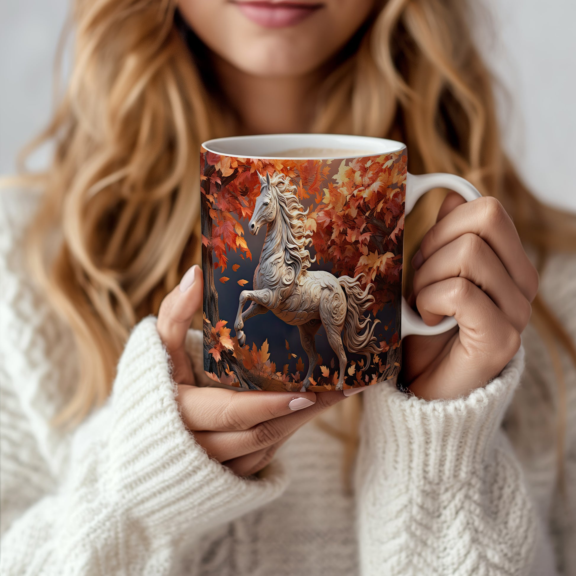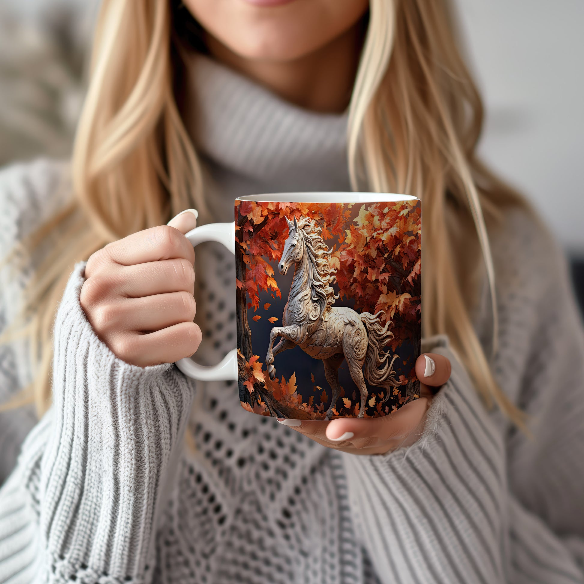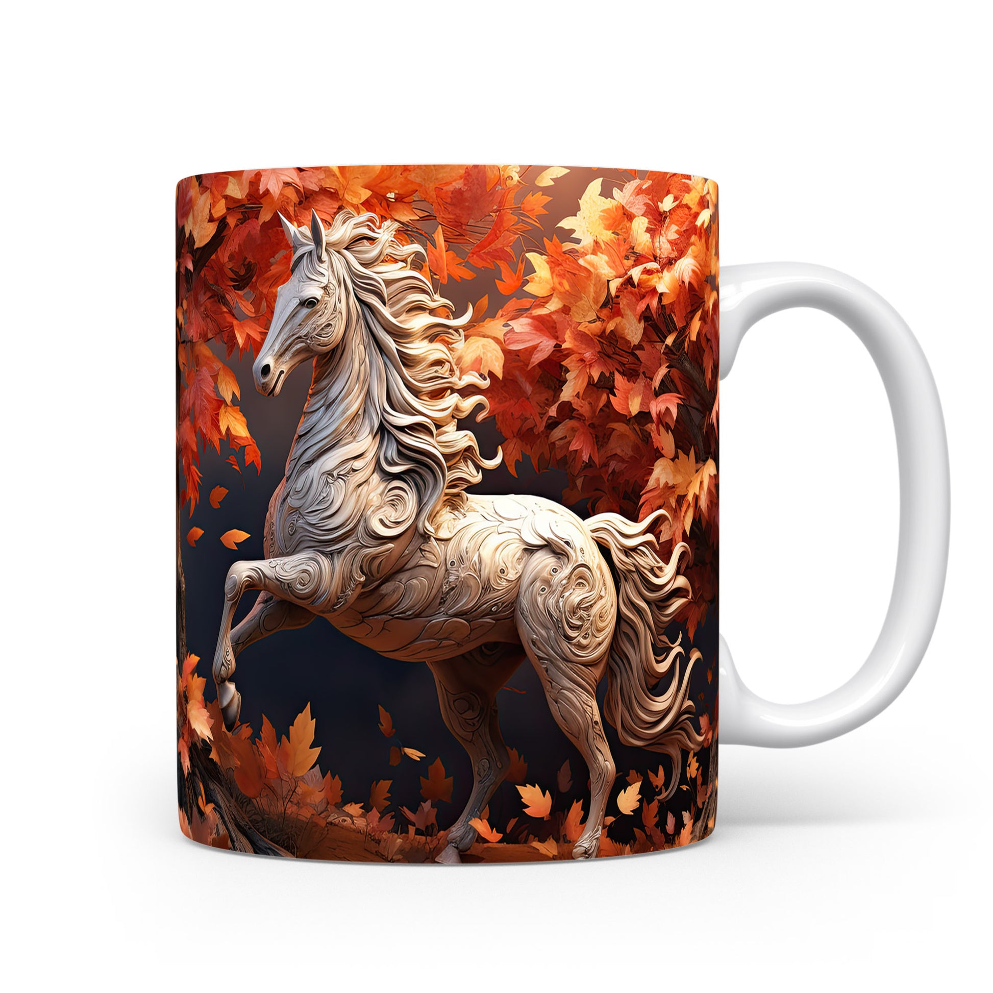 Tento hrnek zobrazuje elegantního koně obklopeného pestrobarevnými podzimními listy. Je ideální pro milovníky koní a přírody, skvělý tip na dárek pro každého, kdo ocení krásu zvířat. Materiál: keramika. Objem: 330 ml. Vhodné do myčky i mikrovlnky. Používáním tohoto hrnku si můžete vychutnat svůj oblíbený nápoj s nádechem přírody.