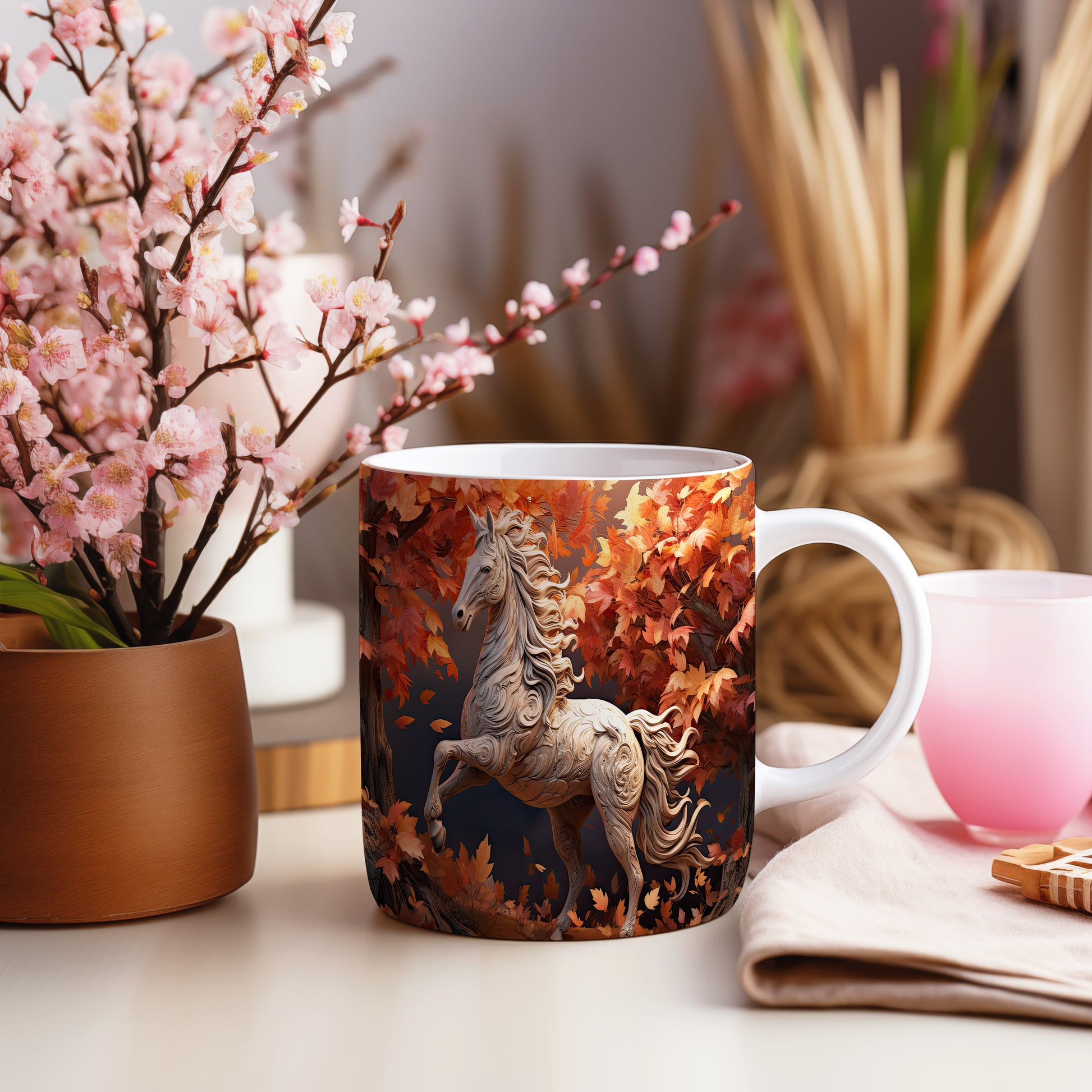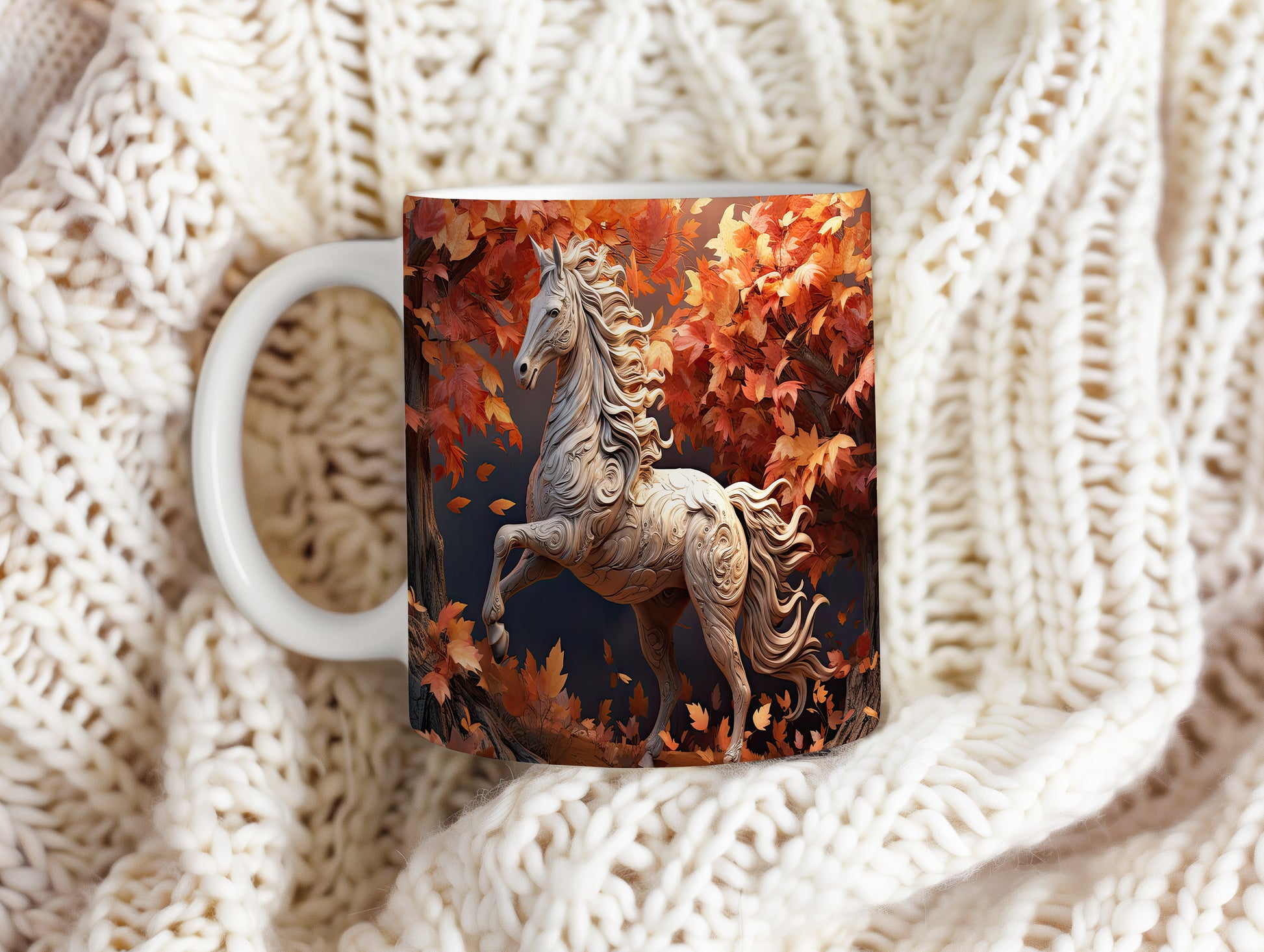 Hrnek s krásným koněm mezi listím