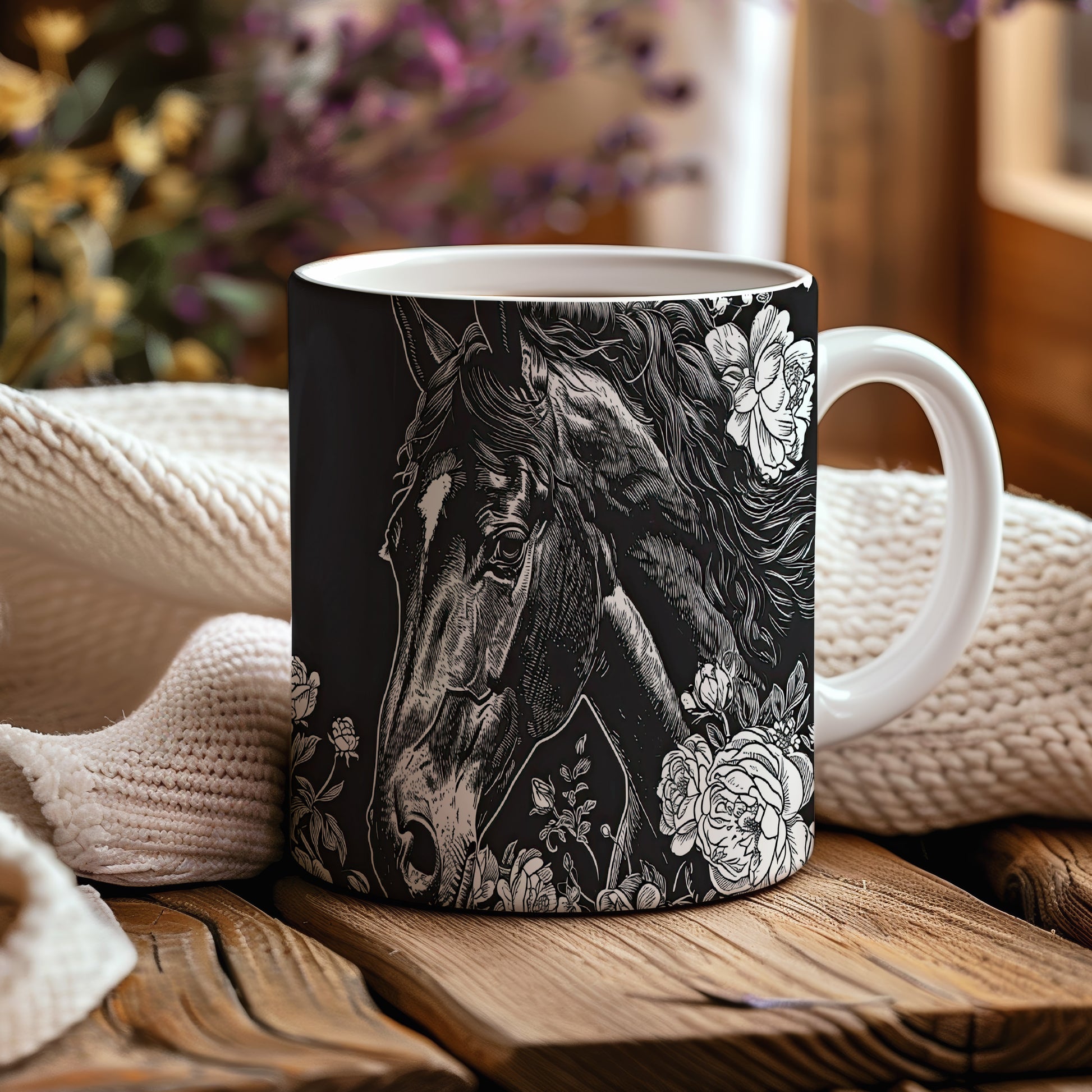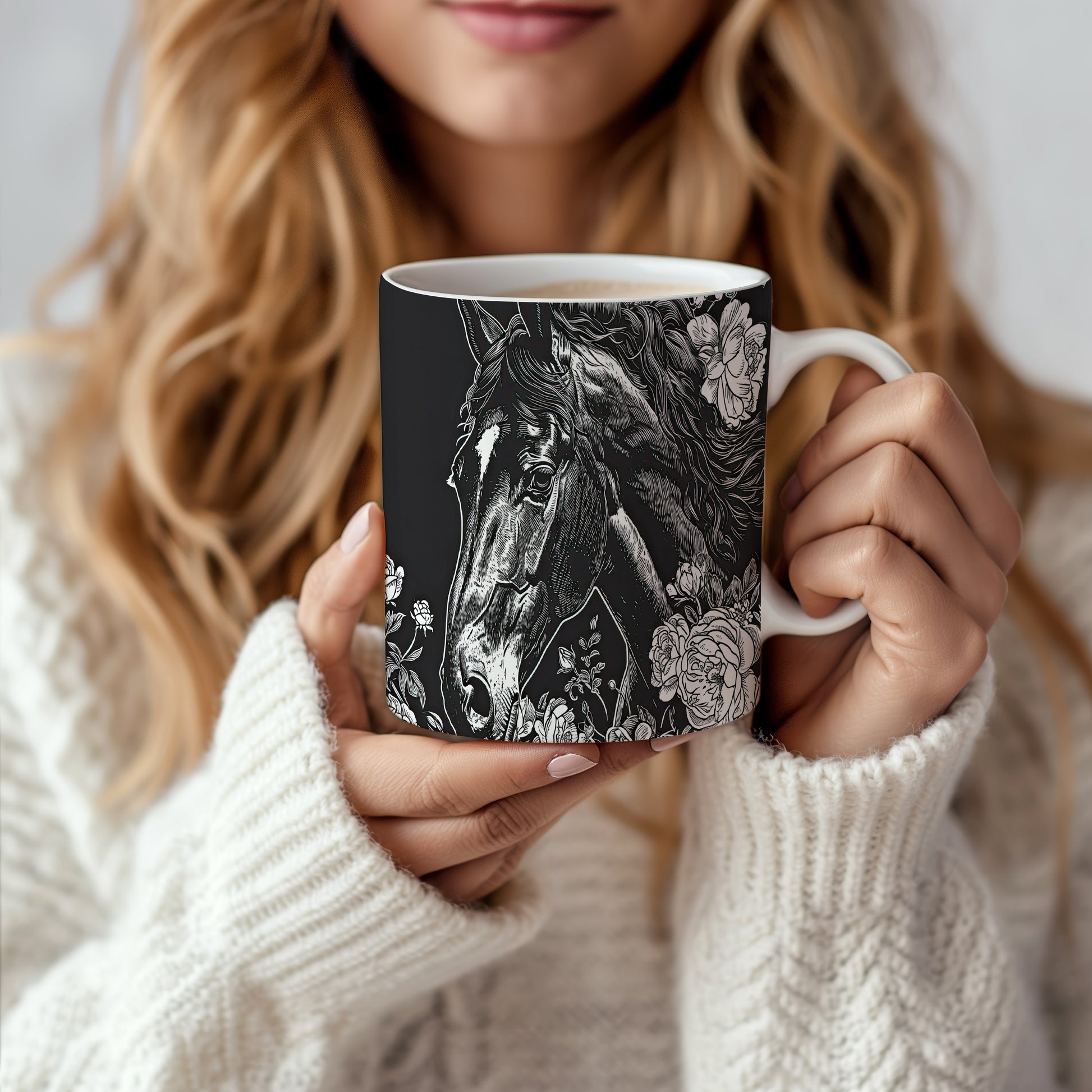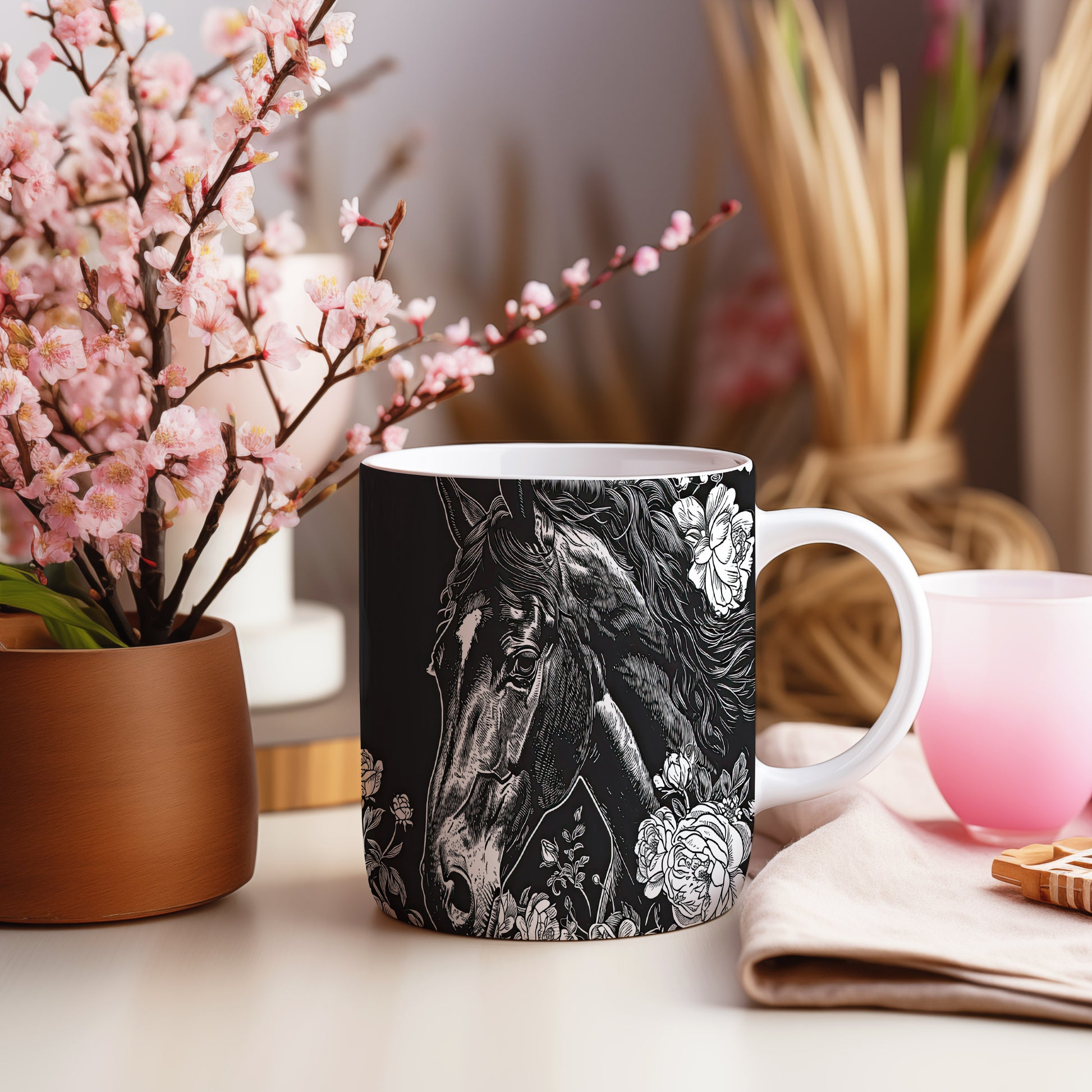 Tento hrnek s motivem koně a květin je ideální pro milovníky přírody a zvířat. Skvělý tip na dárek pro přátele nebo rodinu, kteří ocení originální design. Materiál: keramika. Objem: 330 ml. Vhodné do myčky i mikrovlnky. Užijte si svůj oblíbený nápoj s tímto stylovým hrnkem, který přináší radost do každého dne.