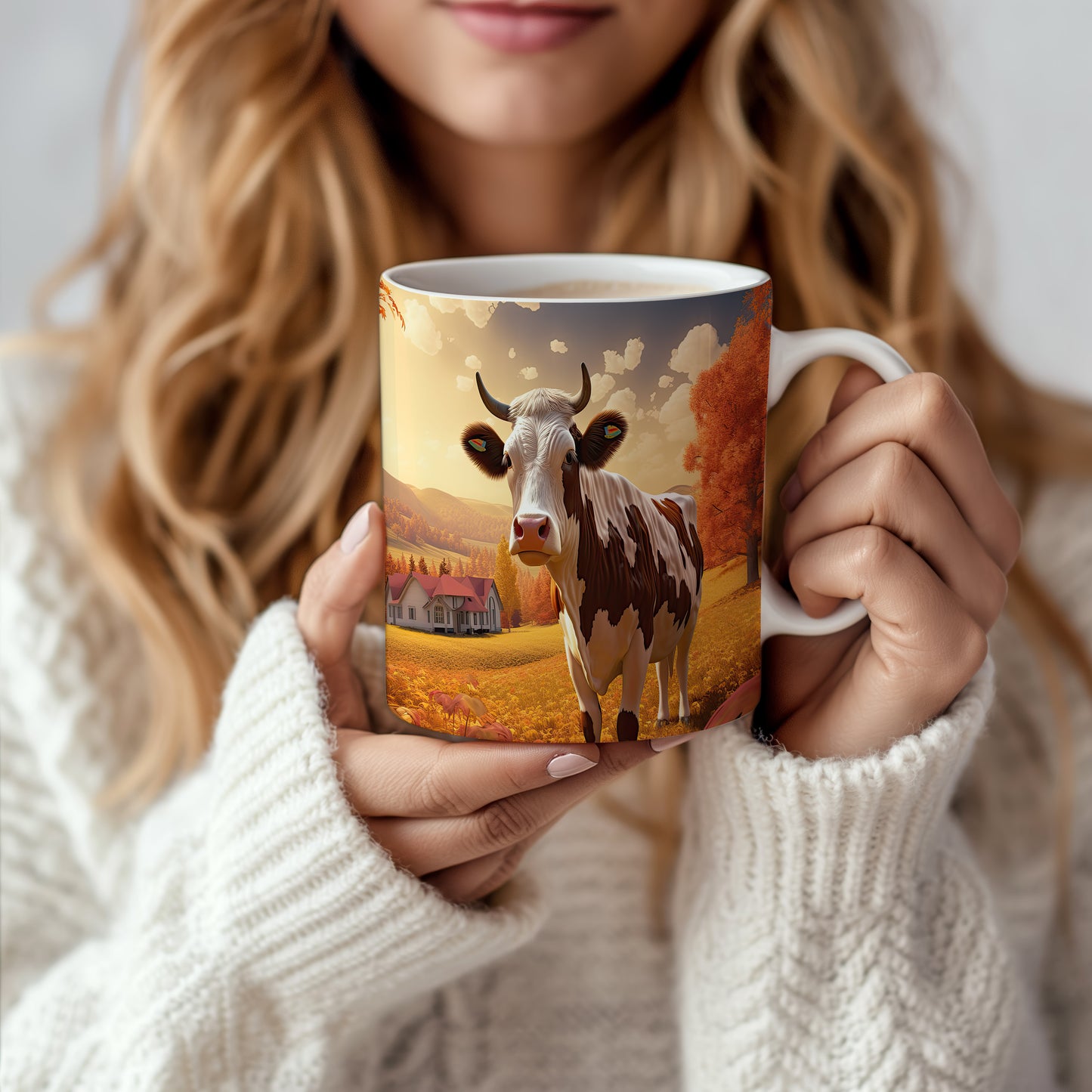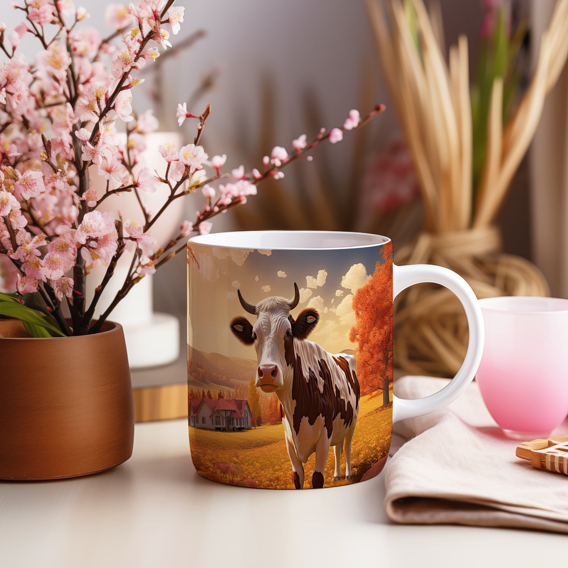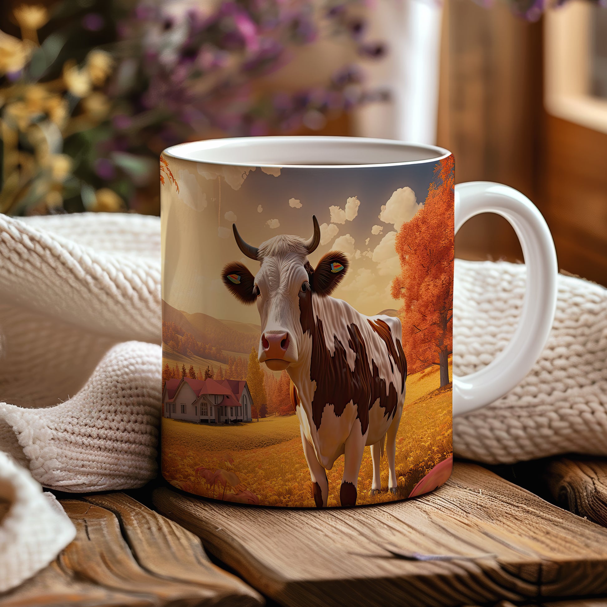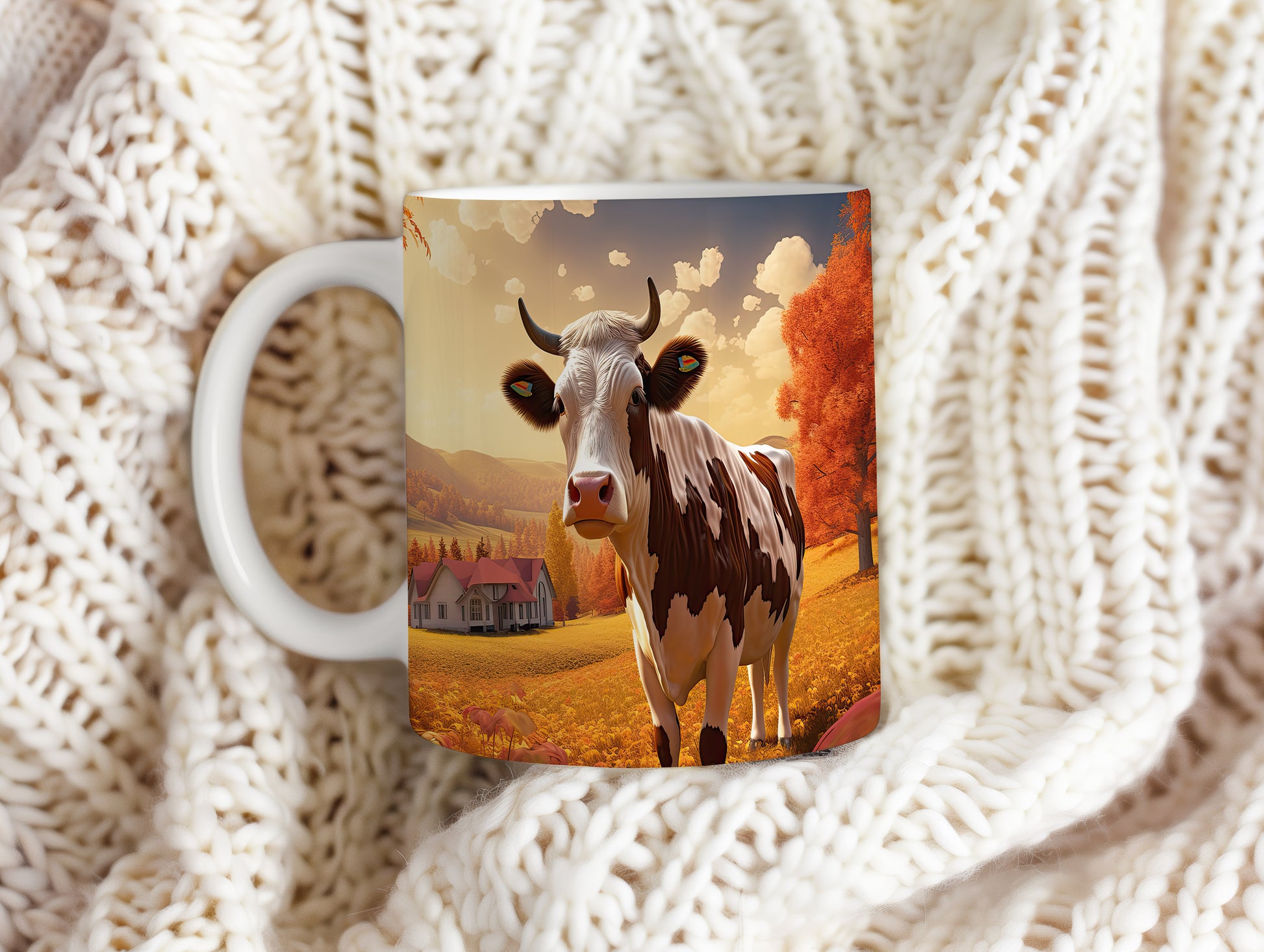 Hrnek s krávou v podzimní krajině