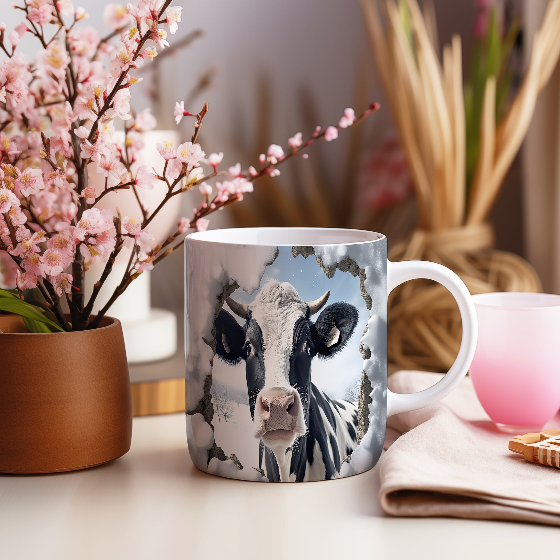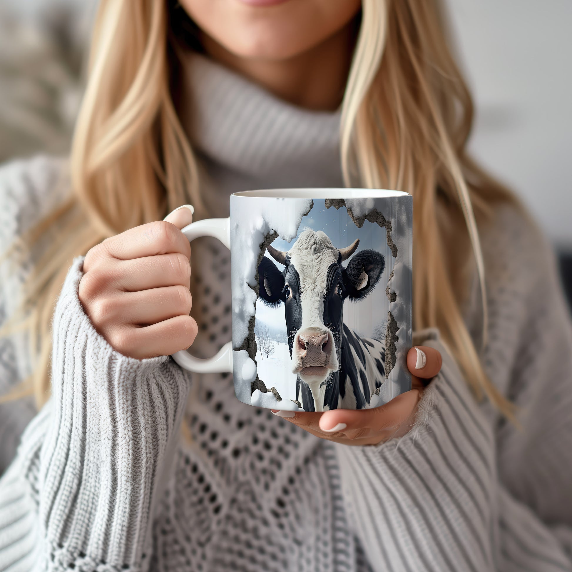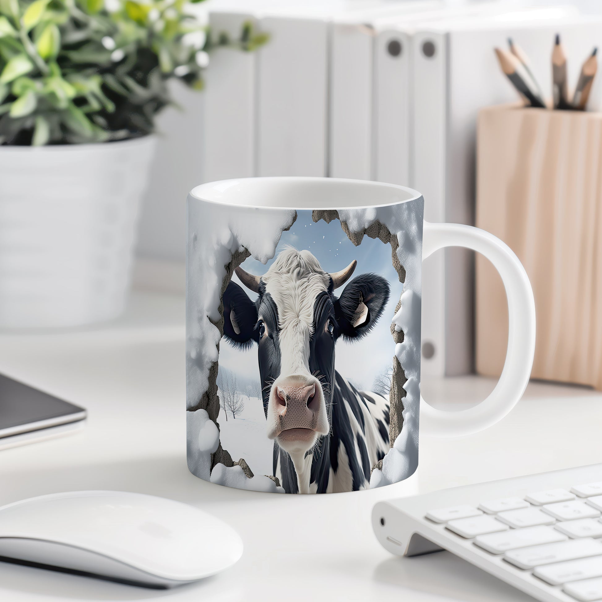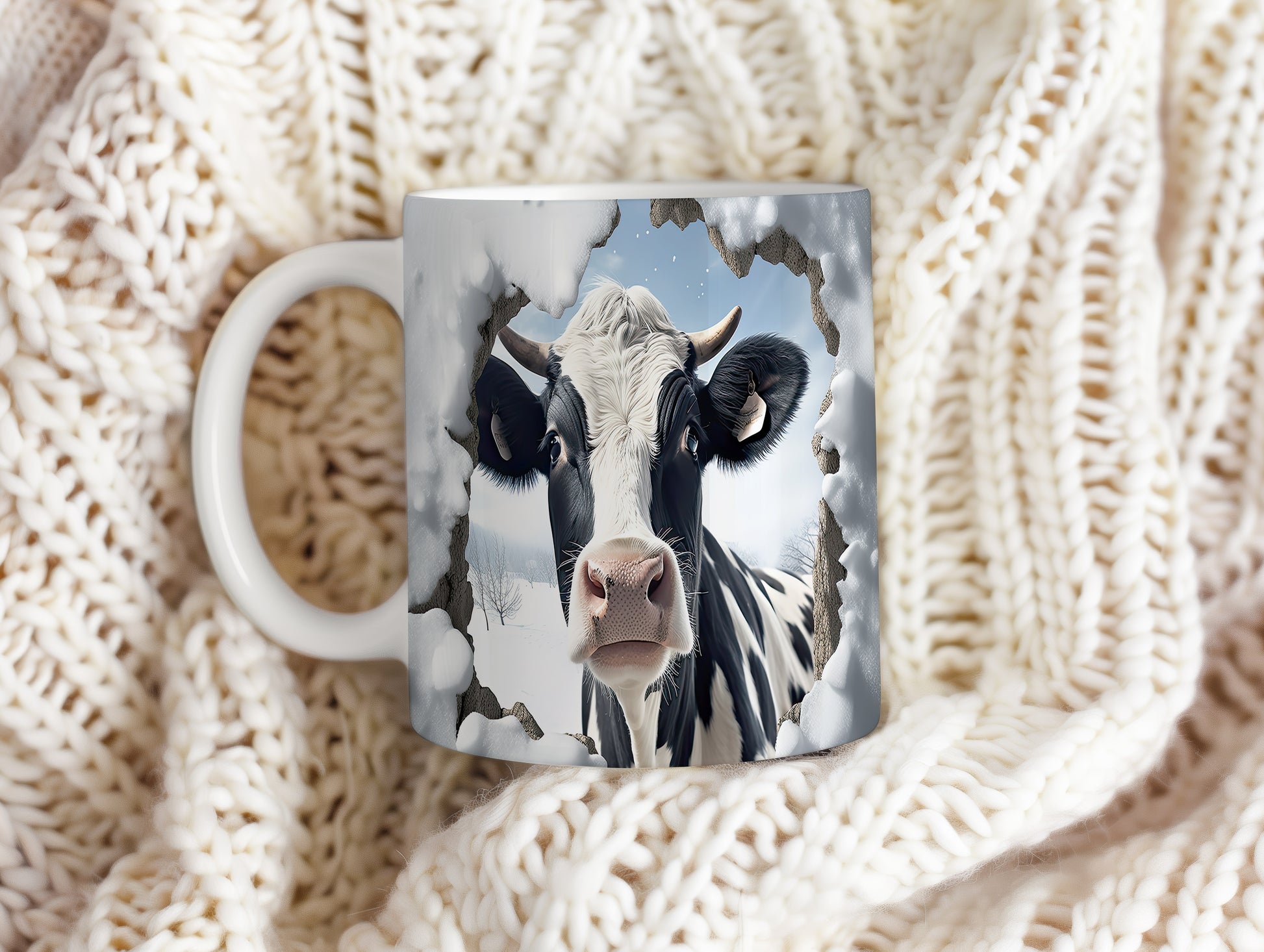 Tento originální hrnek zobrazuje realistickou krávu v zimní krajině, ideální pro milovníky zvířat a venkovského stylu. Skvělý tip na dárek pro přátele nebo rodinu, kteří ocení přírodu. Materiál: keramika. Objem: 330 ml. Vhodné do myčky i mikrovlnky. Používání tohoto hrnku přináší radost z každého doušku.