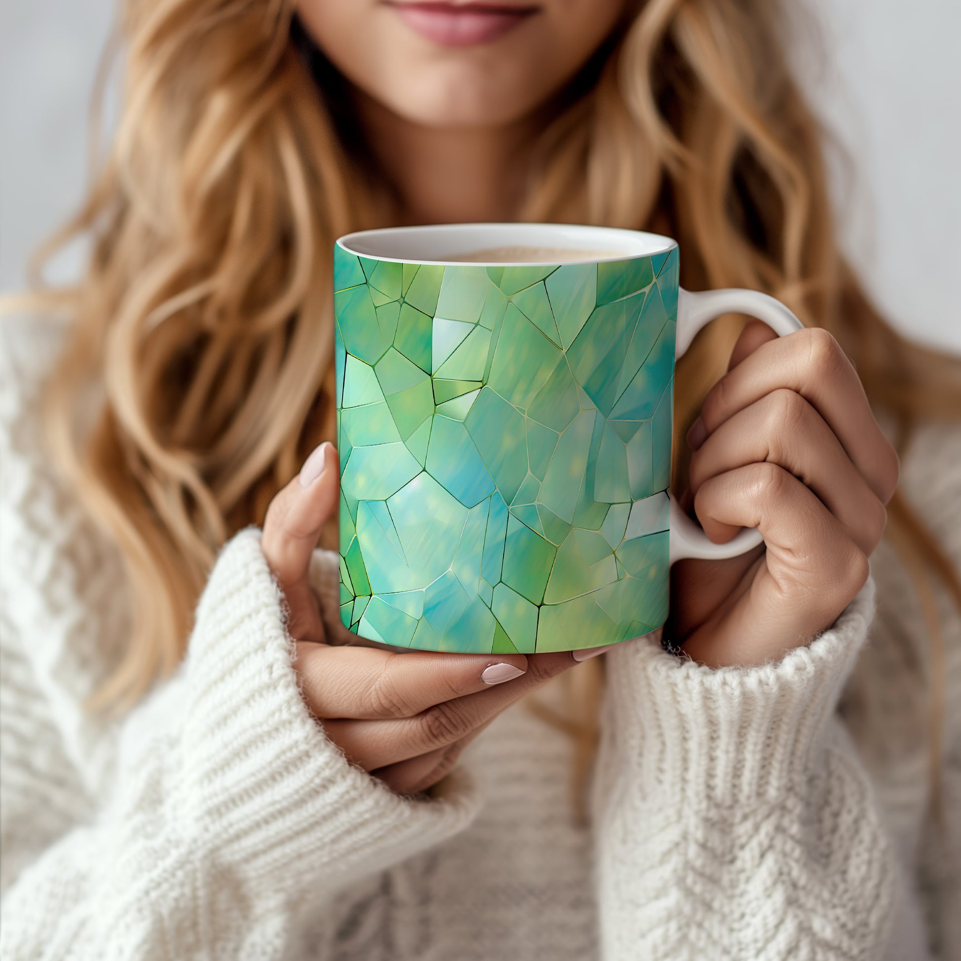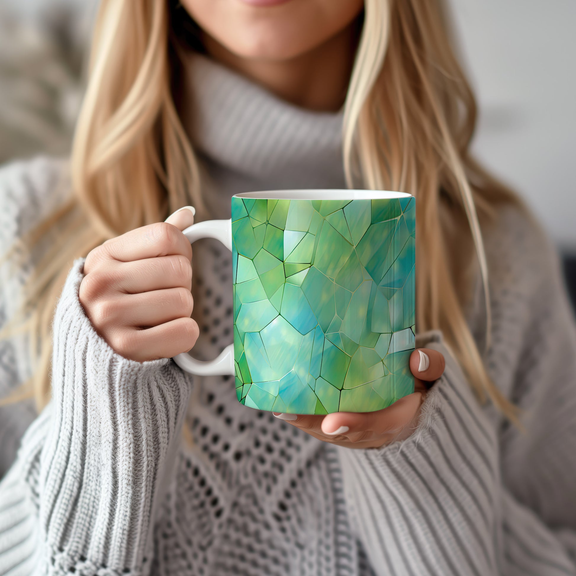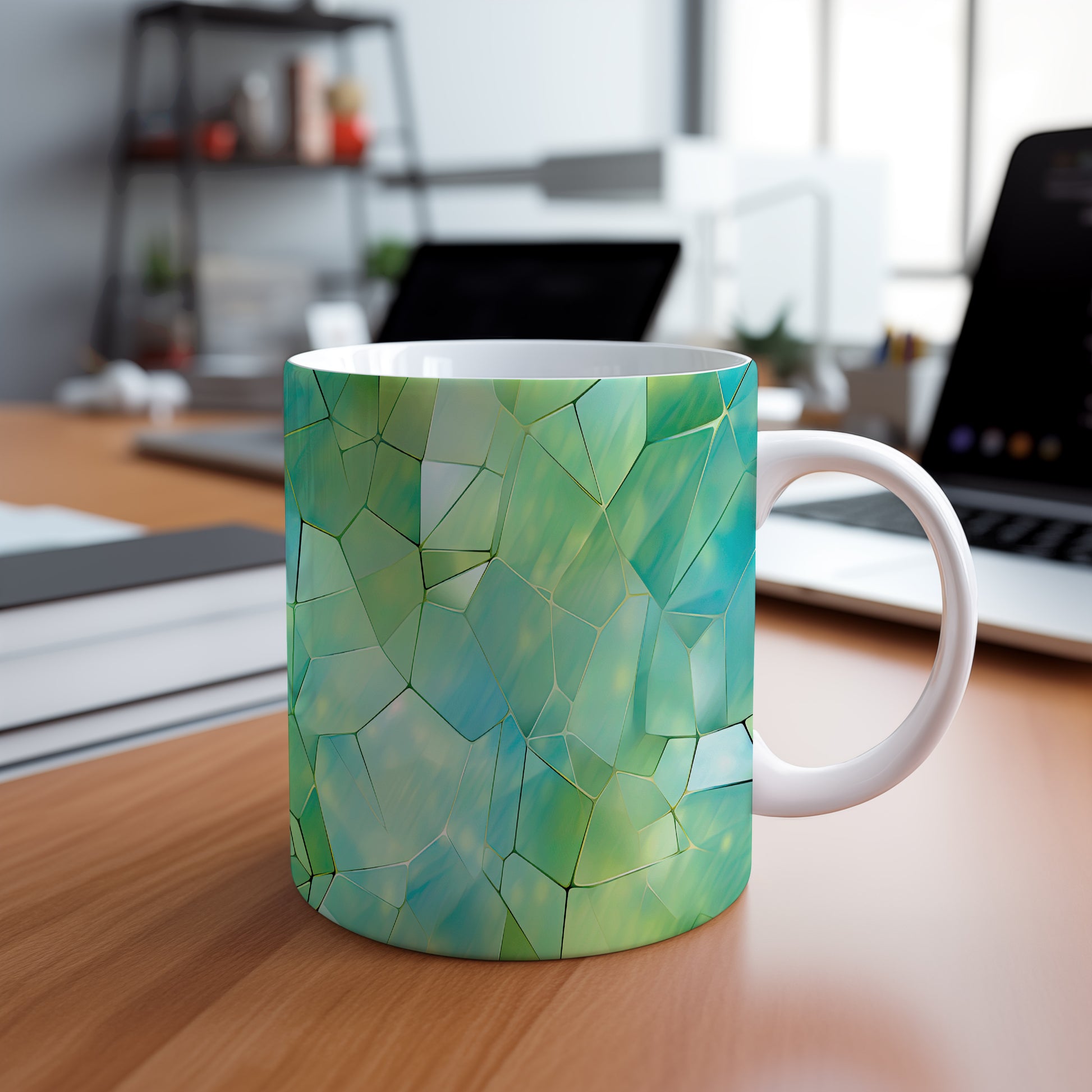 Tento hrnek s krystalickou mozaikou v zelených a modrých tónech přináší jedinečný design a styl. Je ideální pro milovníky originálního nádobí a skvělým dárkem pro přátele či rodinu. Materiál: keramika. Objem: 330 ml. Vhodné do myčky i mikrovlnky. Díky svému jedinečnému vzhledu se stane ozdobou každého stolu.