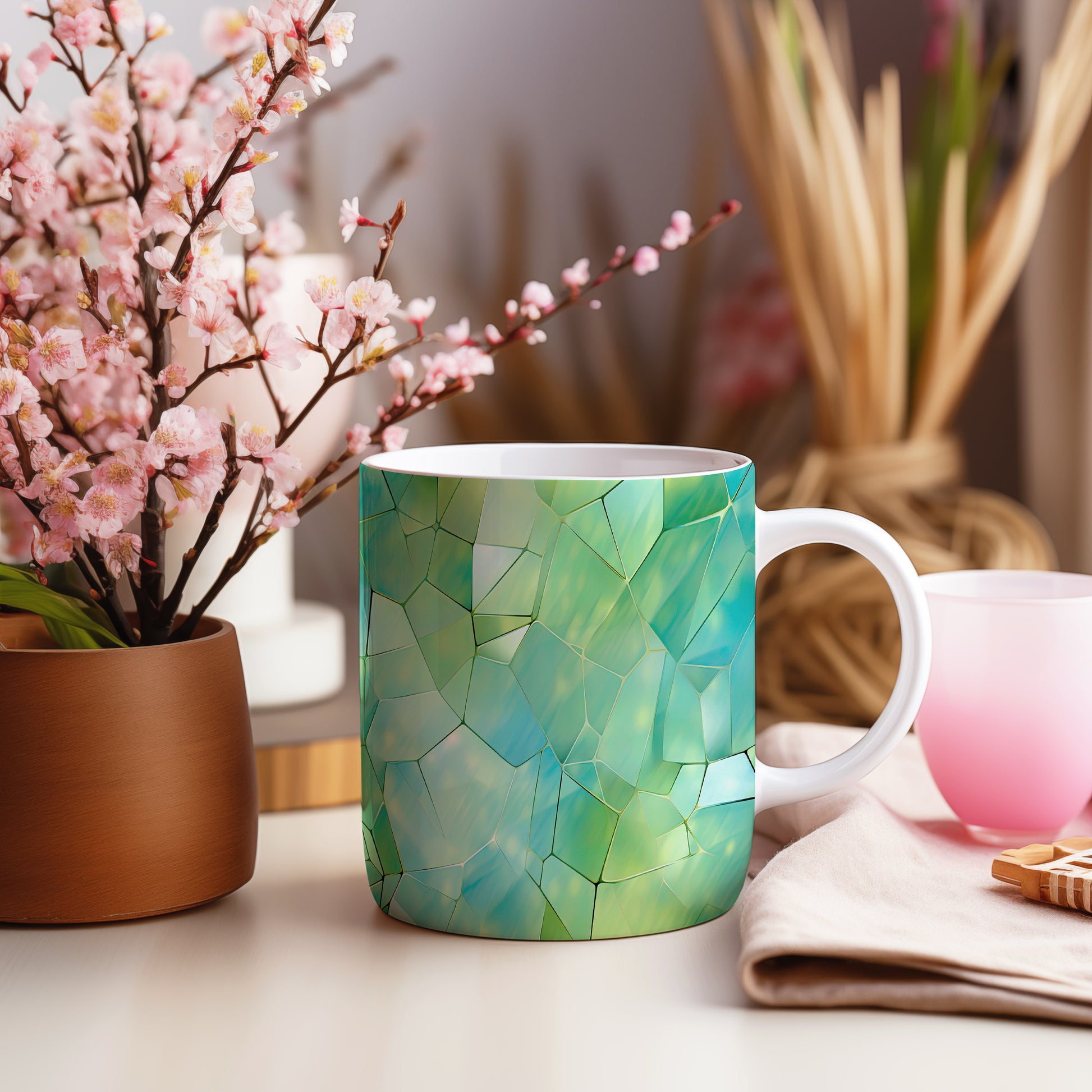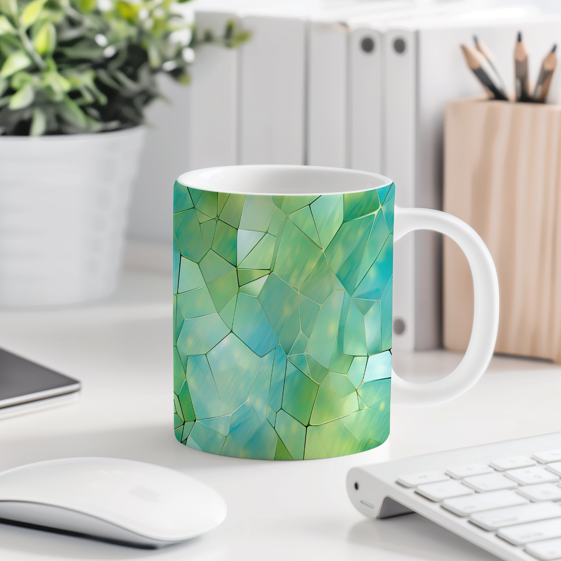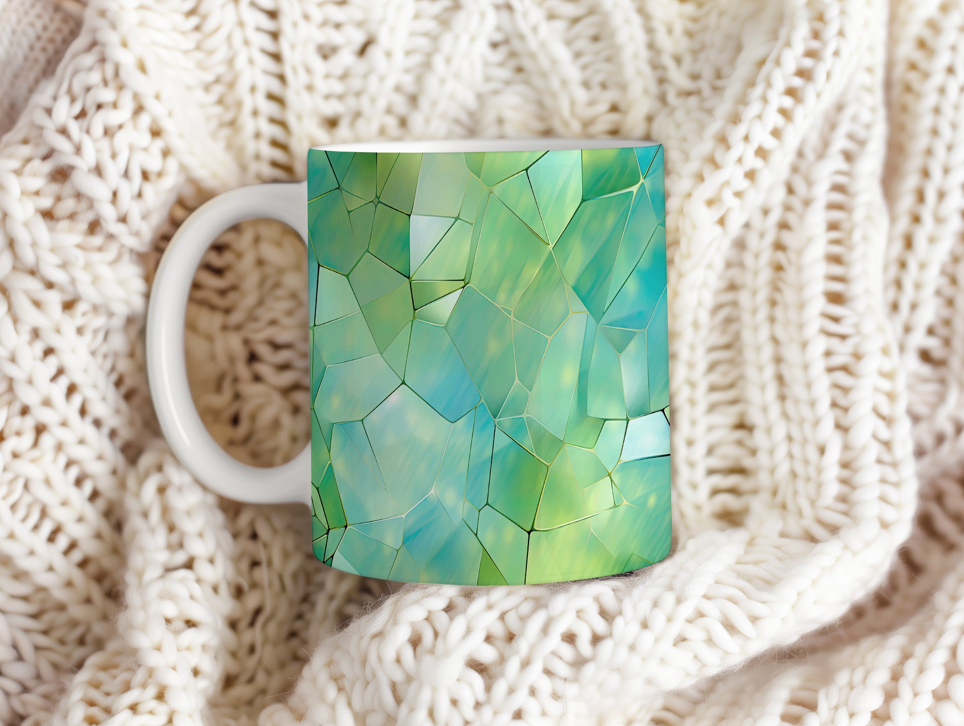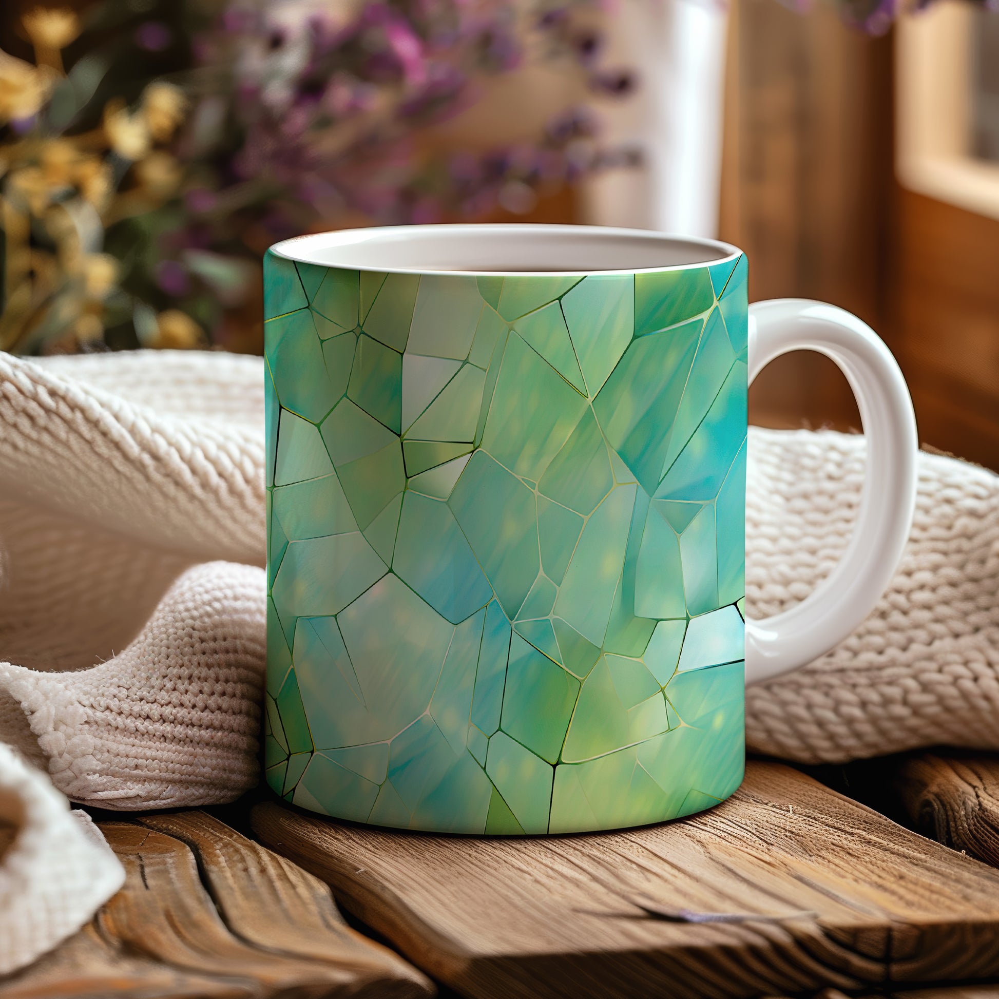 Tento hrnek s krystalickou mozaikou v zelených a modrých tónech přináší jedinečný design a styl. Je ideální pro milovníky originálního nádobí a skvělým dárkem pro přátele či rodinu. Materiál: keramika. Objem: 330 ml. Vhodné do myčky i mikrovlnky. Díky svému jedinečnému vzhledu se stane ozdobou každého stolu.