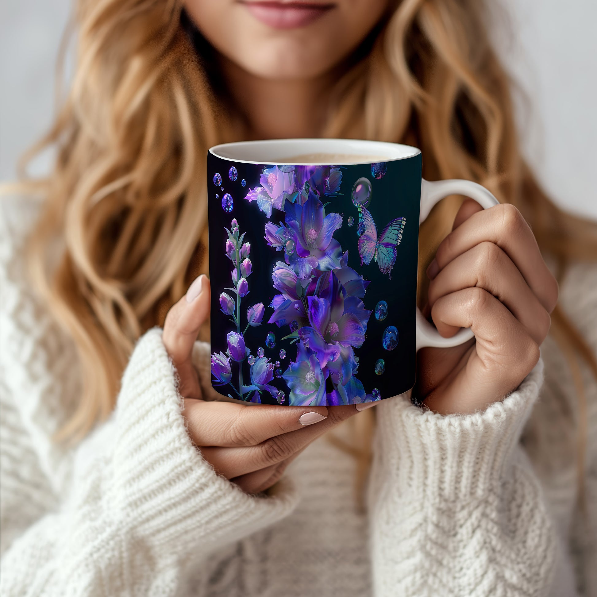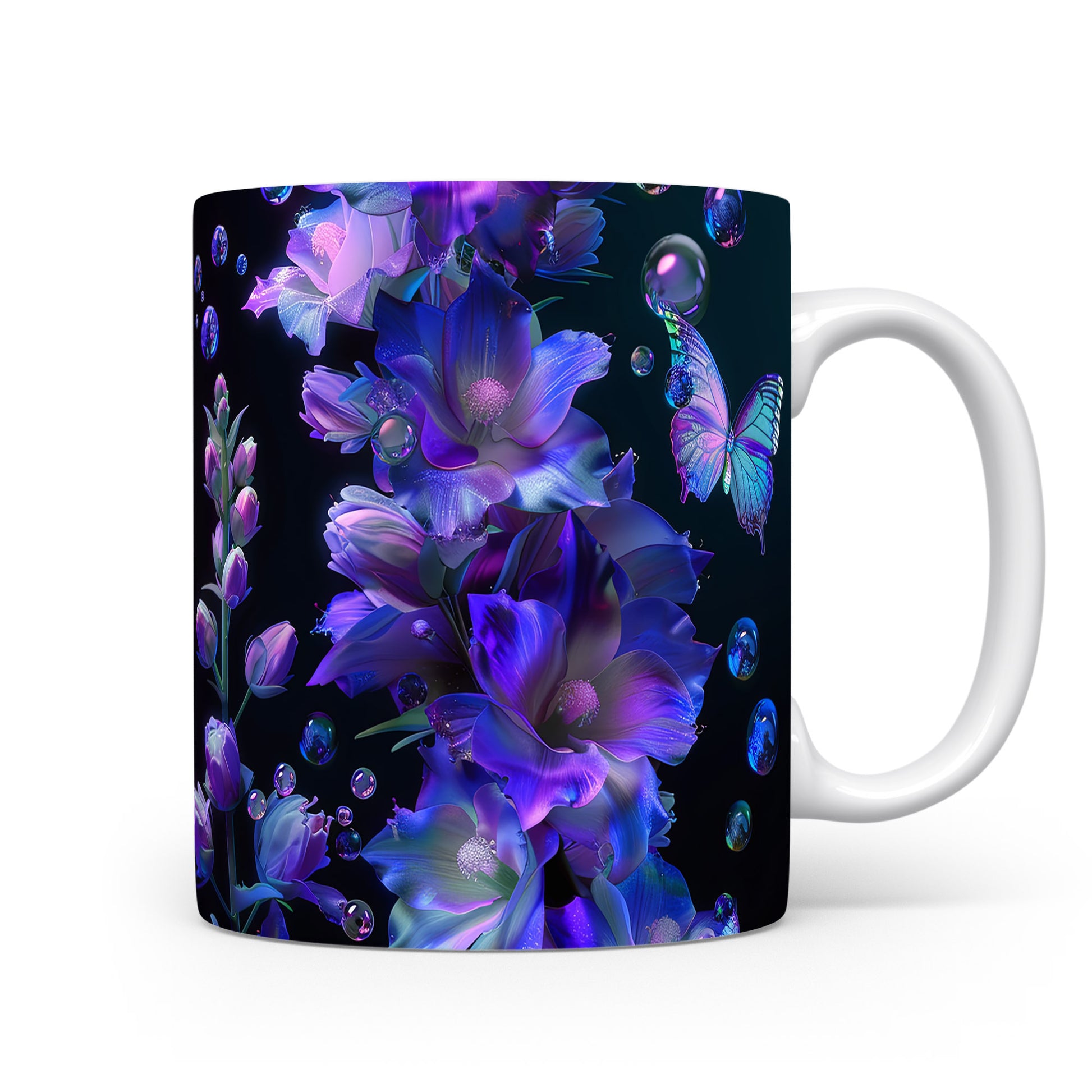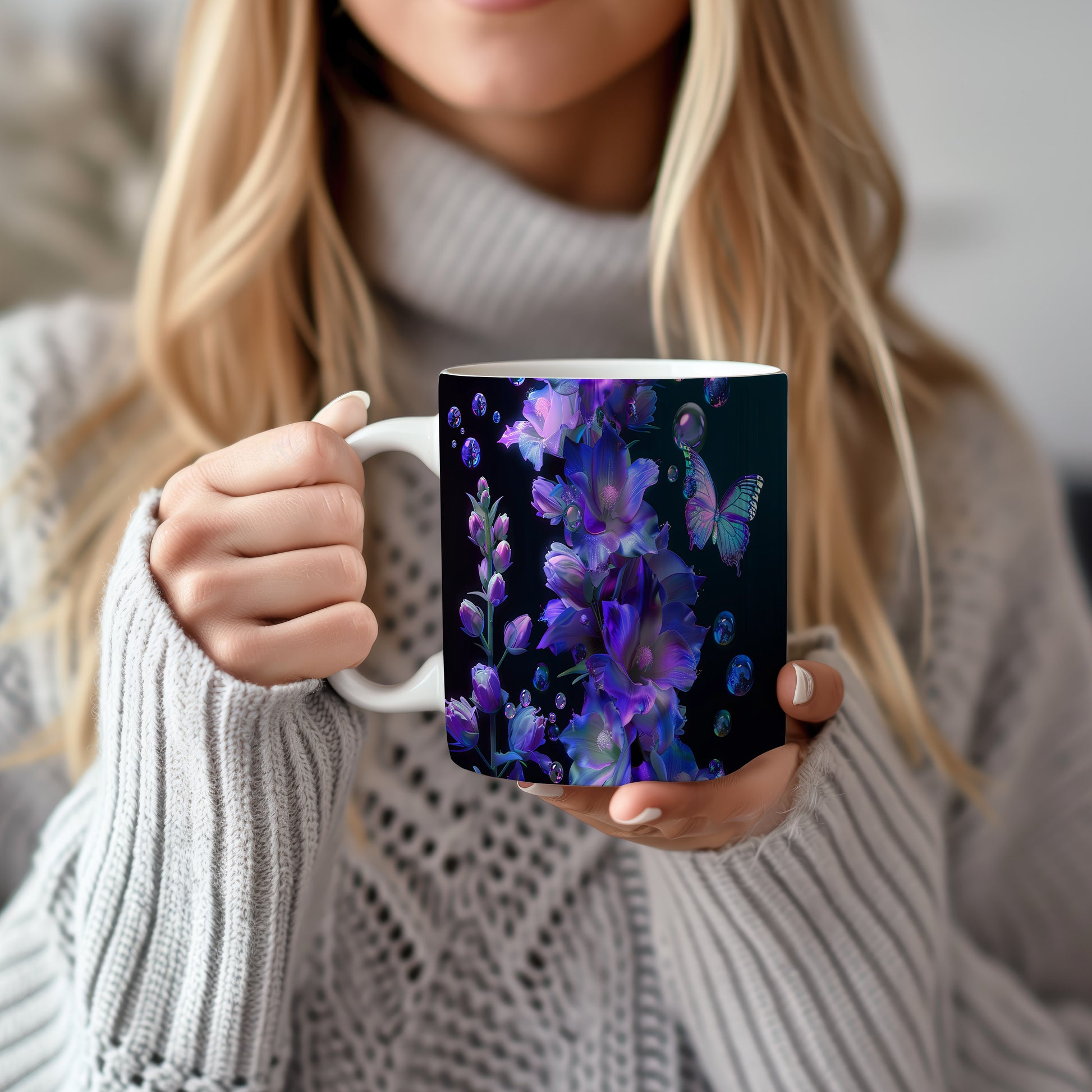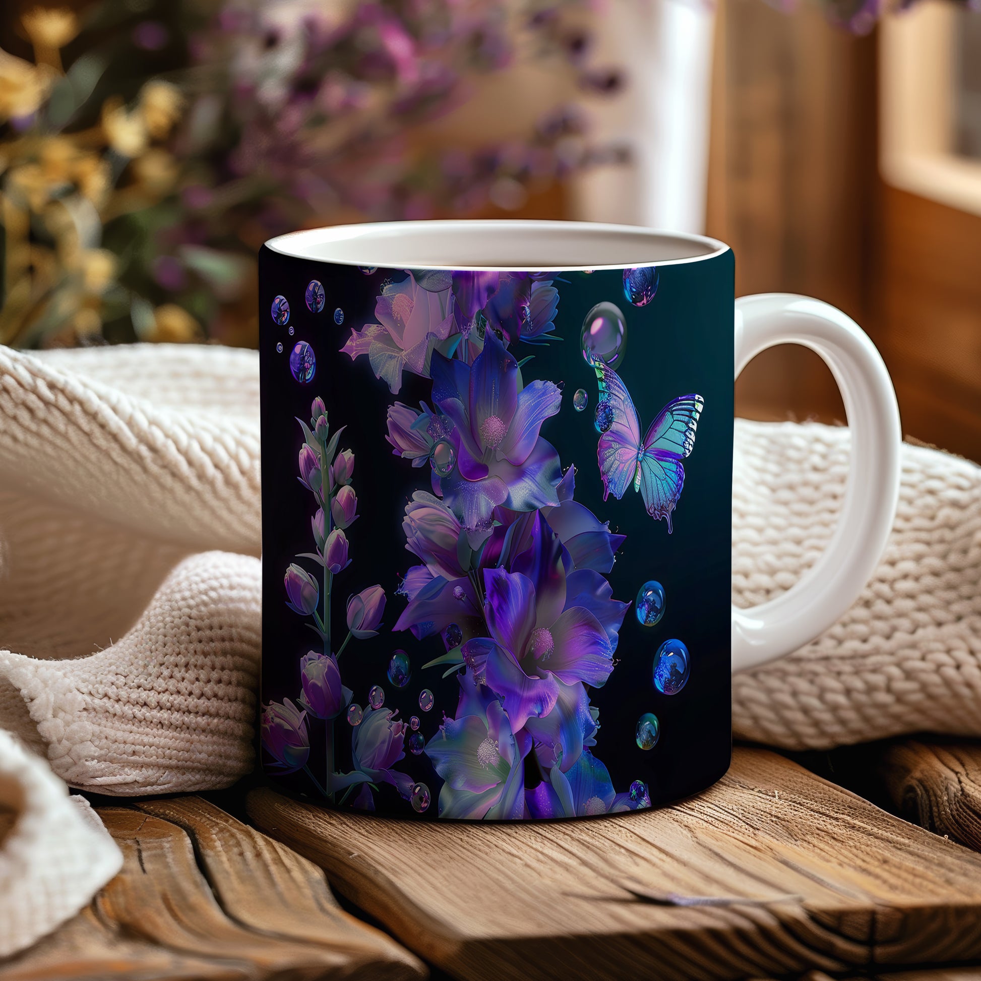 Tento hrnek zdobí elegantní květiny v odstínech fialové a modré, doplněné krásným motýlem. Je ideální pro milovníky přírody a skvělým dárkem pro každého, kdo ocení jemný design. Materiál: keramika. Objem: 330 ml. Vhodné do myčky i mikrovlnky. Používání tohoto hrnku přináší radost z každého doušku.