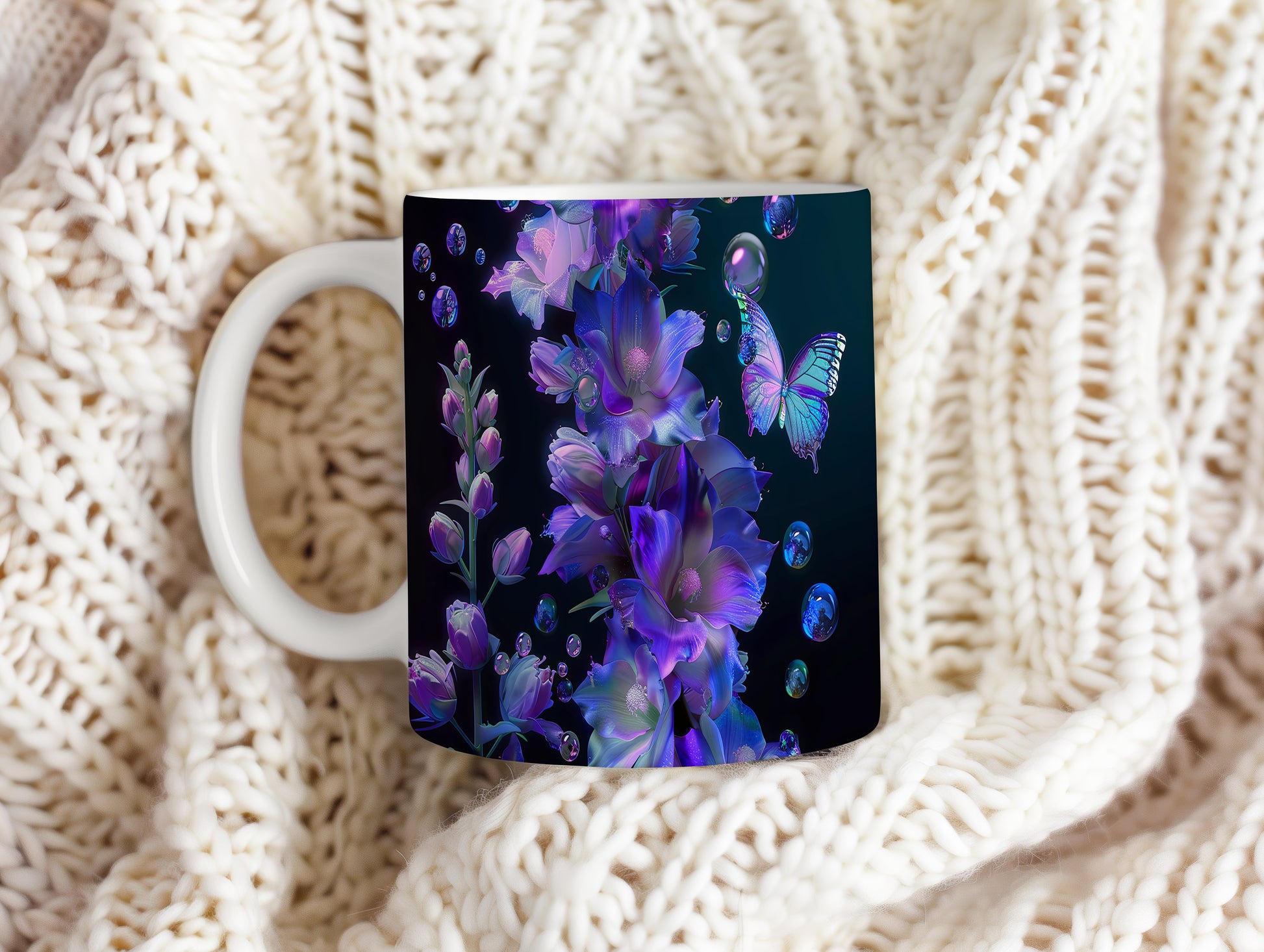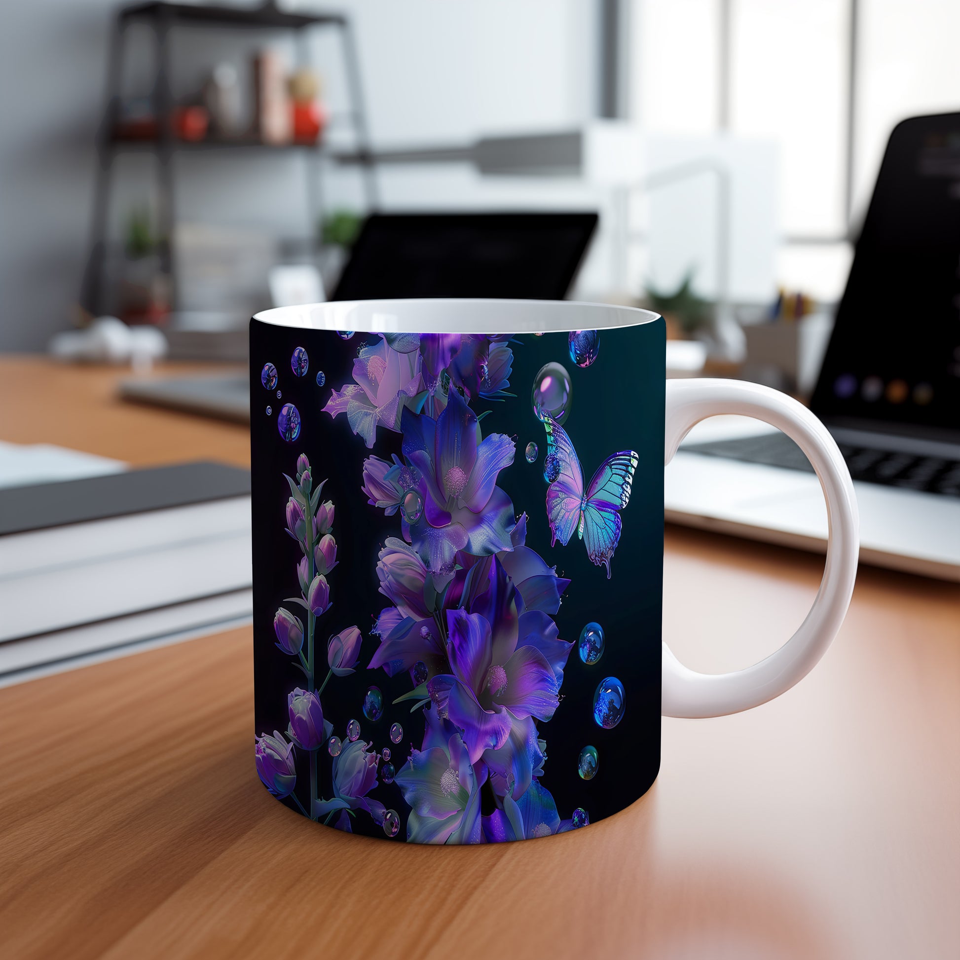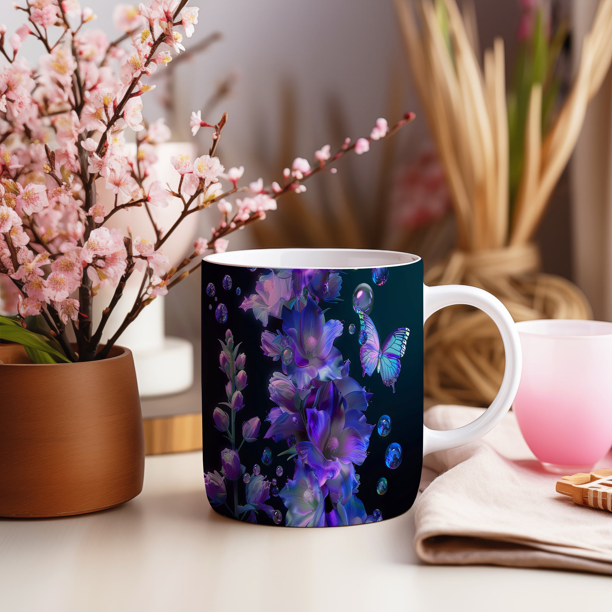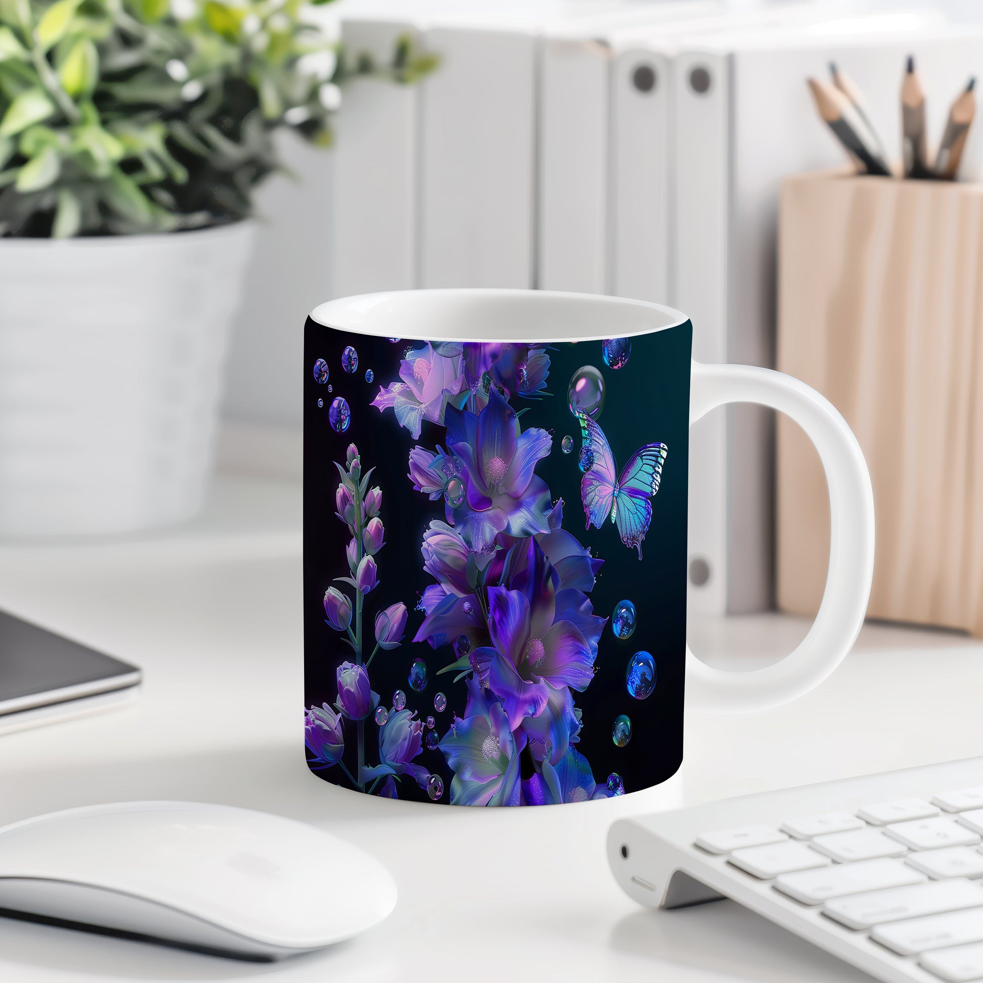 Tento hrnek zdobí elegantní květiny v odstínech fialové a modré, doplněné krásným motýlem. Je ideální pro milovníky přírody a skvělým dárkem pro každého, kdo ocení jemný design. Materiál: keramika. Objem: 330 ml. Vhodné do myčky i mikrovlnky. Používání tohoto hrnku přináší radost z každého doušku.