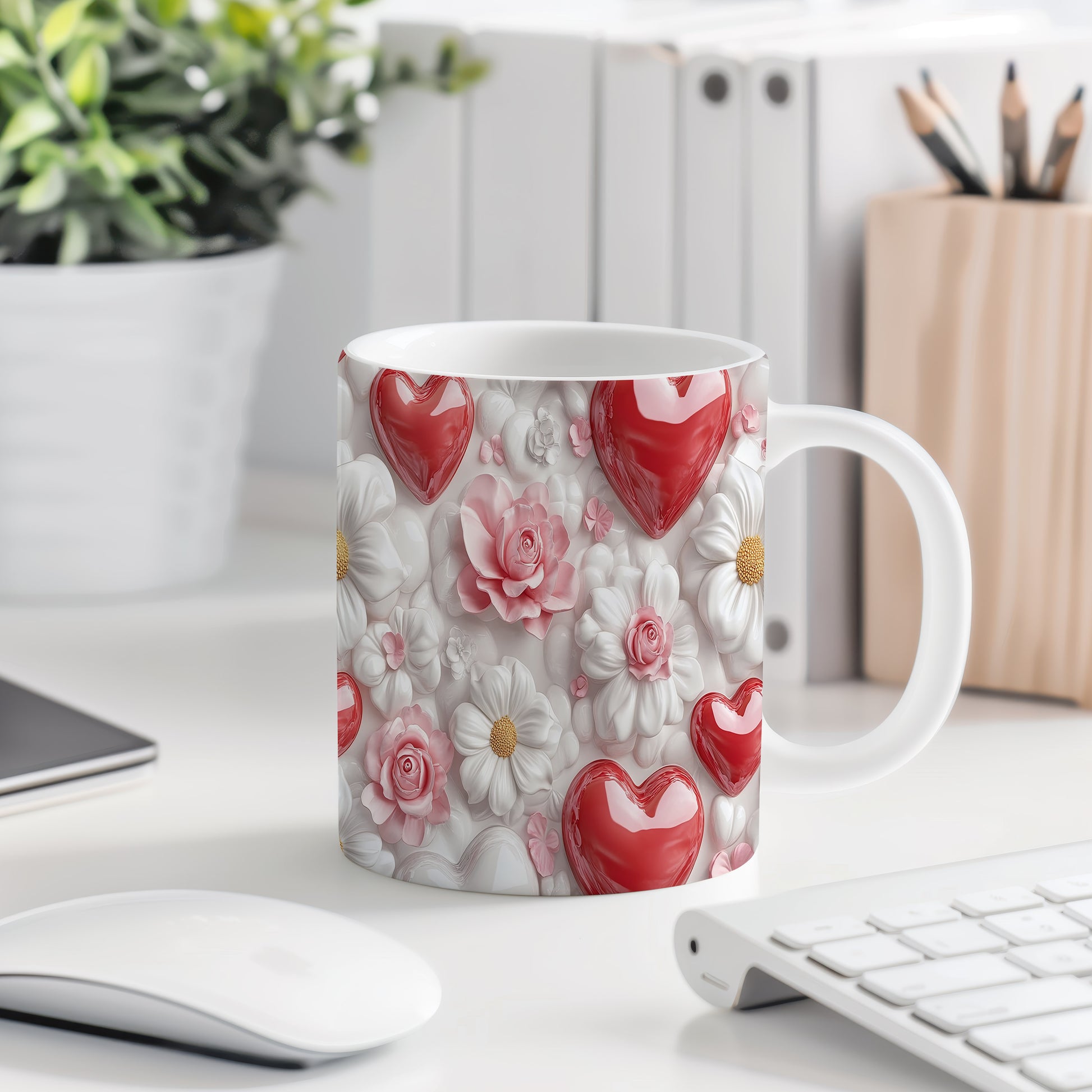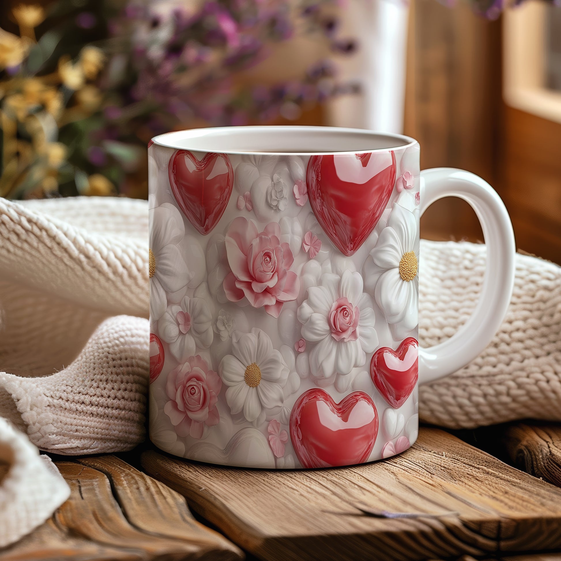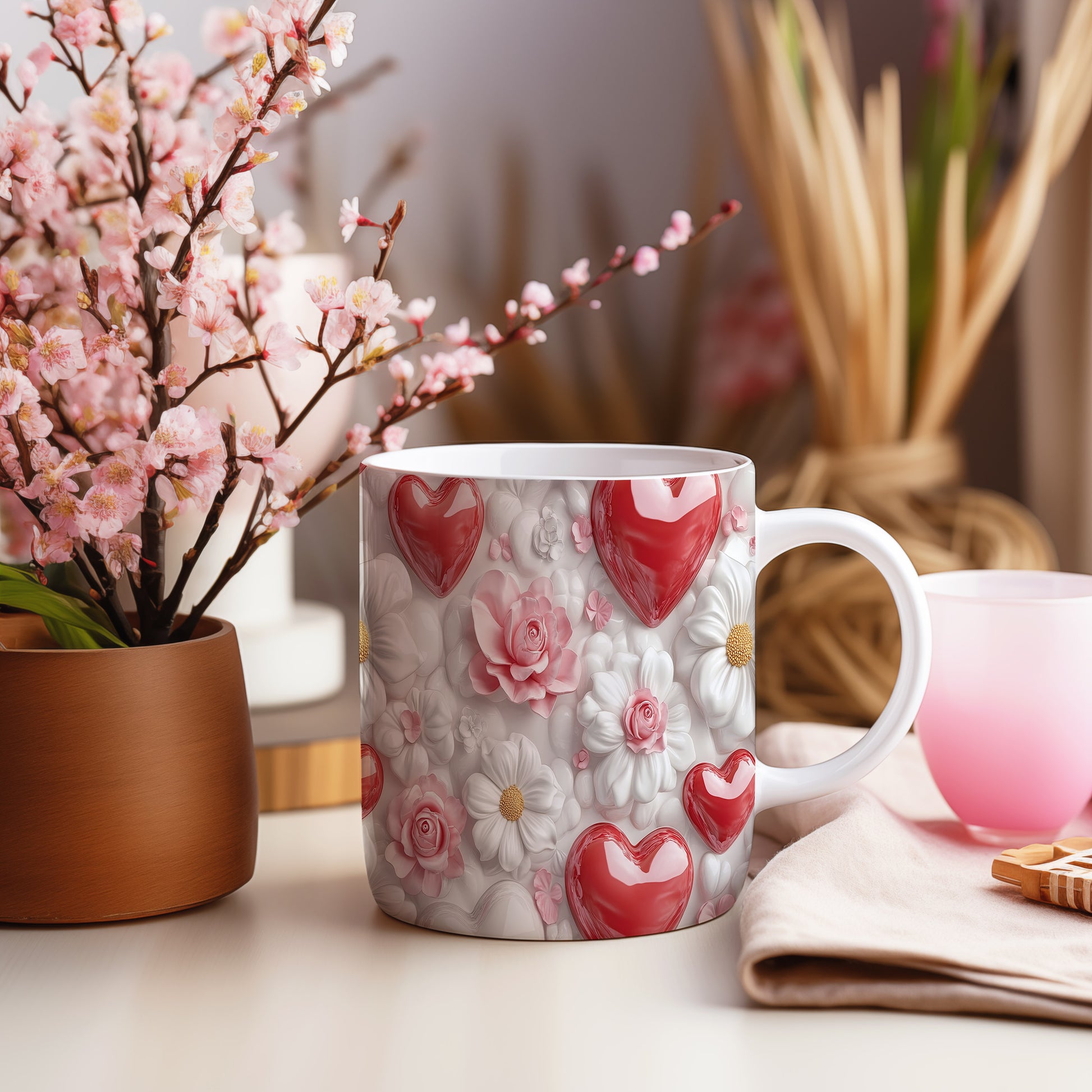 Hrnek s květinami a srdci