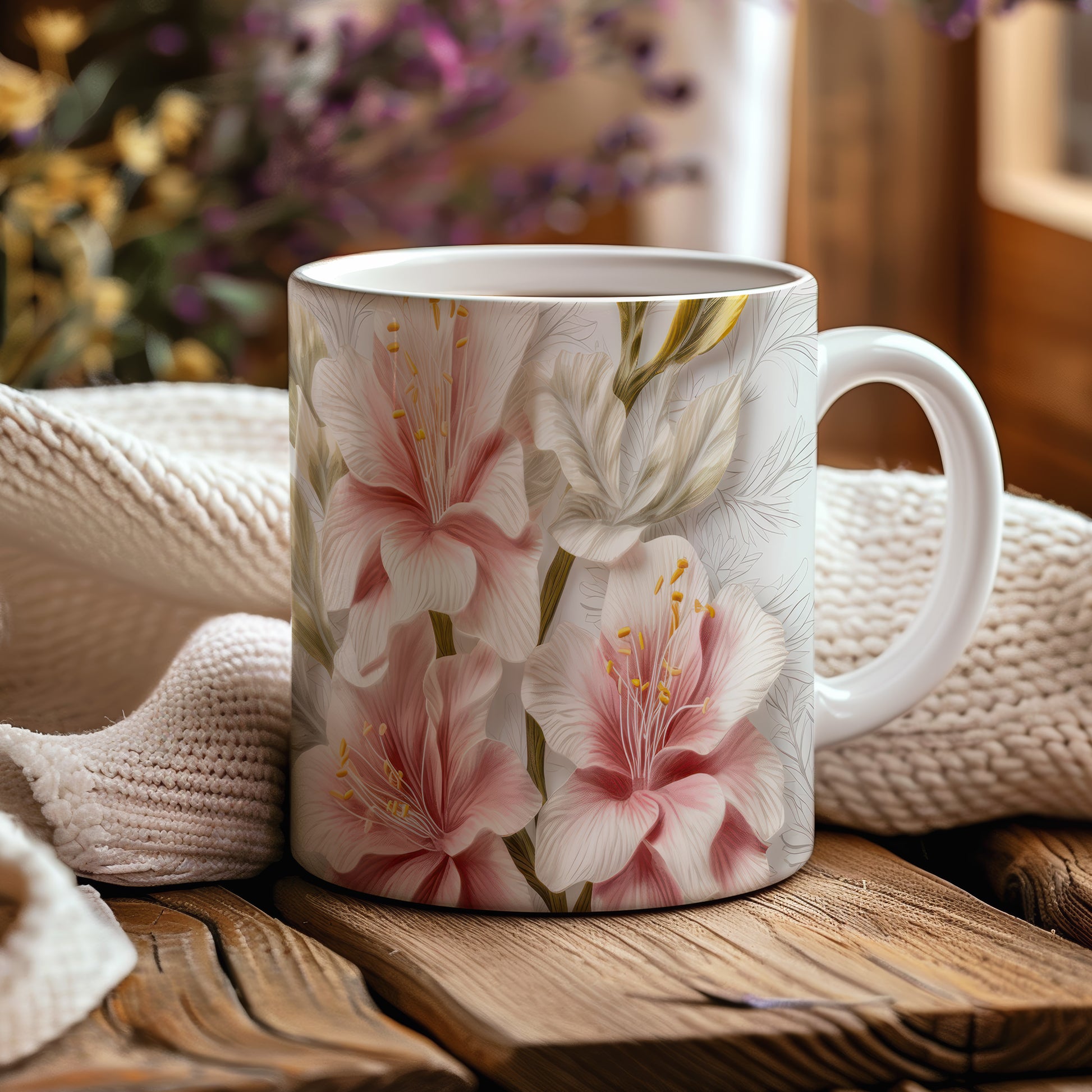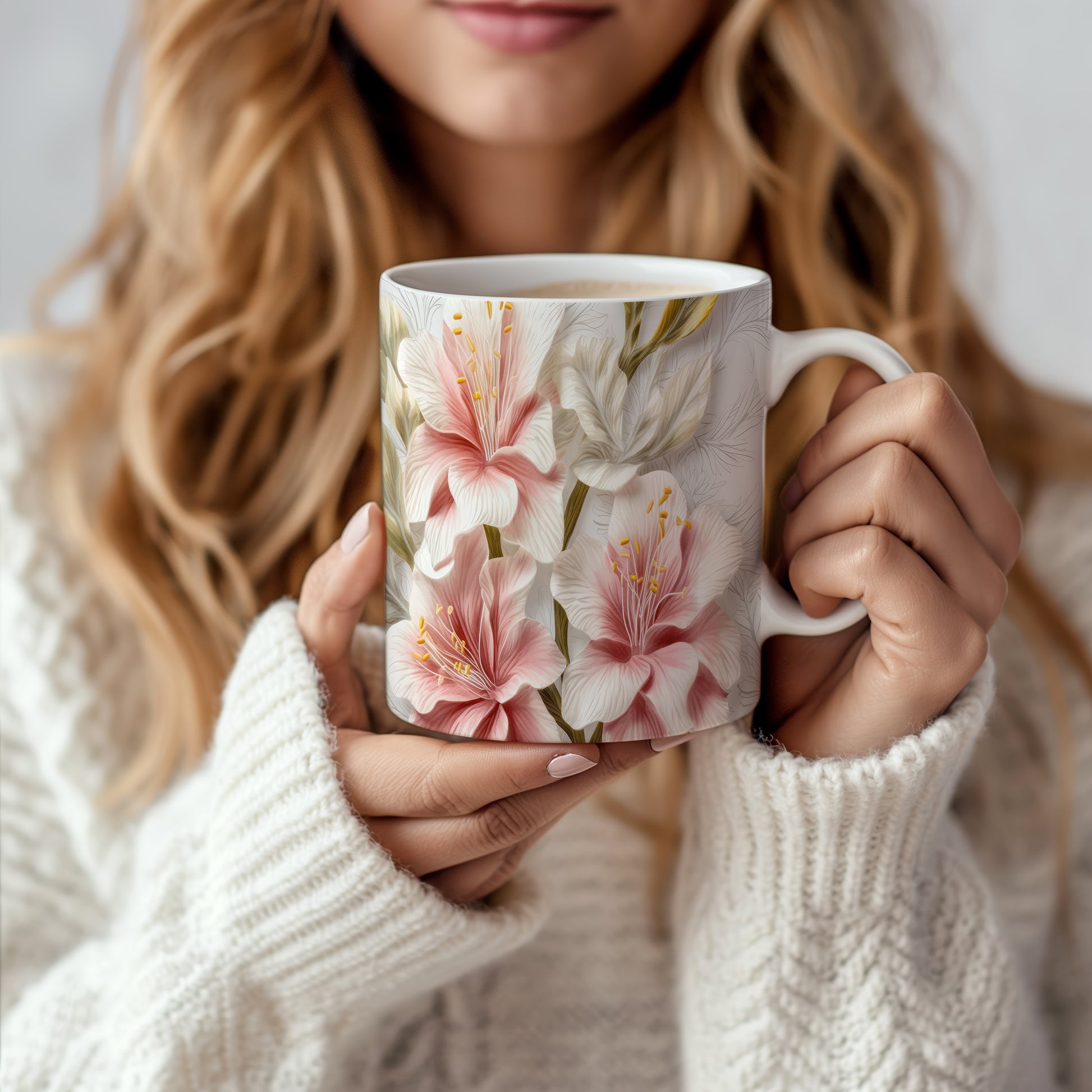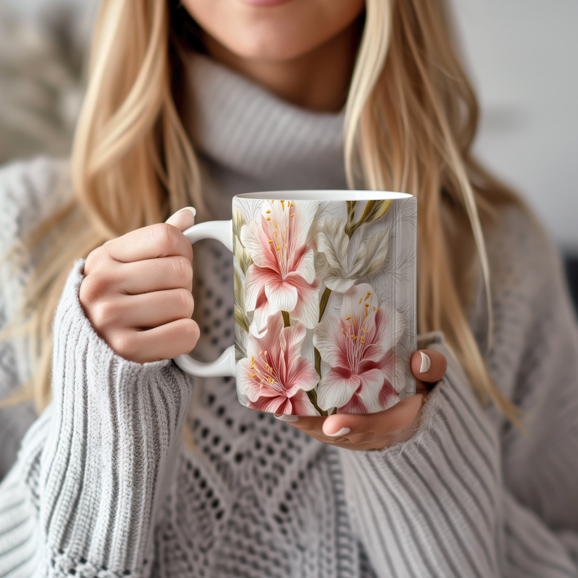 Hrnek s květinami v jemných růžových tónech a elegantním stylem