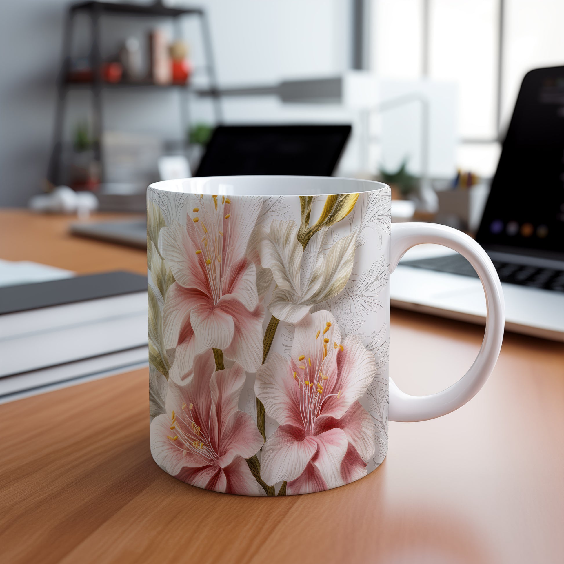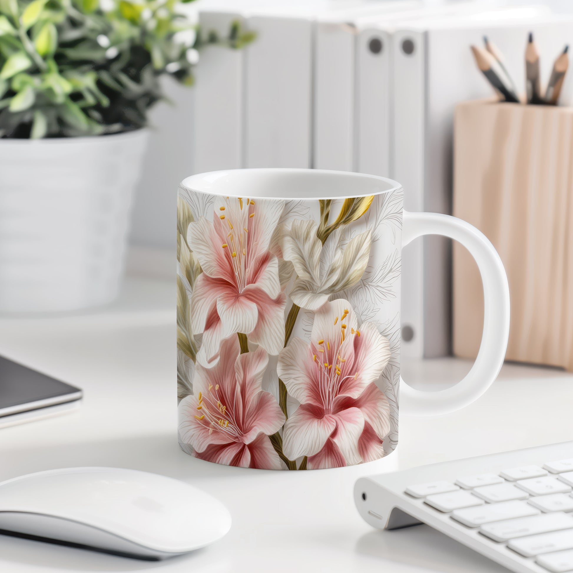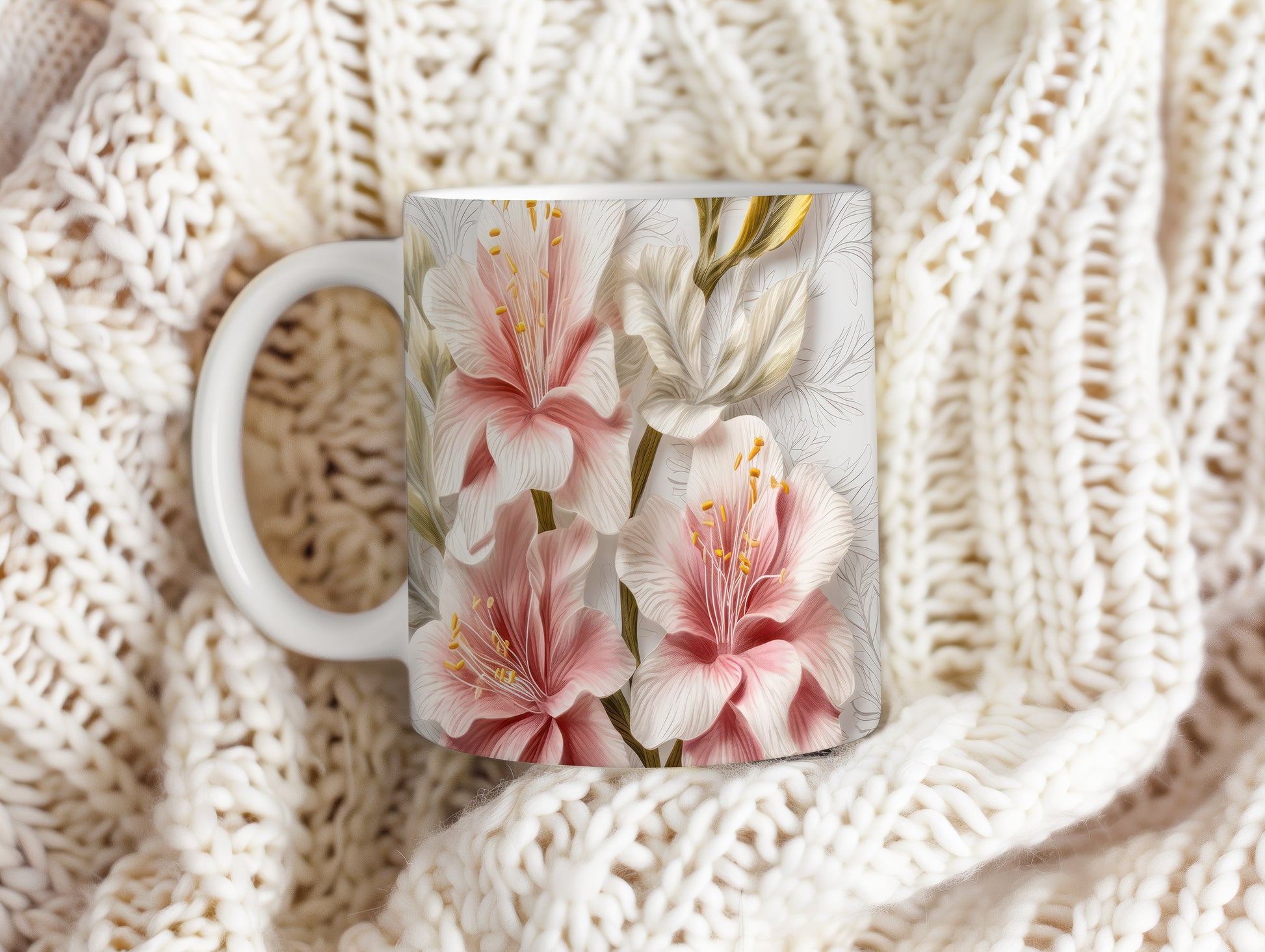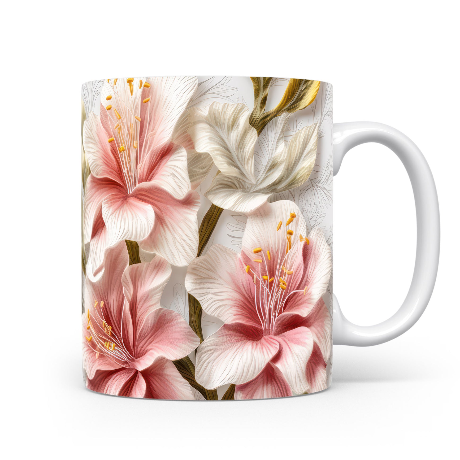Hrnek s květinami v jemných růžových tónech a elegantním stylem