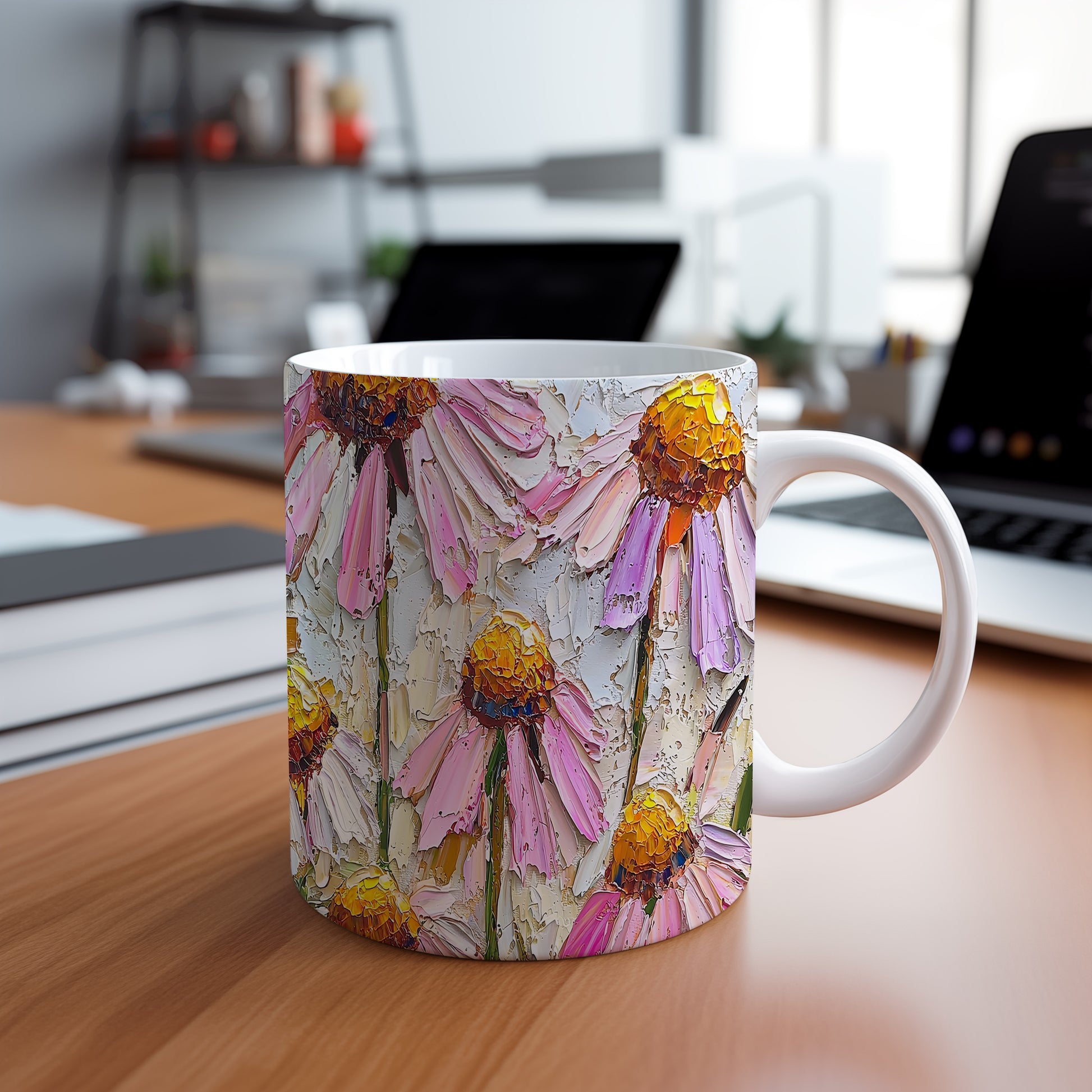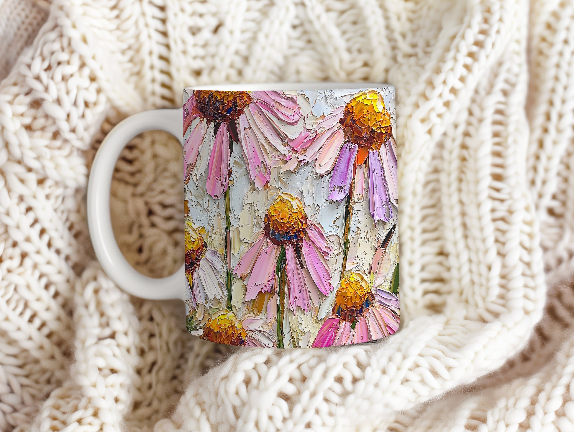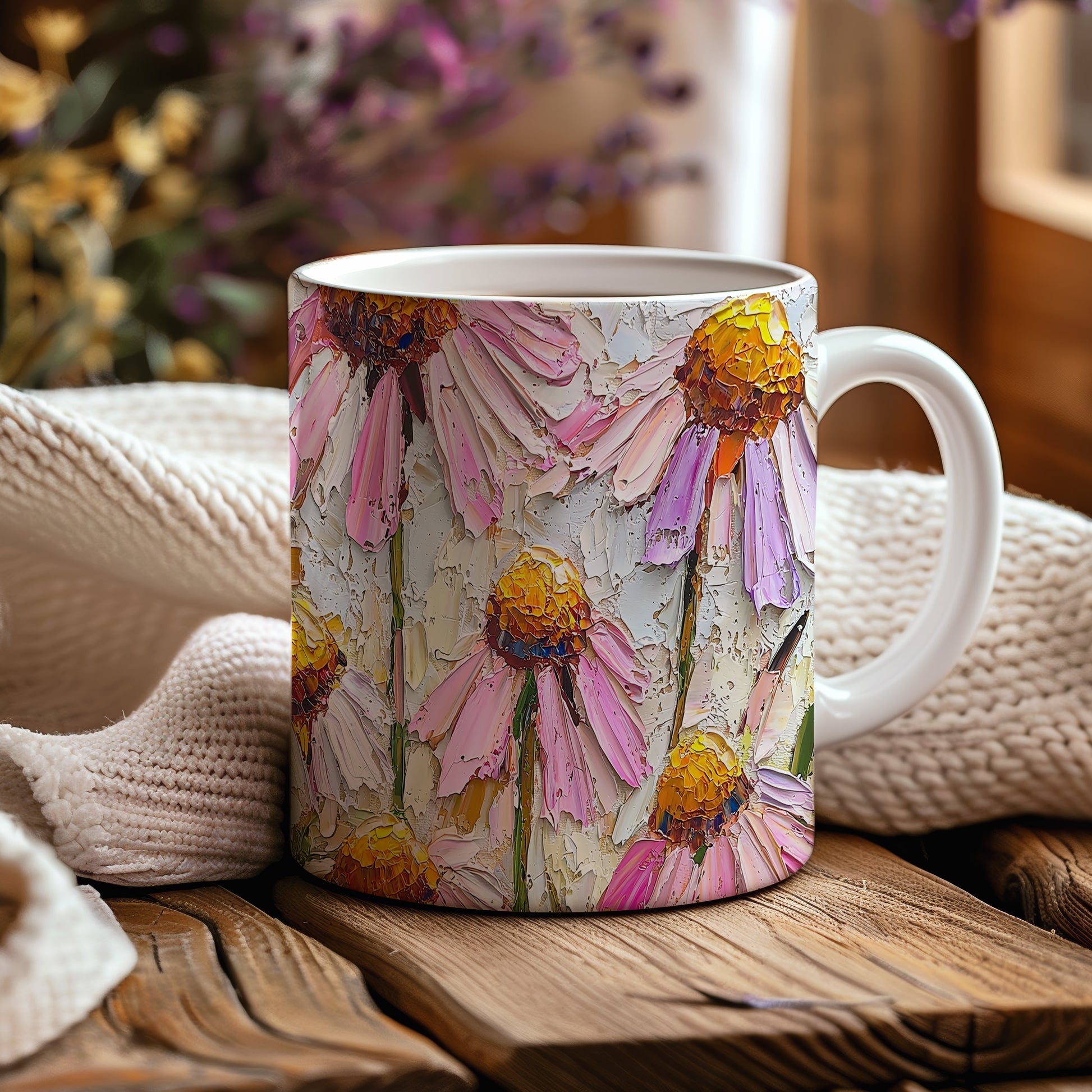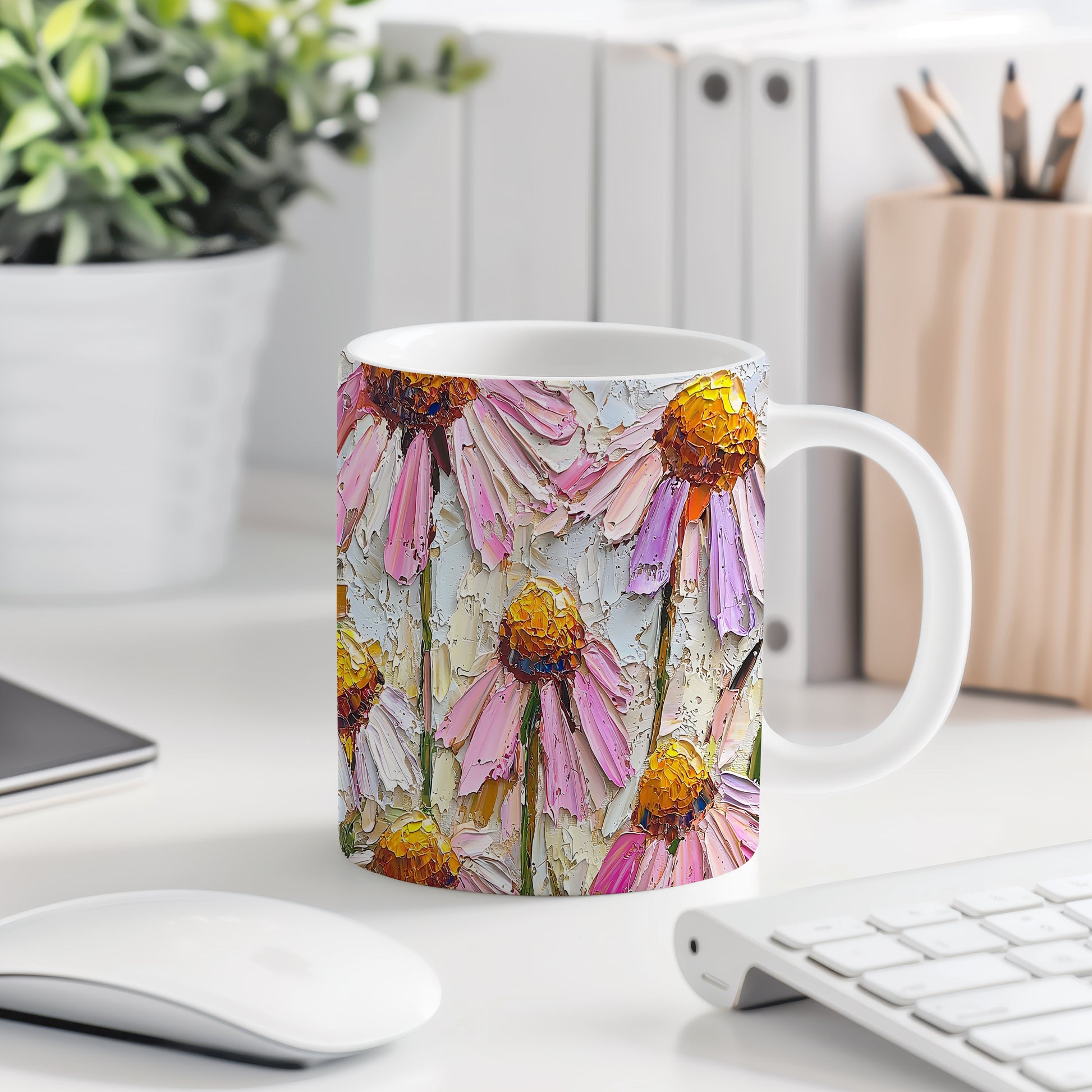 Hrnek s květinami v pastelových tónech a roztomilým stylem