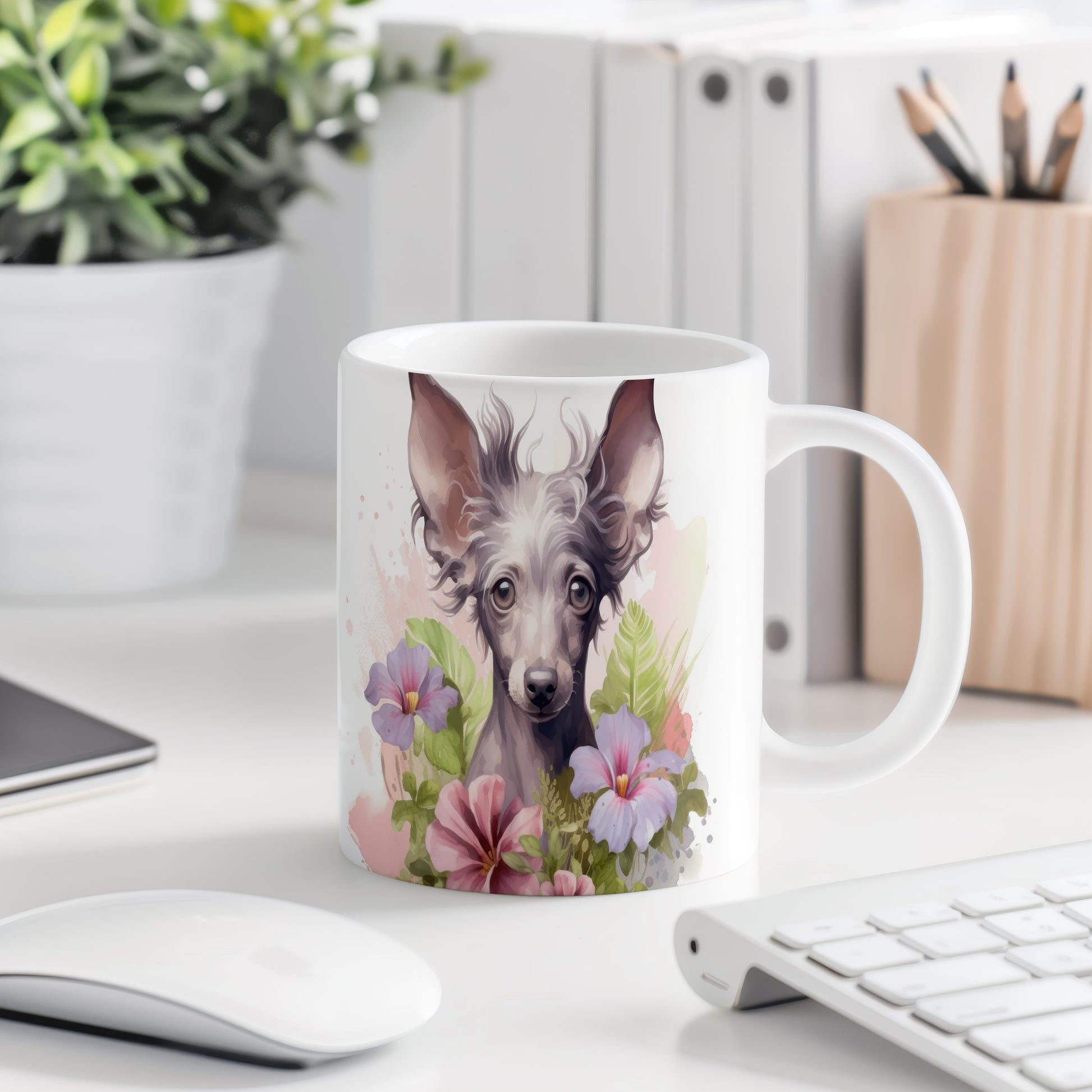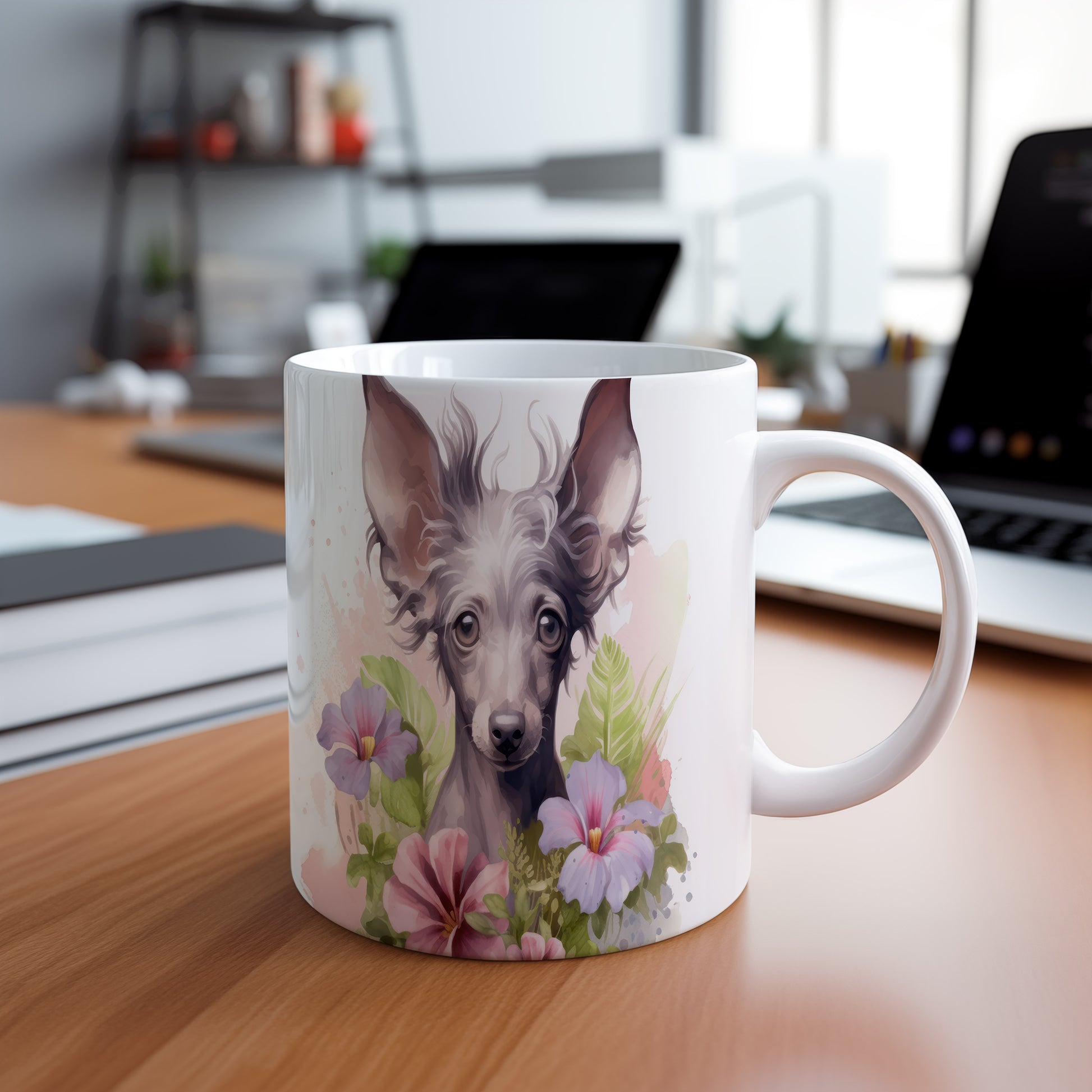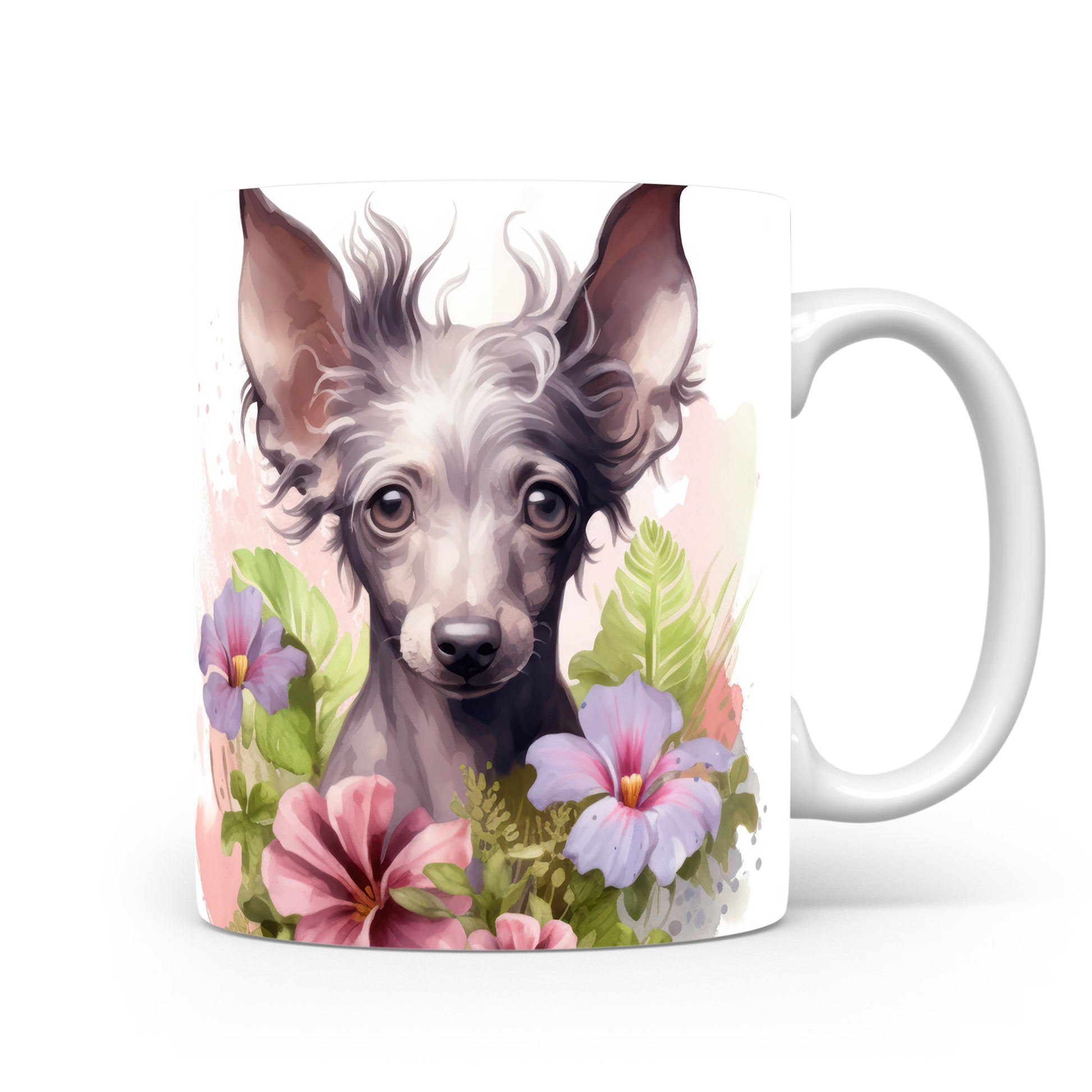 Tento hrnek s krásným motivem čínského chocholatého psa a květin je ideální pro milovníky psů. Přidejte do své domácnosti kousek radosti a originality s tímto jedinečným designem.