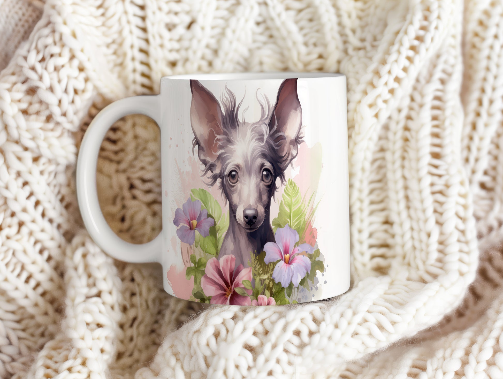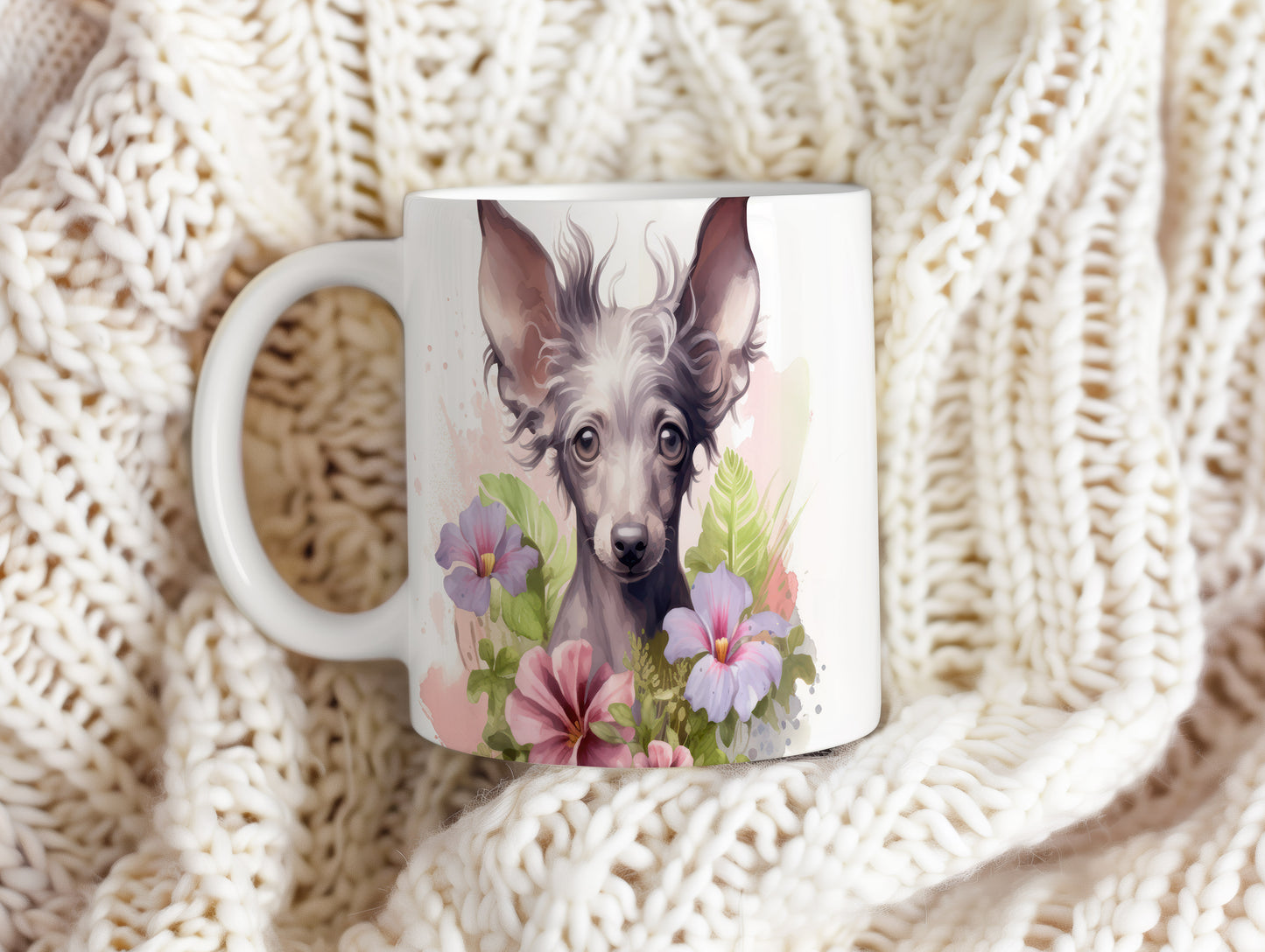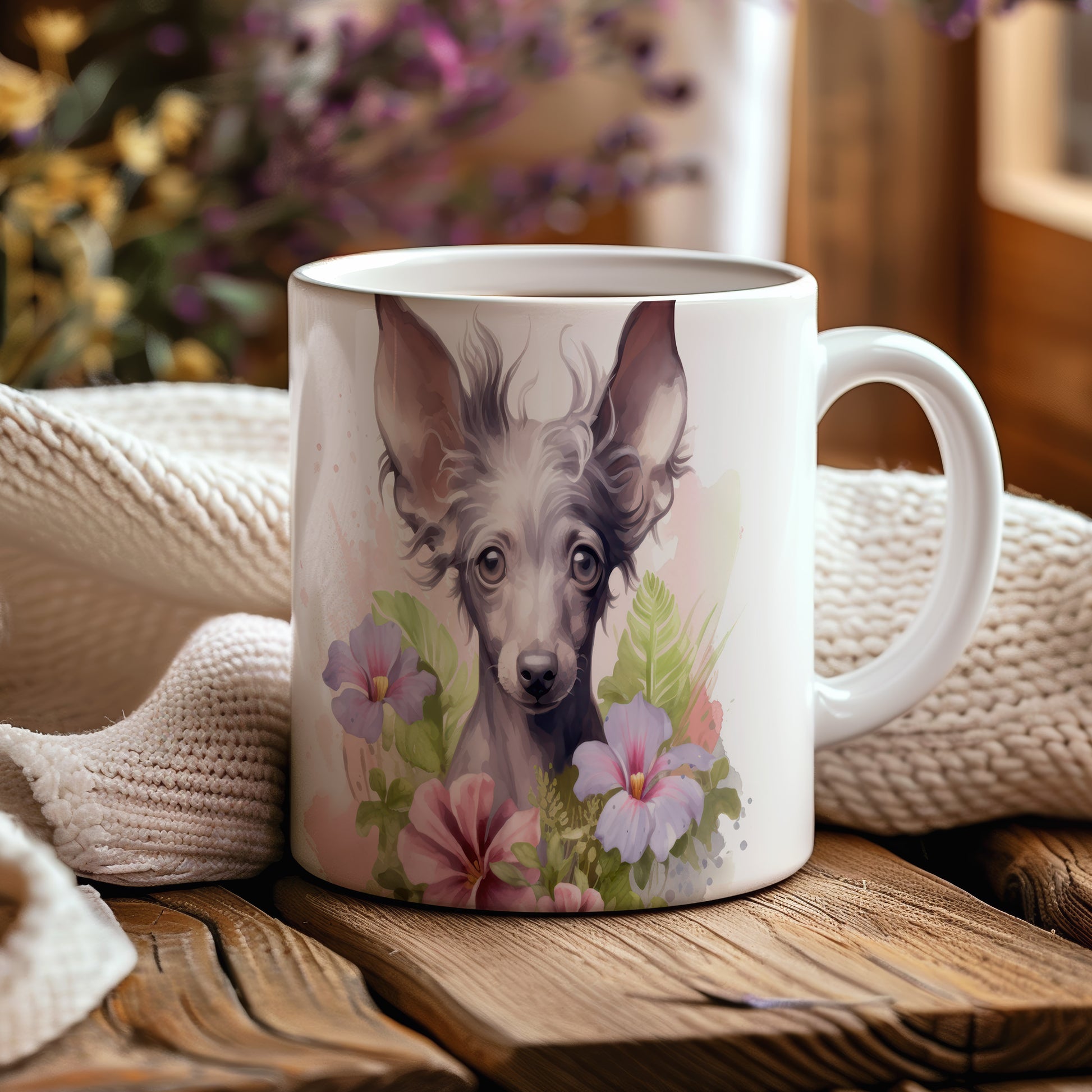 Tento hrnek s krásným motivem čínského chocholatého psa a květin je ideální pro milovníky psů. Přidejte do své domácnosti kousek radosti a originality s tímto jedinečným designem.