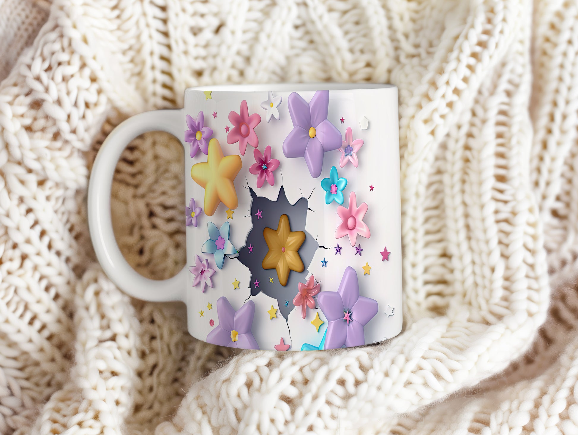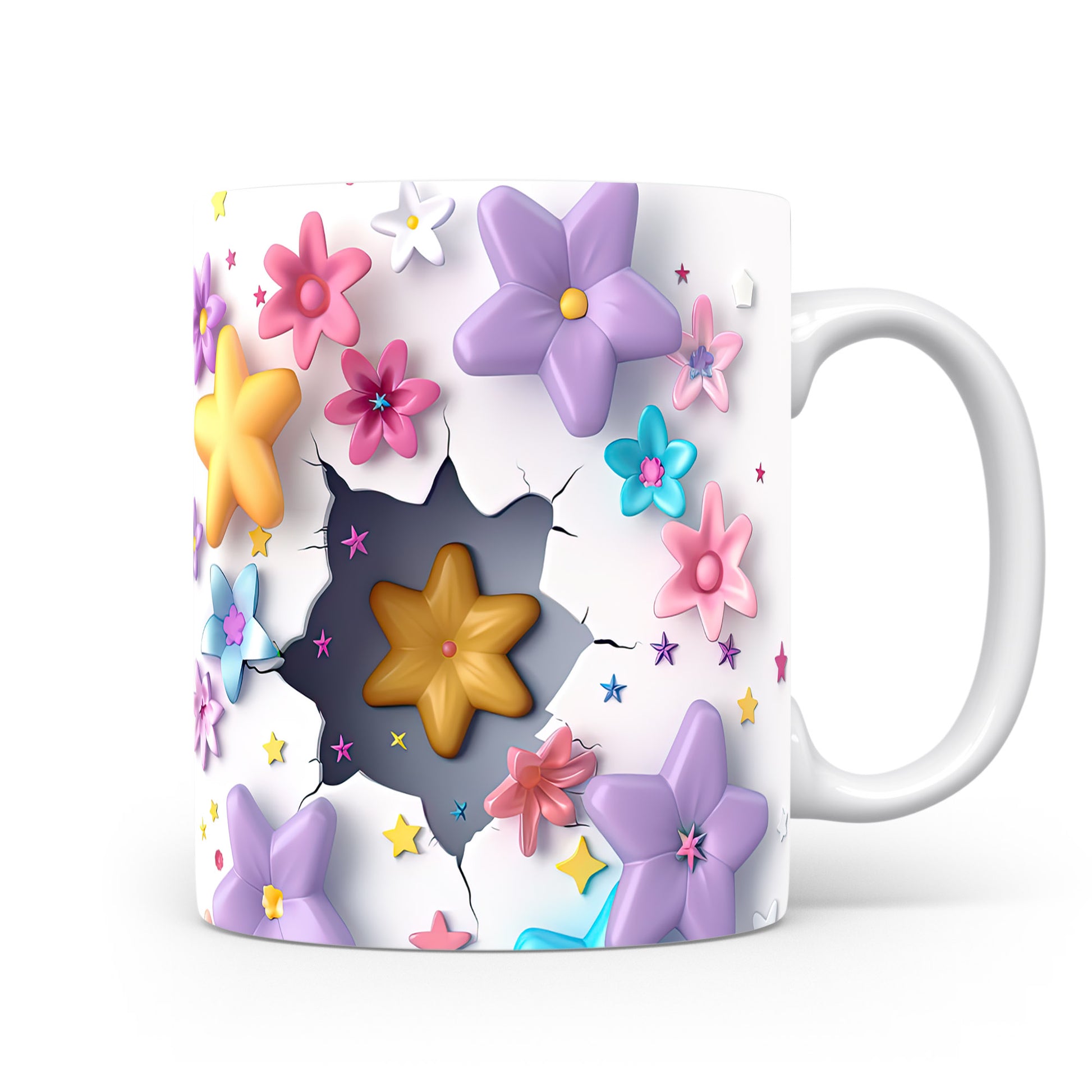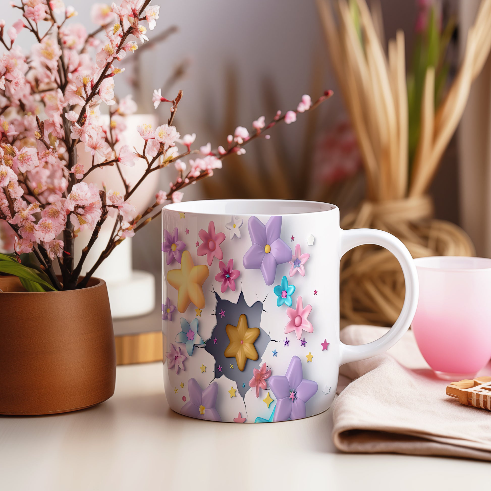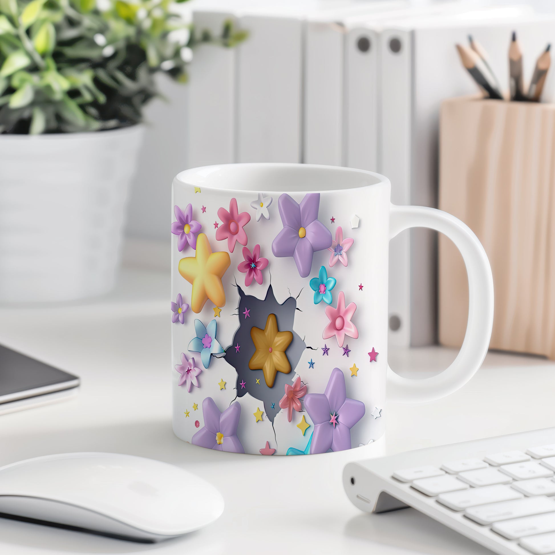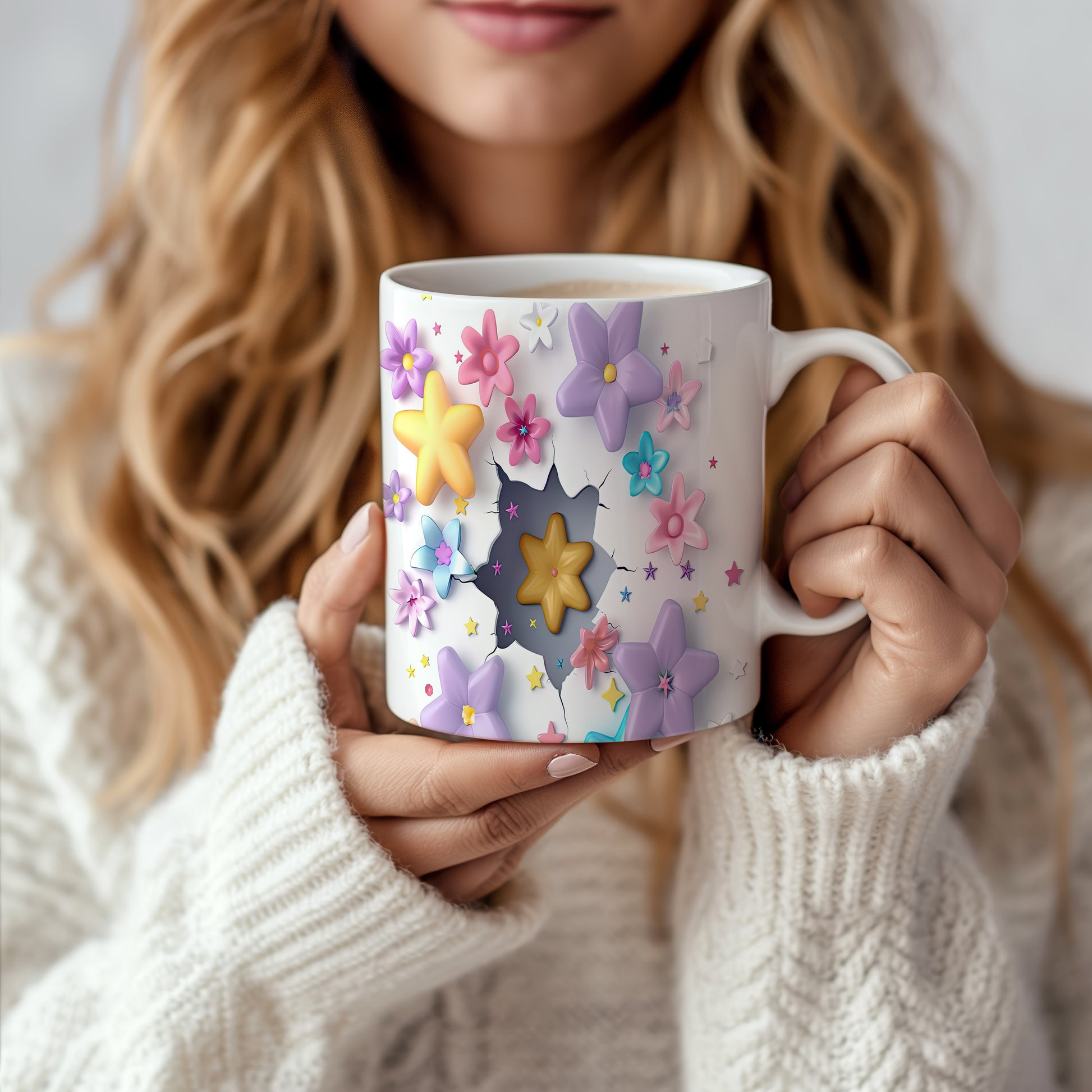 Hrnek s květinovým designem a 3D efektem v bílých tónech