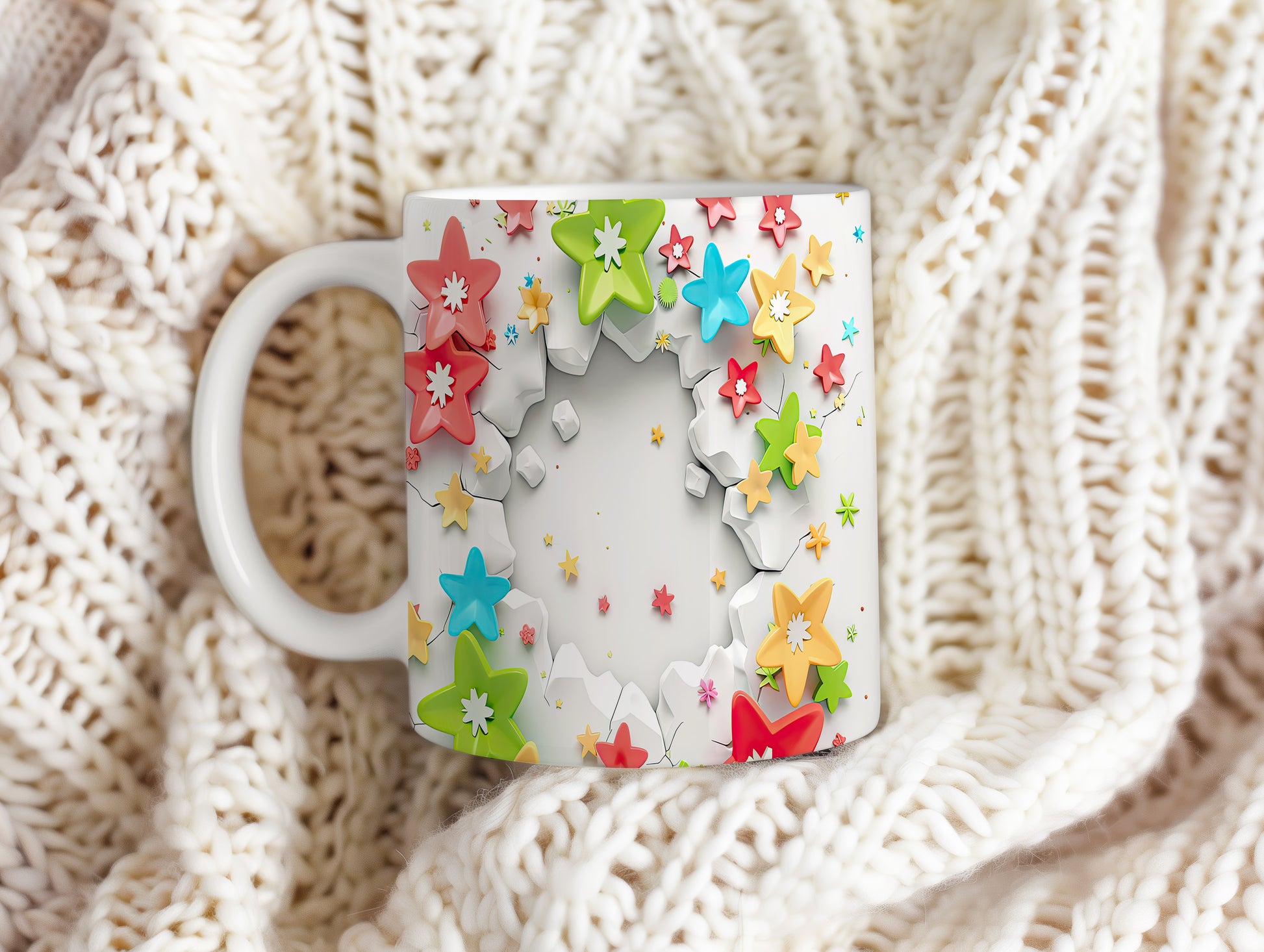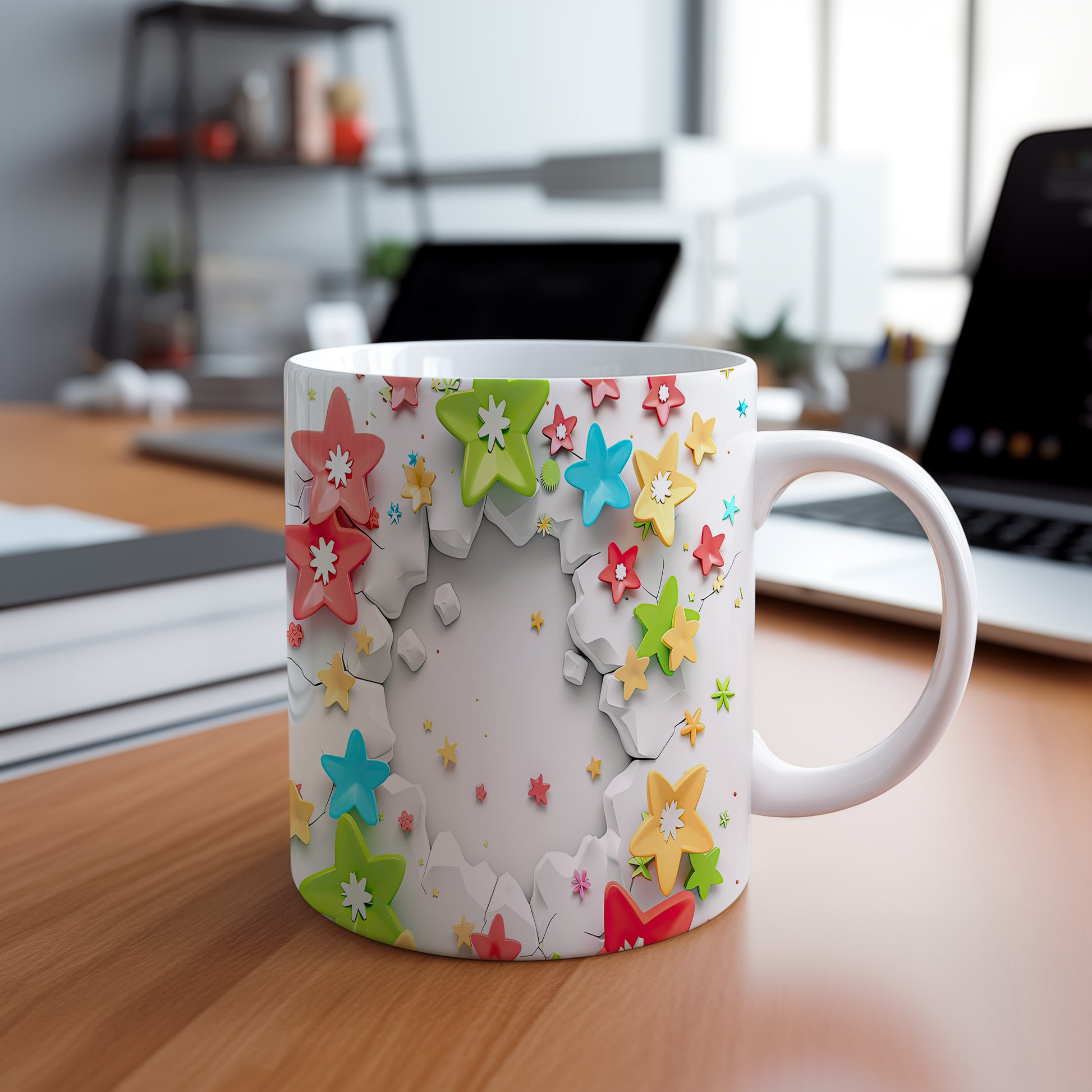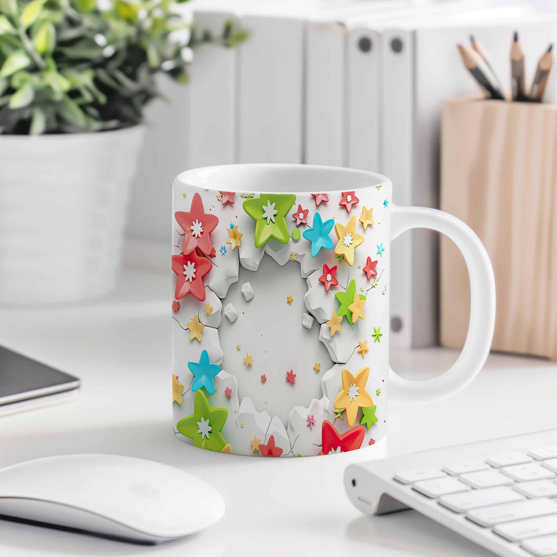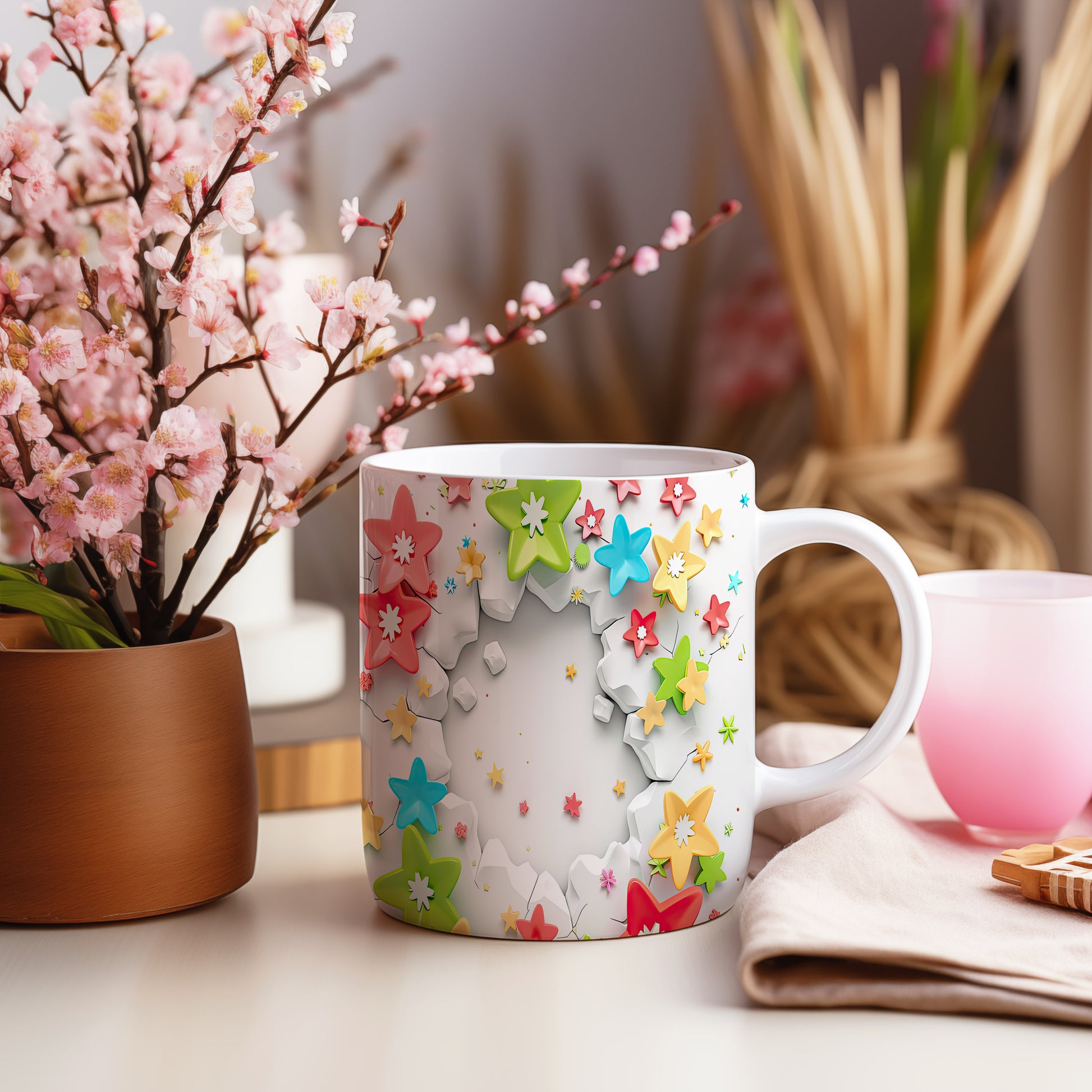 Hrnek s květinovým designem a 3D efektem v radostných tónech
