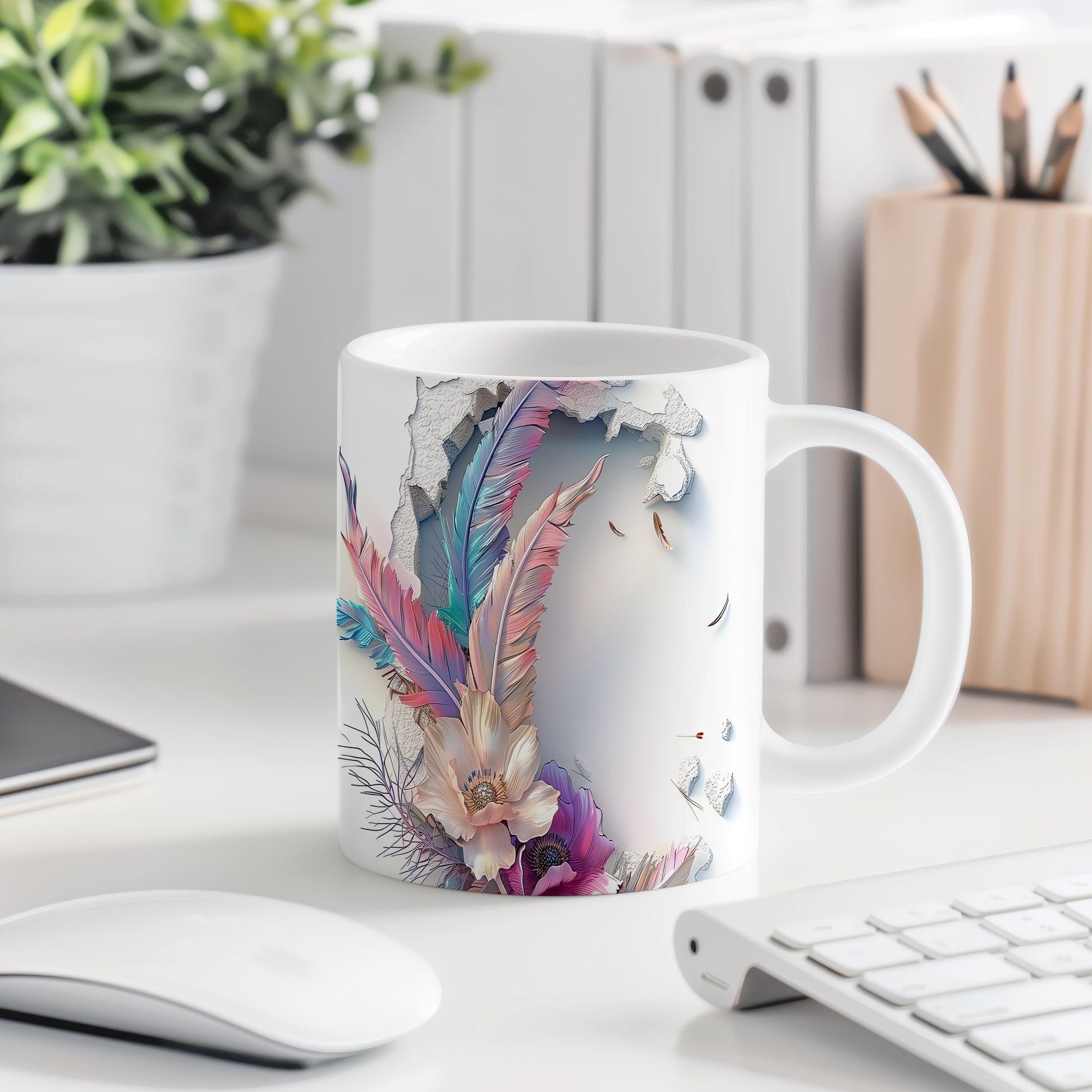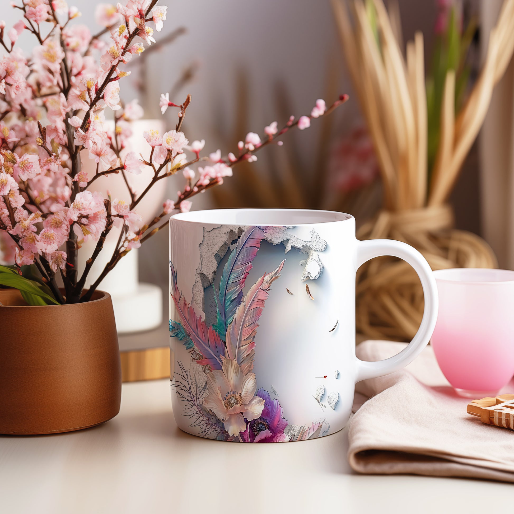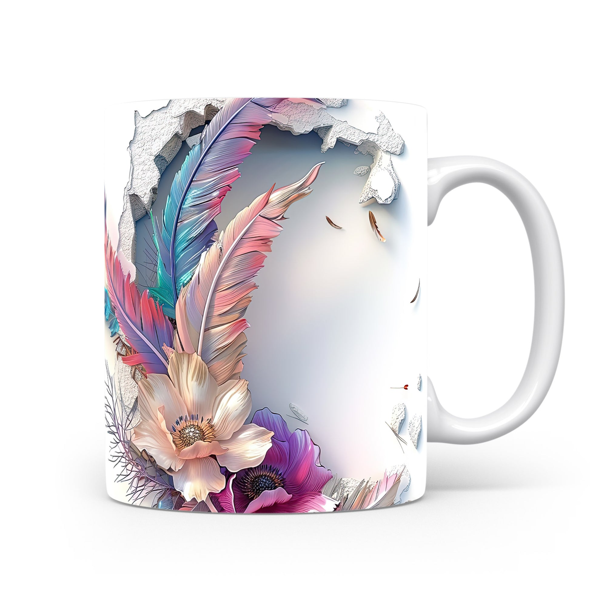 Tento elegantní hrnek zdobí barevné květy a pírka, což mu dodává jedinečný styl. Je ideální pro každodenní použití a skvěle se hodí jako dárek pro milovníky přírody. Materiál: keramika. Objem: 330 ml. Vhodné do myčky i mikrovlnky. Díky svému designu přináší radost při každém doušku.