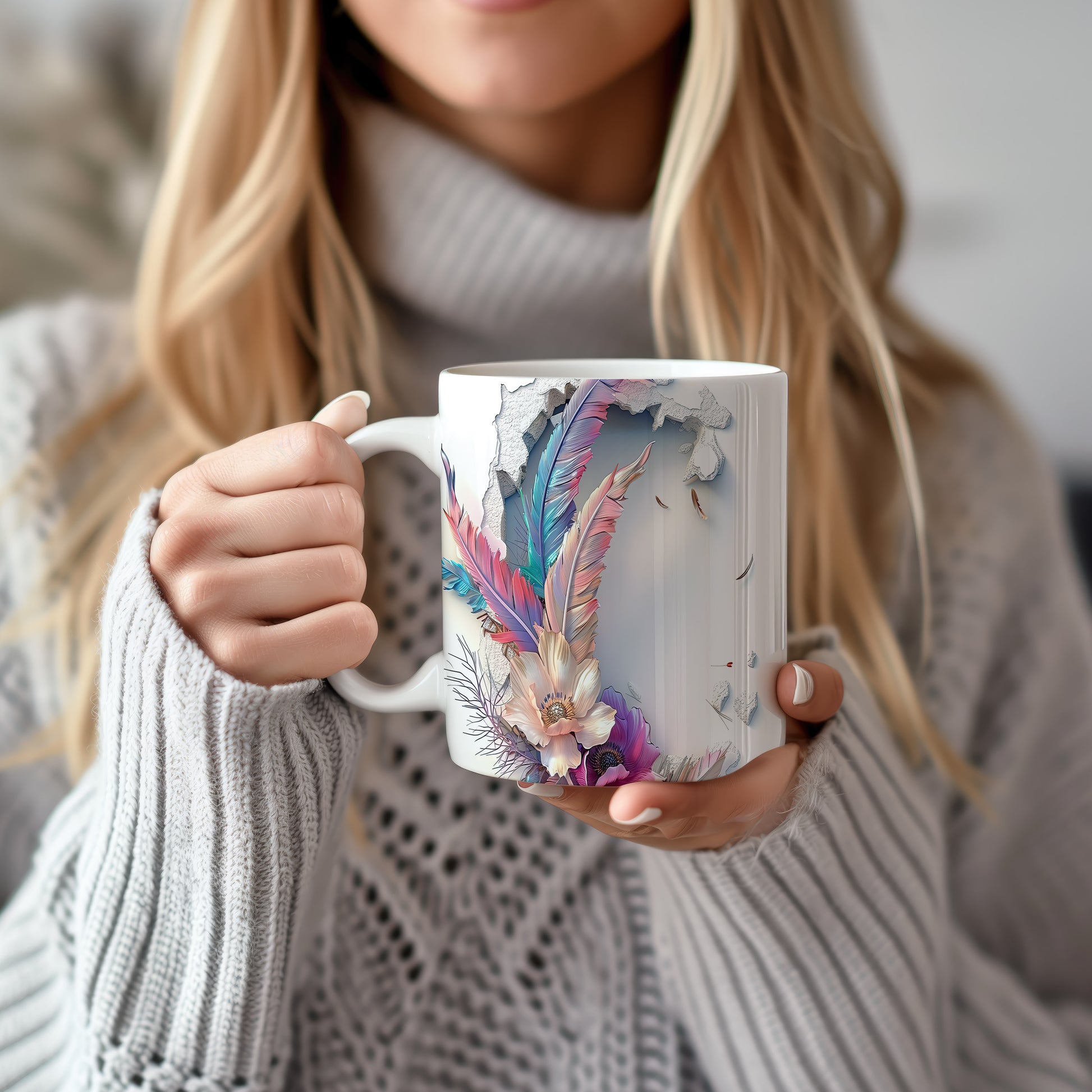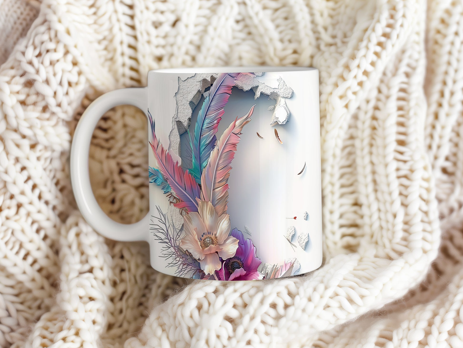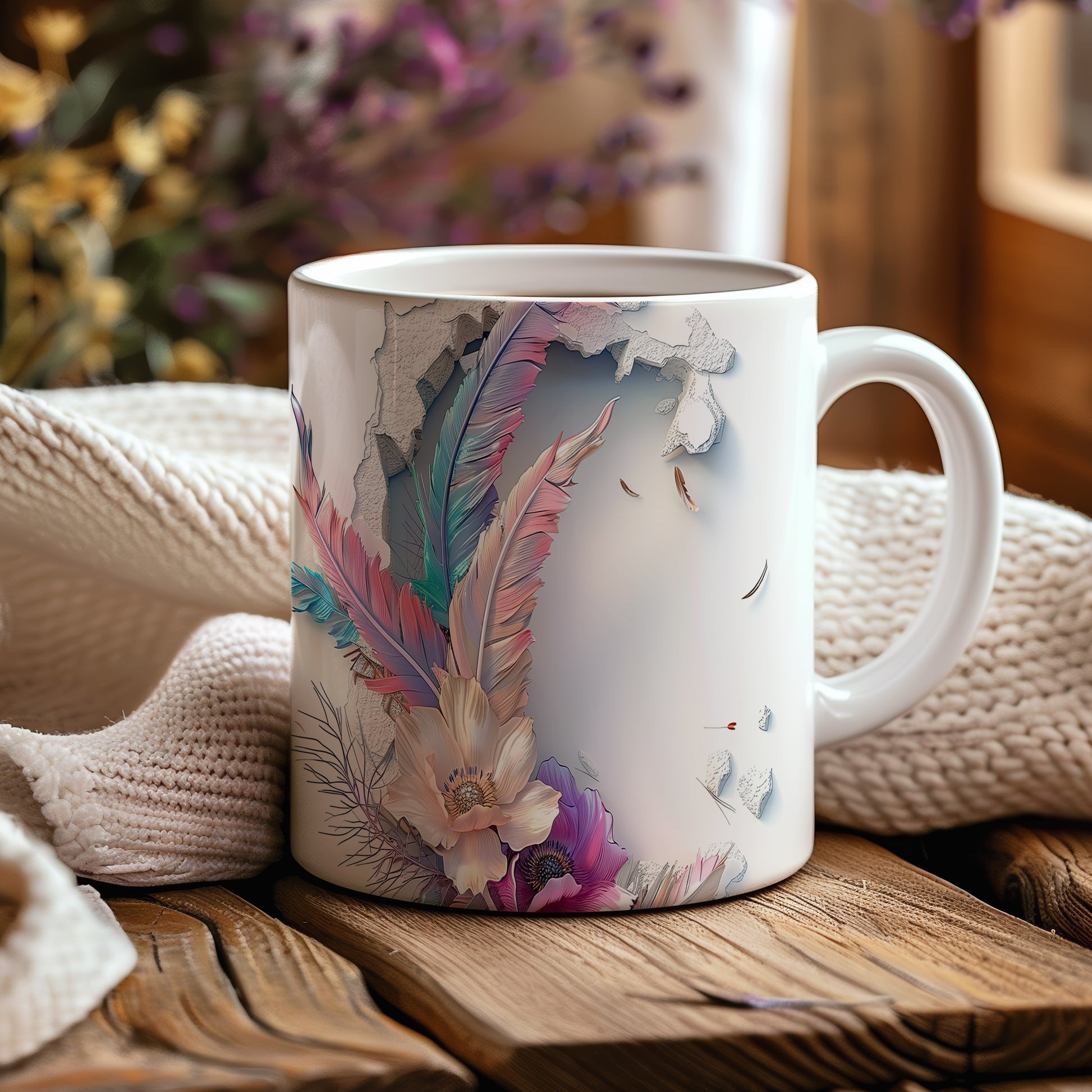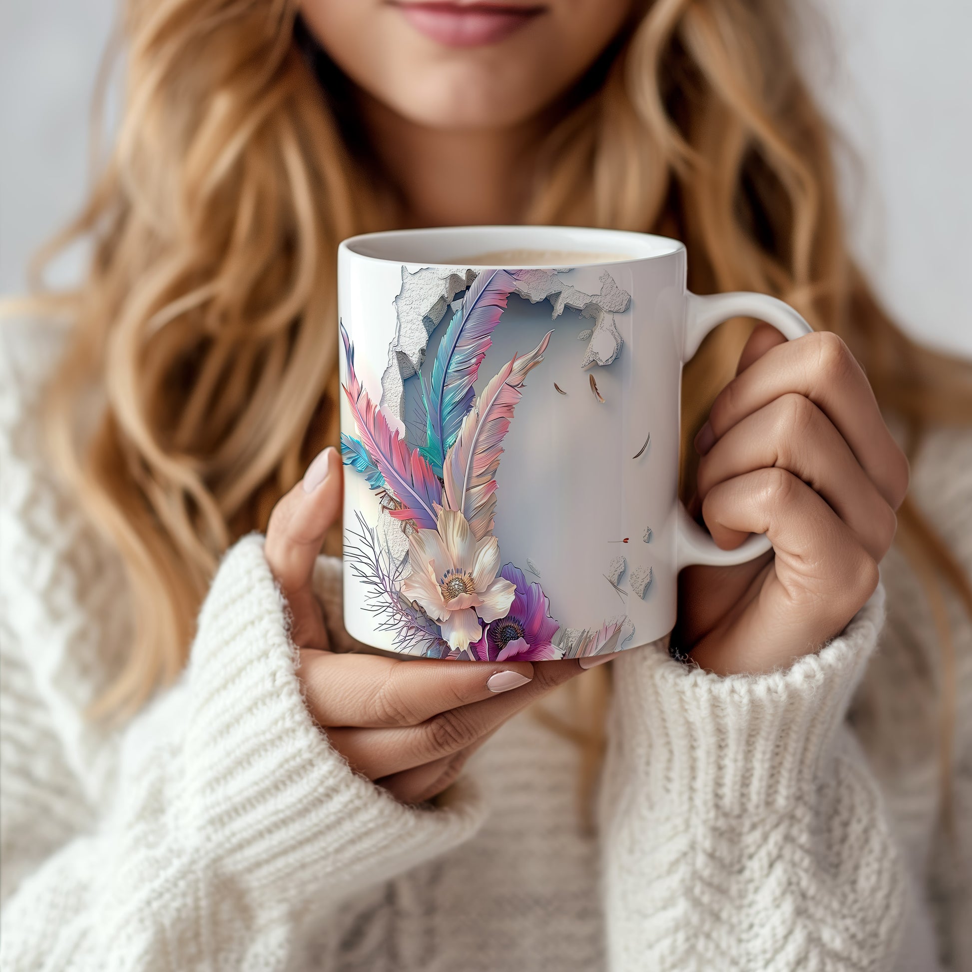 Tento elegantní hrnek zdobí barevné květy a pírka, což mu dodává jedinečný styl. Je ideální pro každodenní použití a skvěle se hodí jako dárek pro milovníky přírody. Materiál: keramika. Objem: 330 ml. Vhodné do myčky i mikrovlnky. Díky svému designu přináší radost při každém doušku.