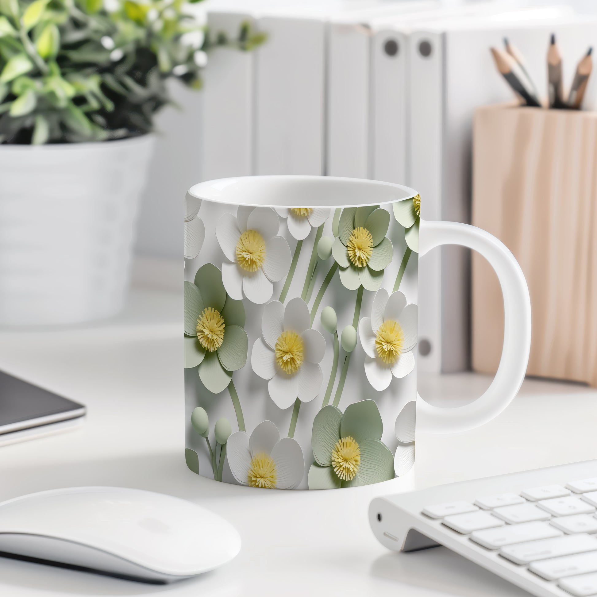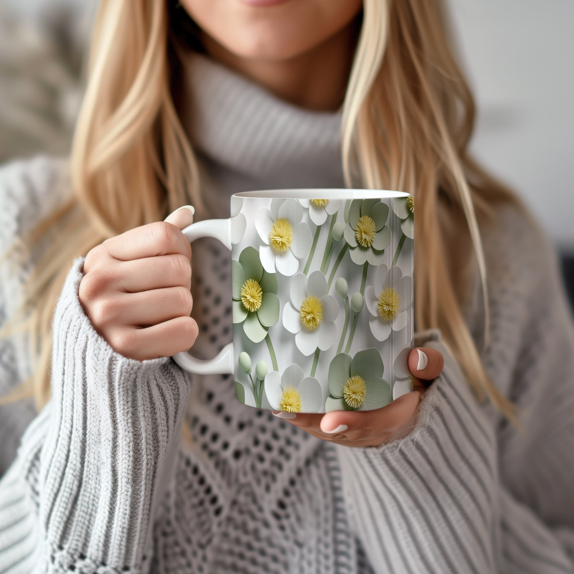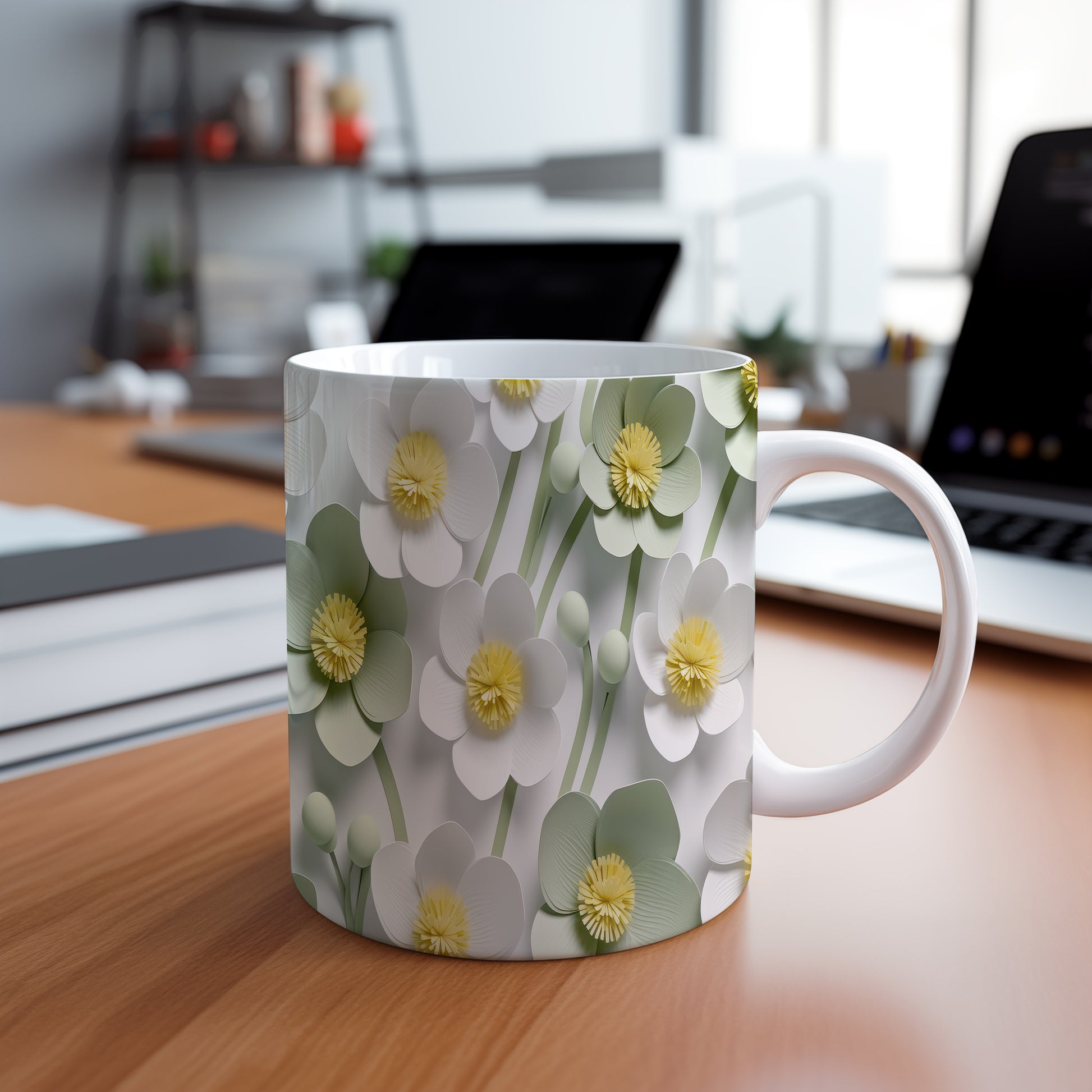 Hrnek s květinovým designem v bílé, žluté a zelené barvě
