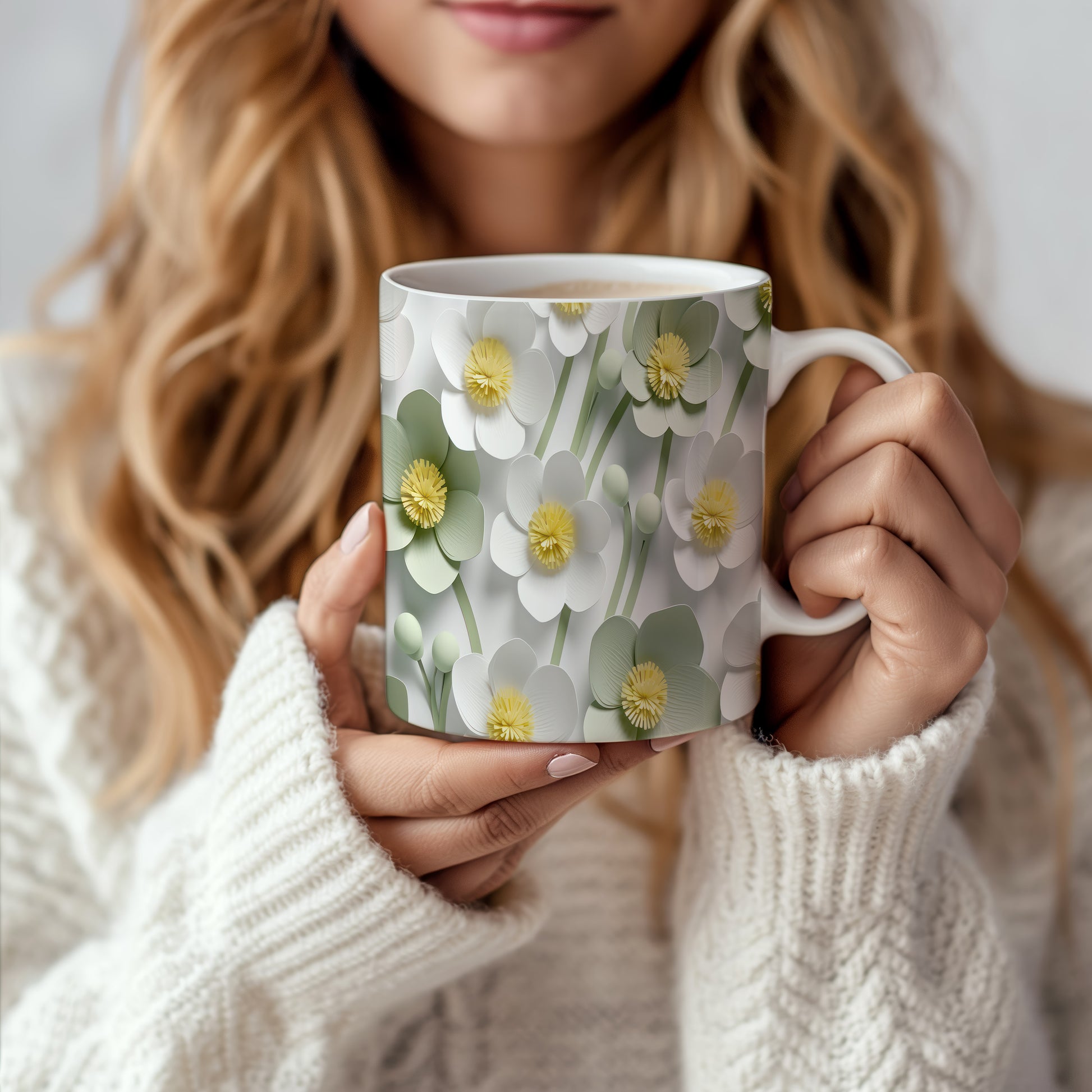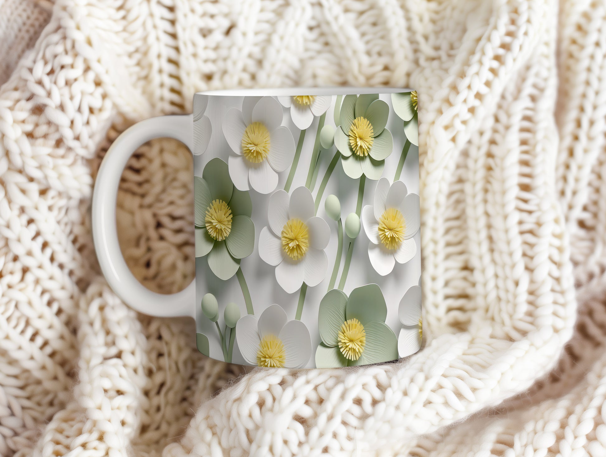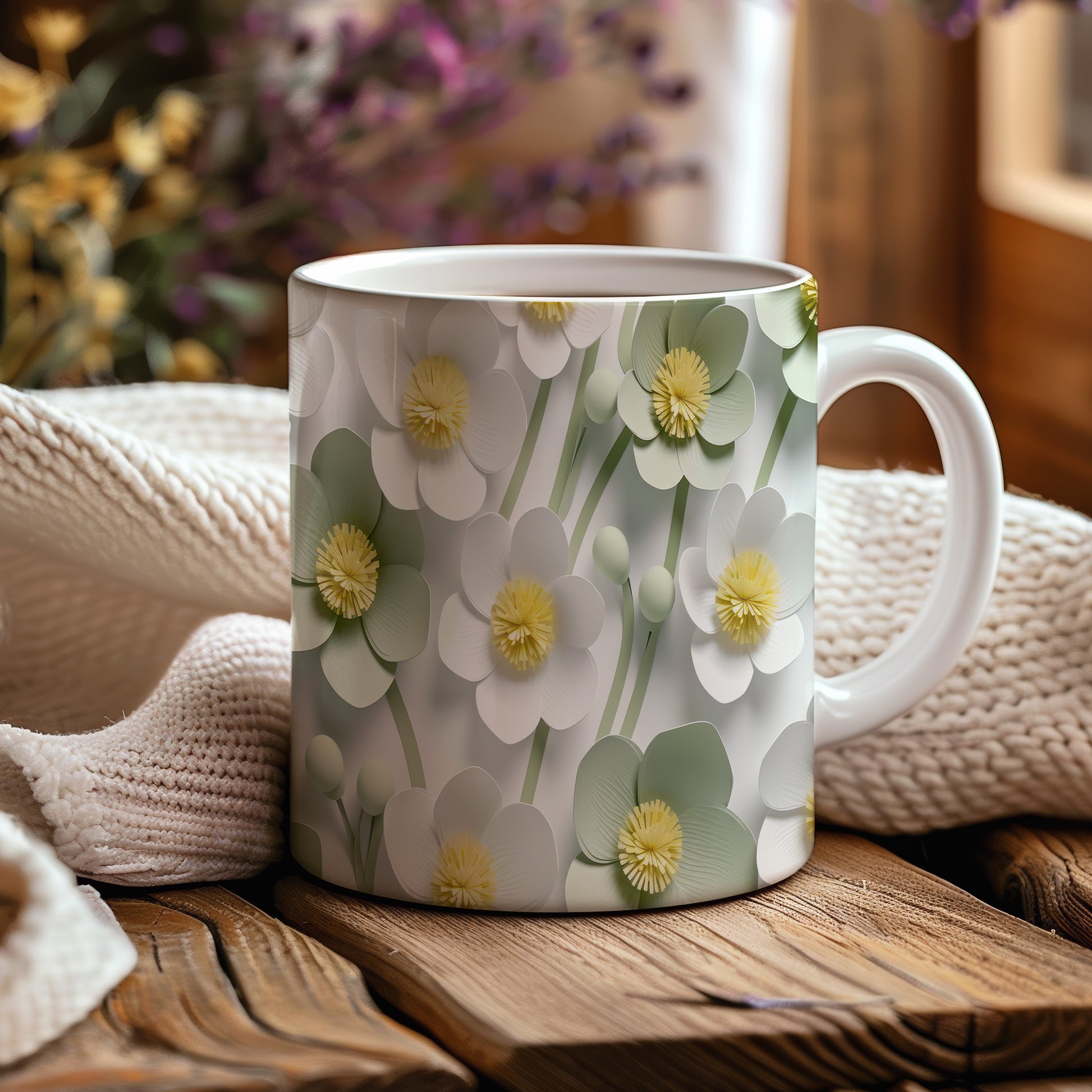 Hrnek s květinovým designem v bílé, žluté a zelené barvě
