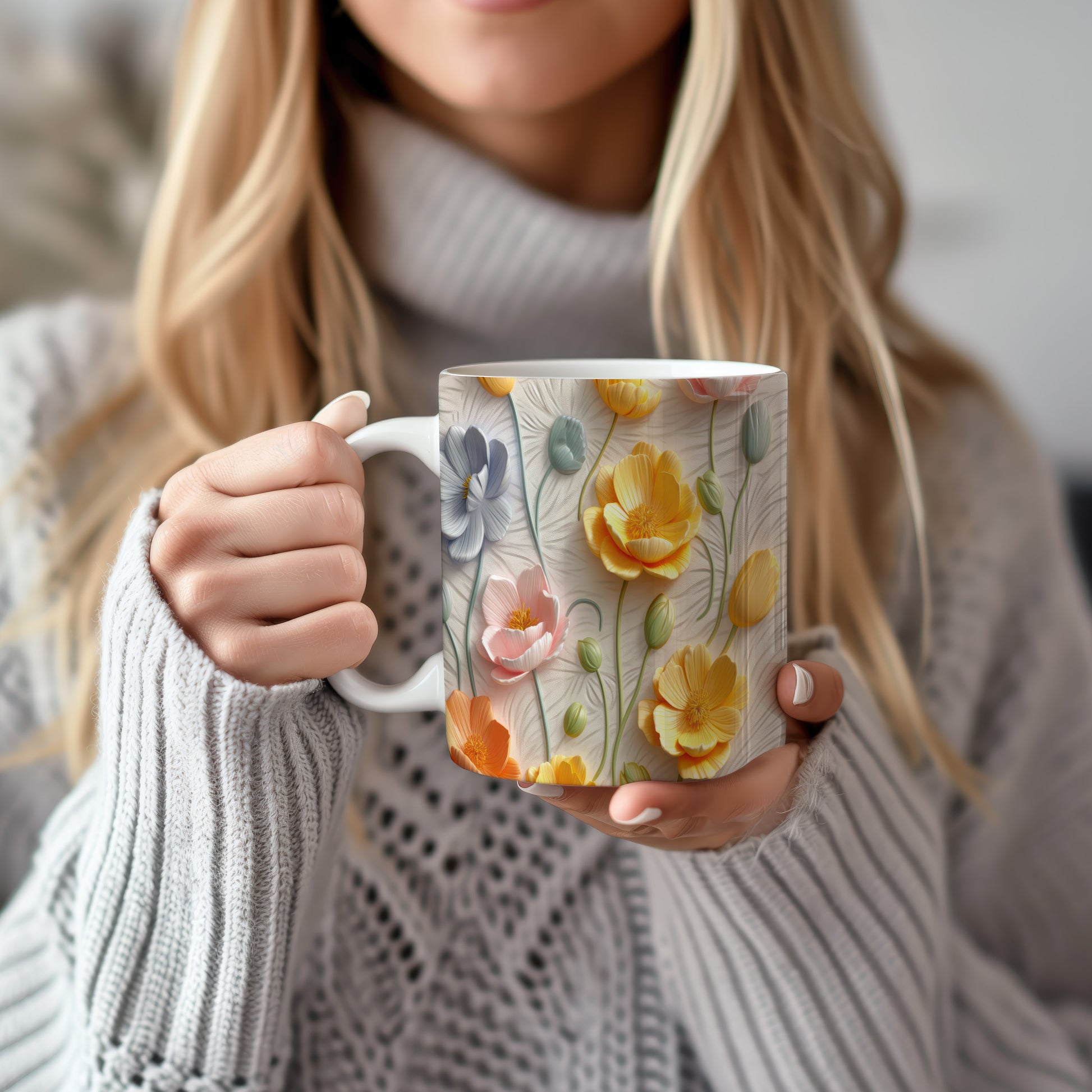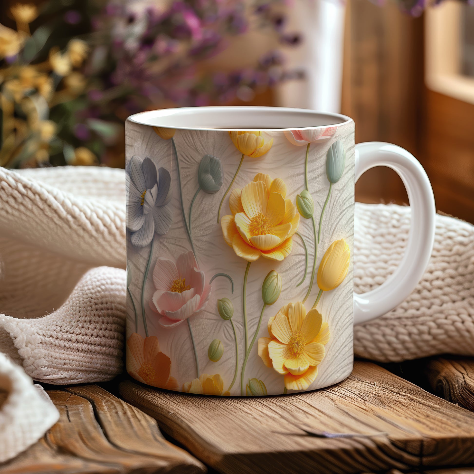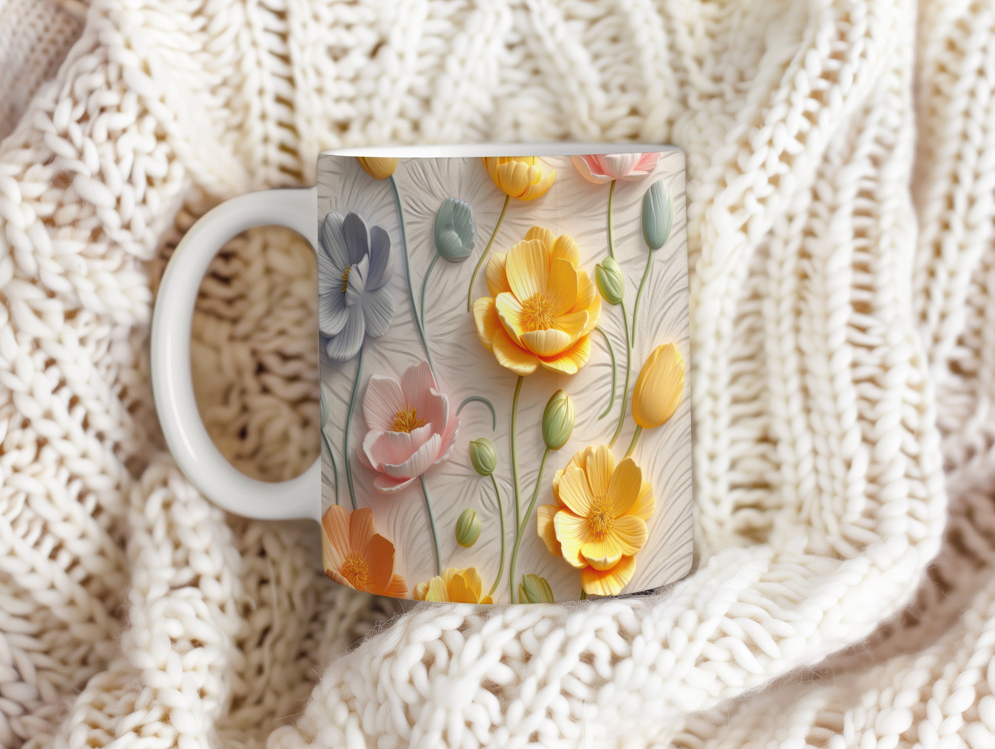 Hrnek s květinovým designem v pastelových tónech – digitální ilustrací
