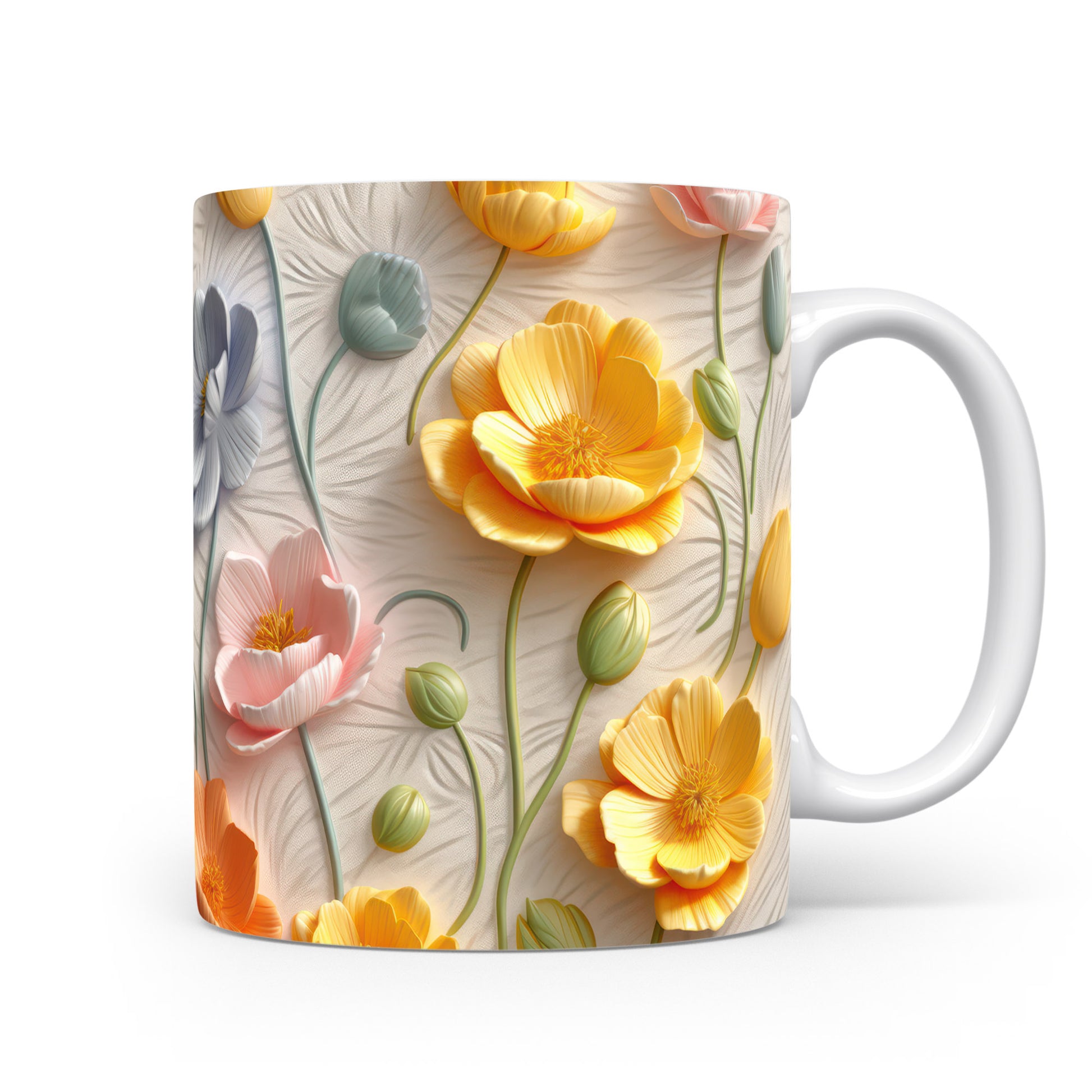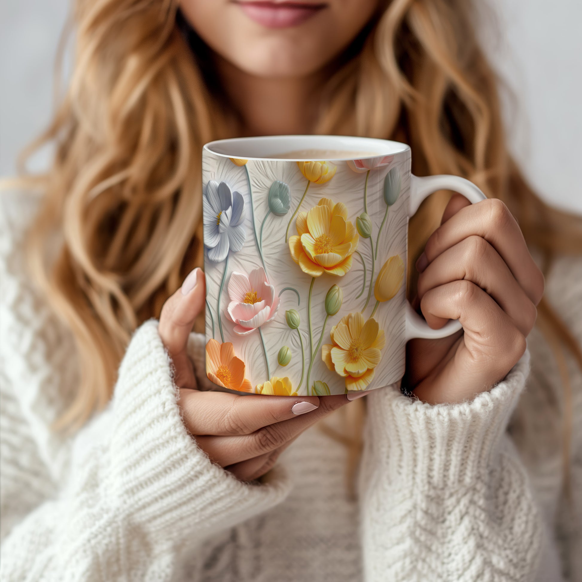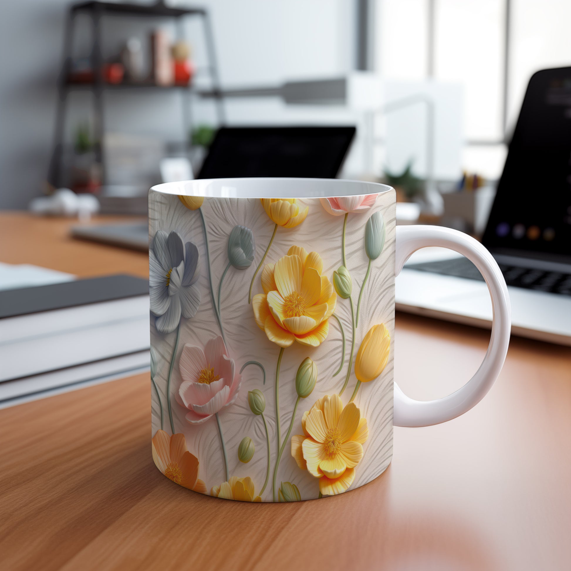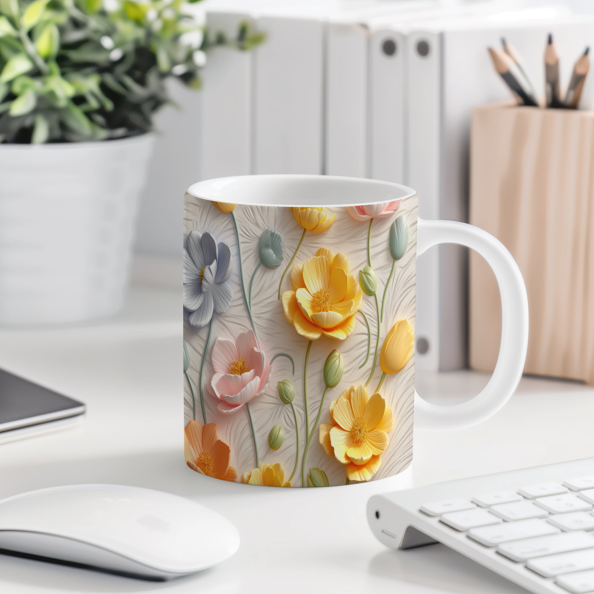 Hrnek s květinovým designem v pastelových tónech – digitální ilustrací