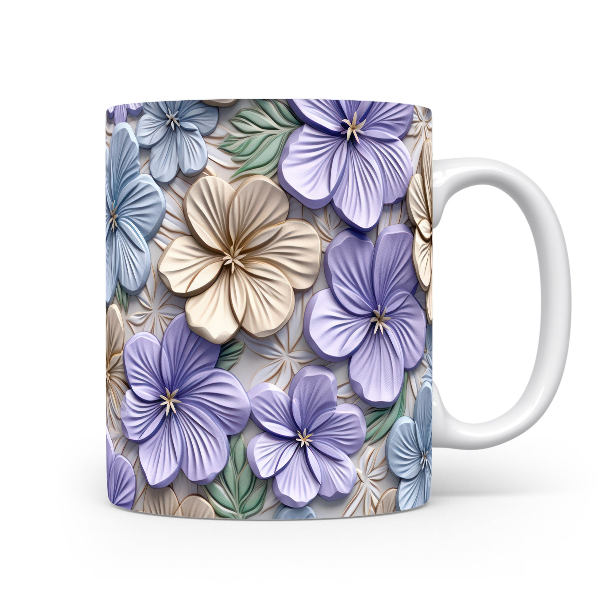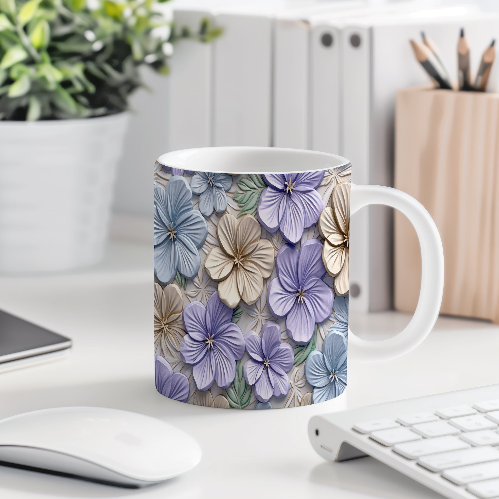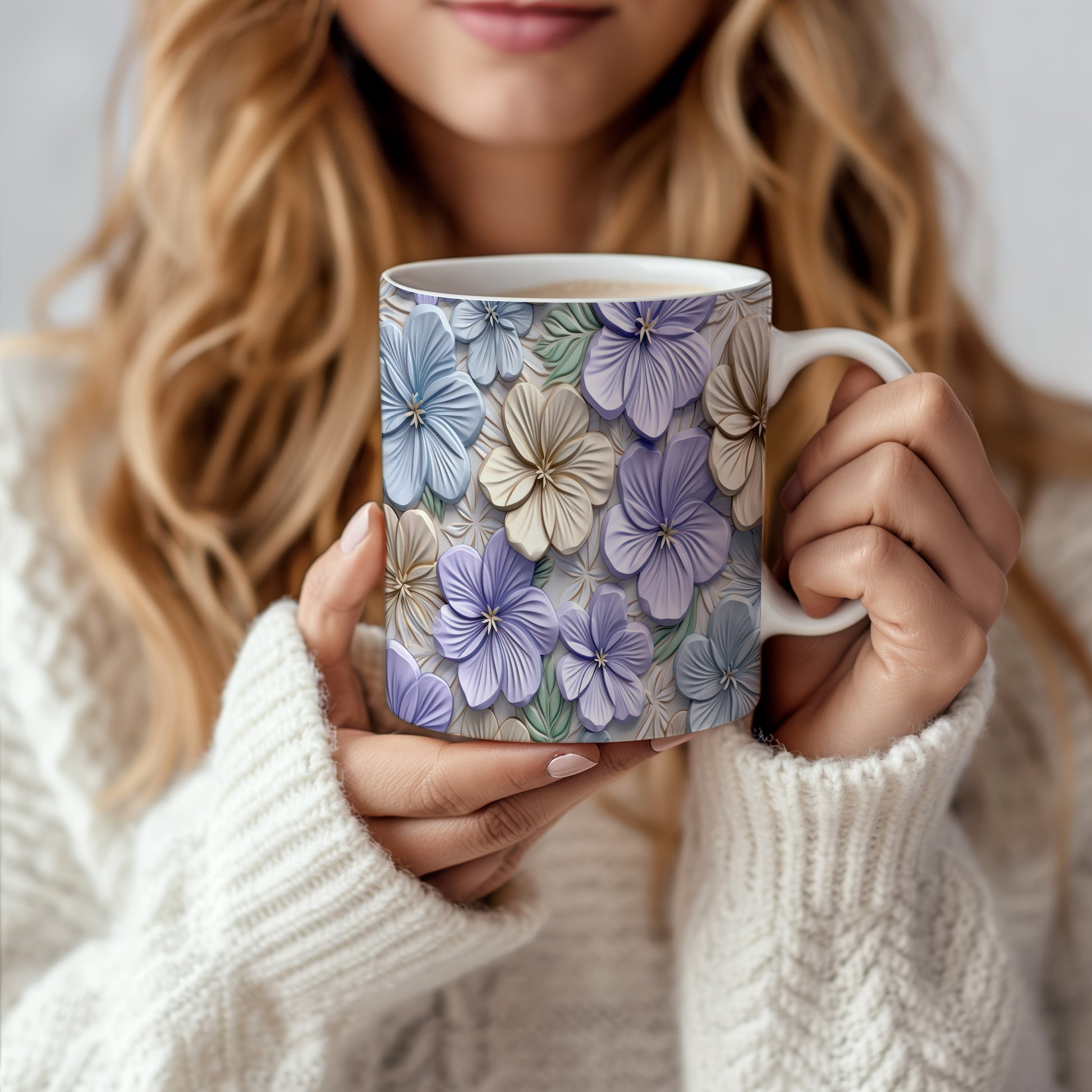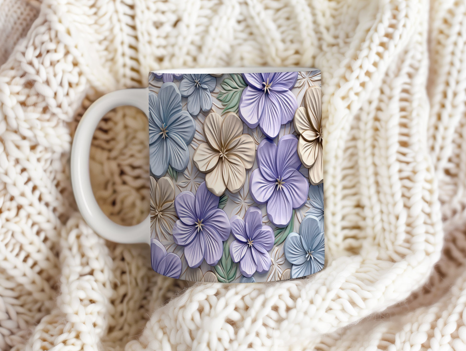 Hrnek s květinovým motivem 3D efektem – modrými detaily