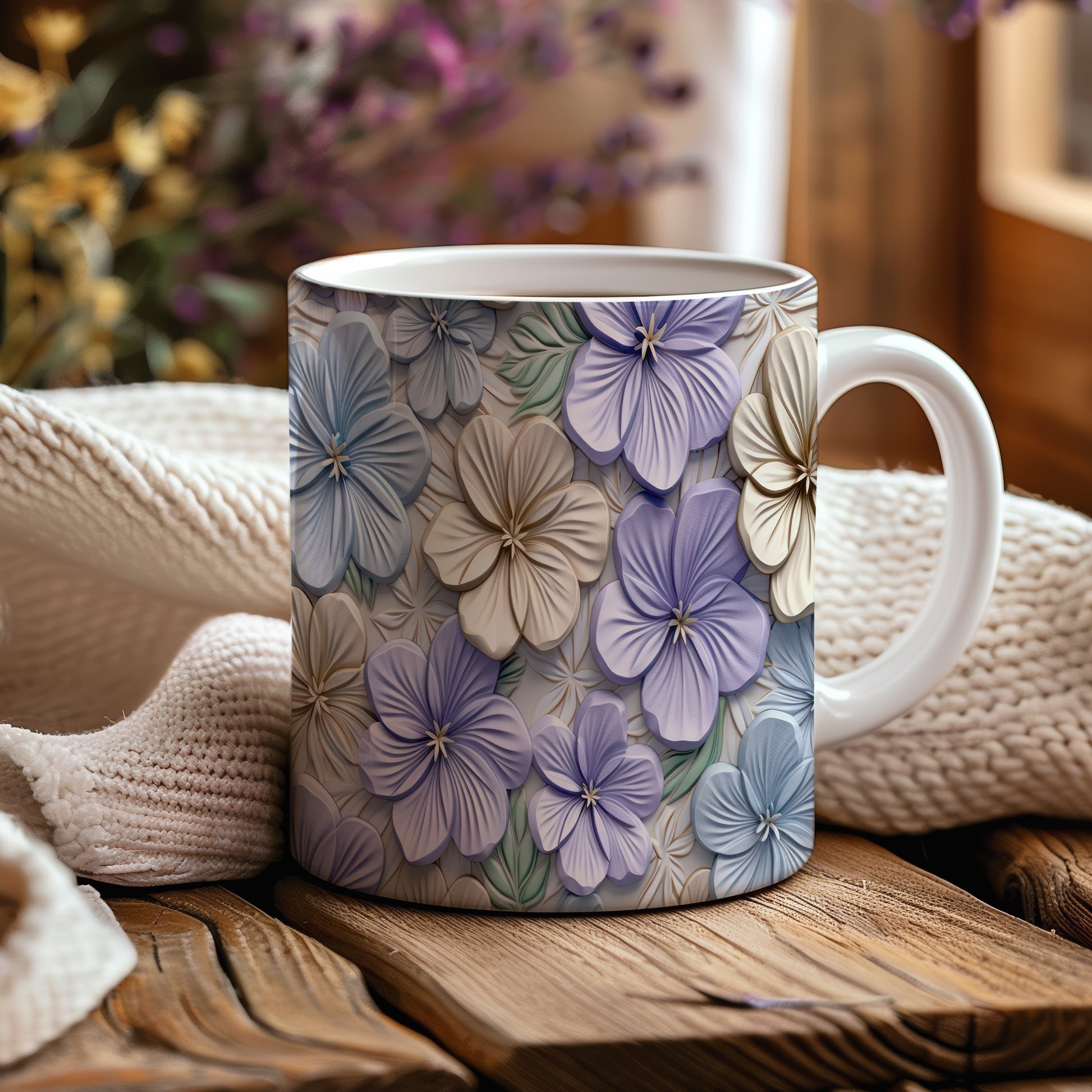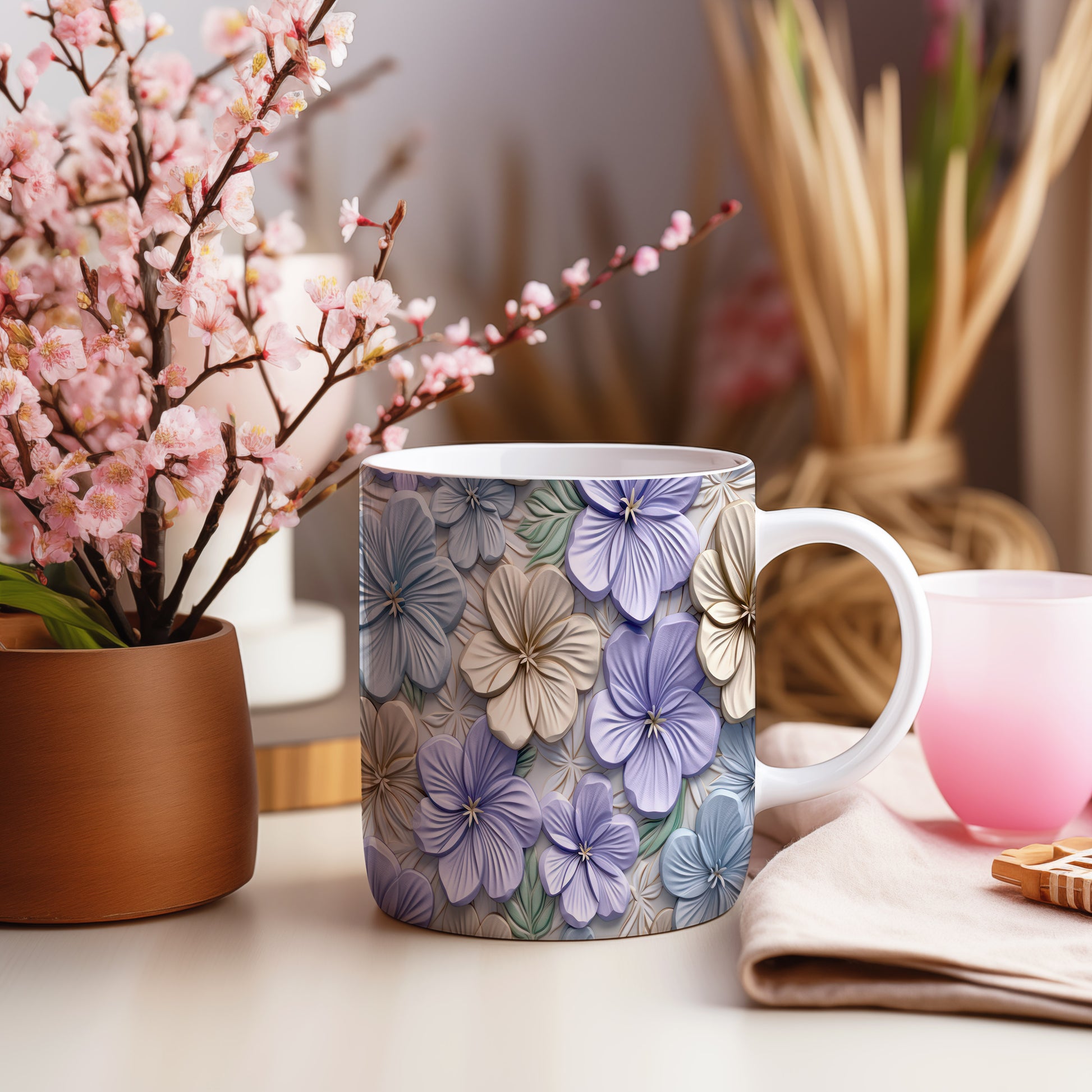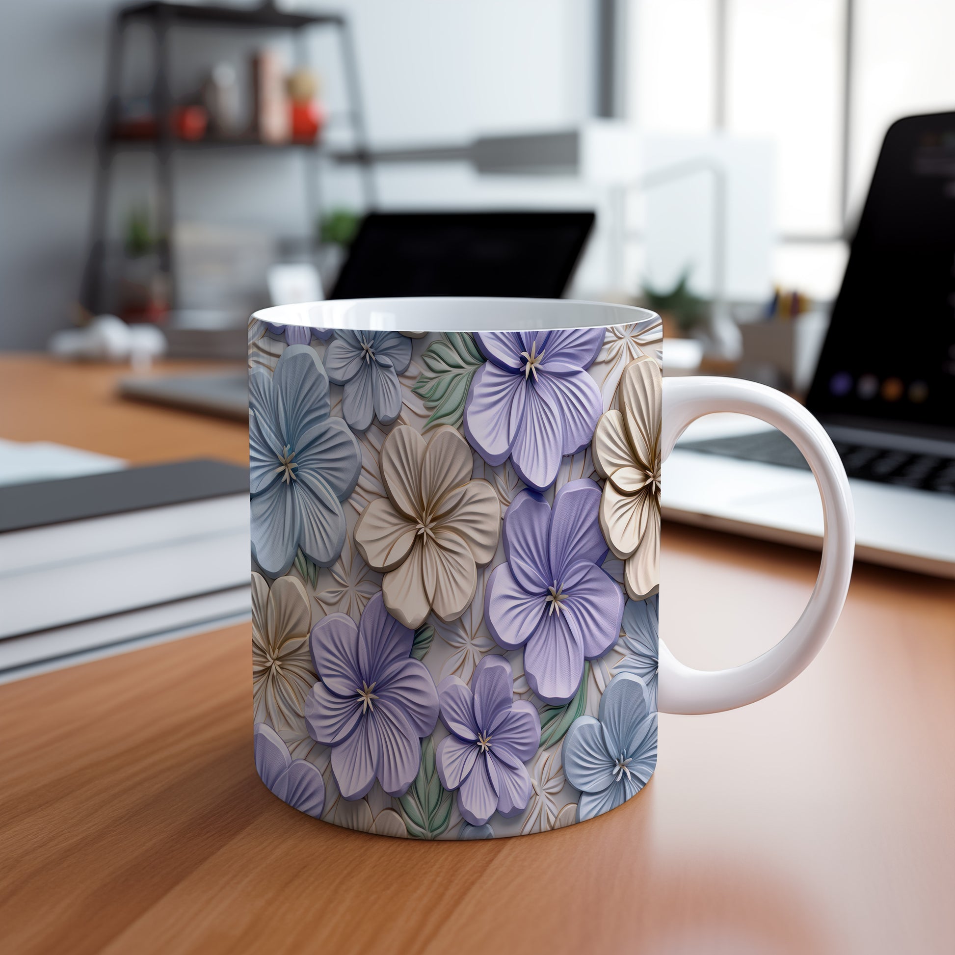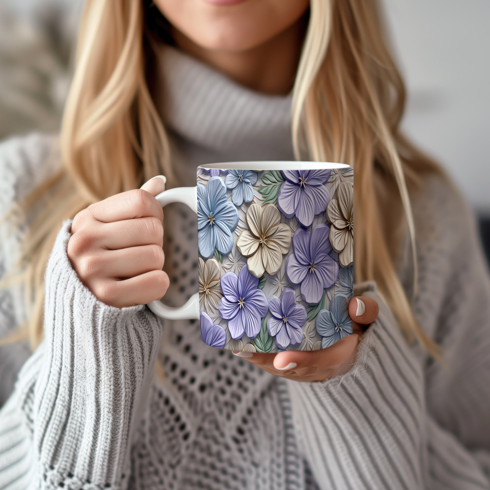 Hrnek s květinovým motivem 3D efektem – modrými detaily
