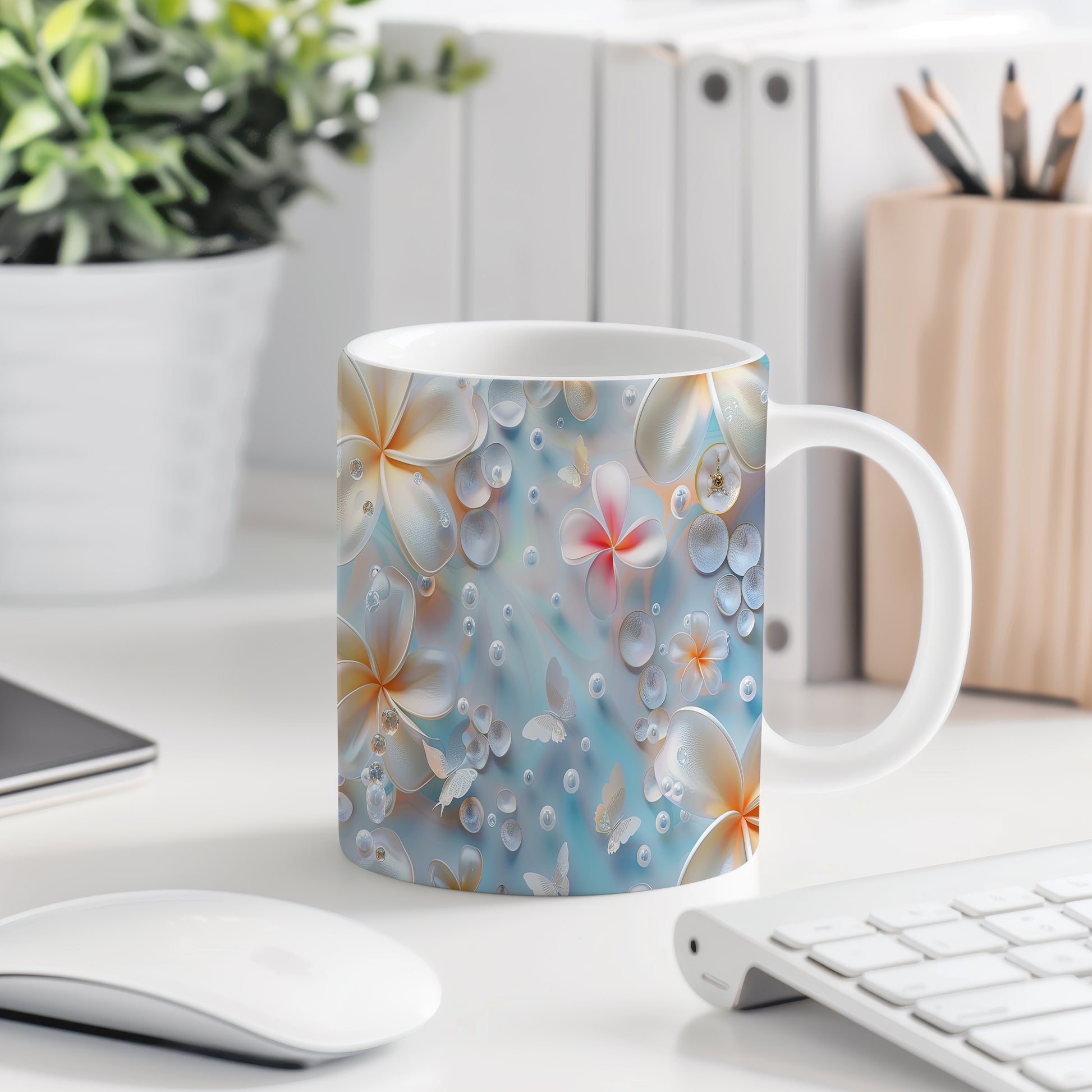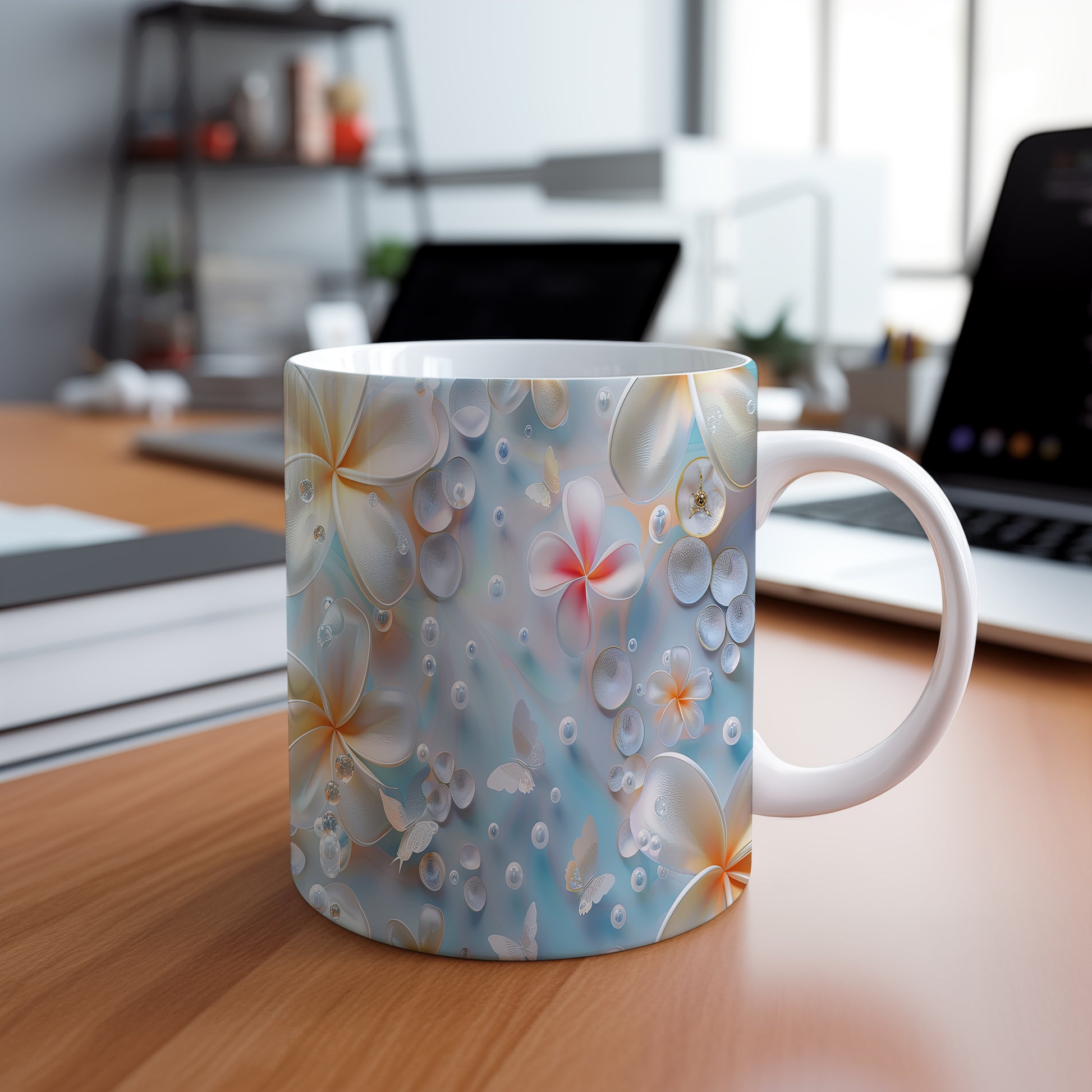 Hrnek s květinovým motivem a bublinkami