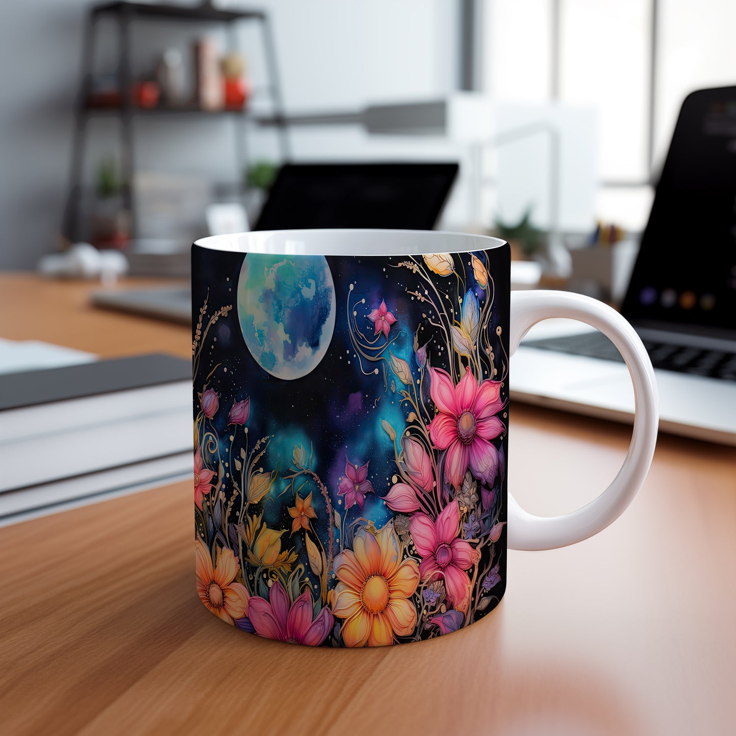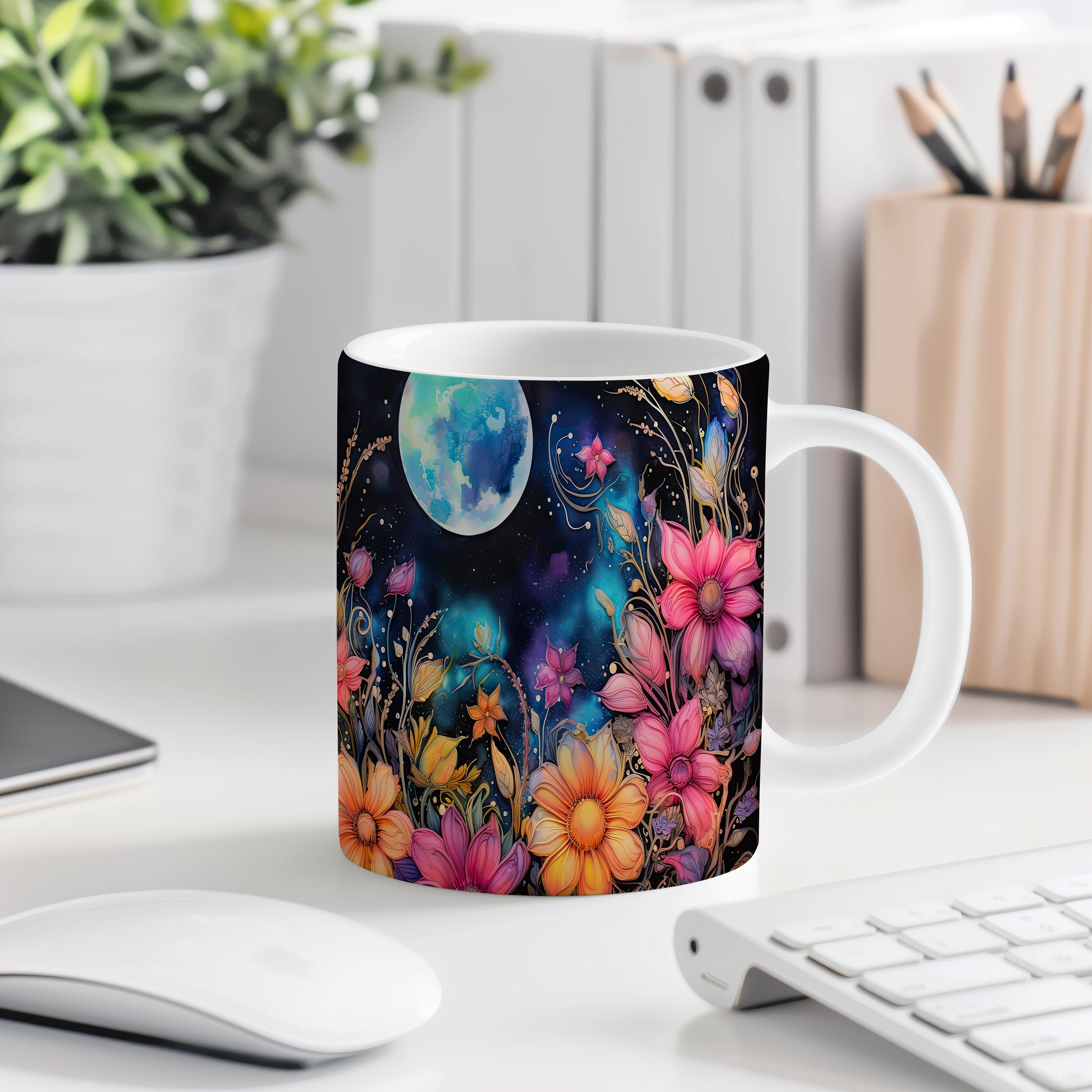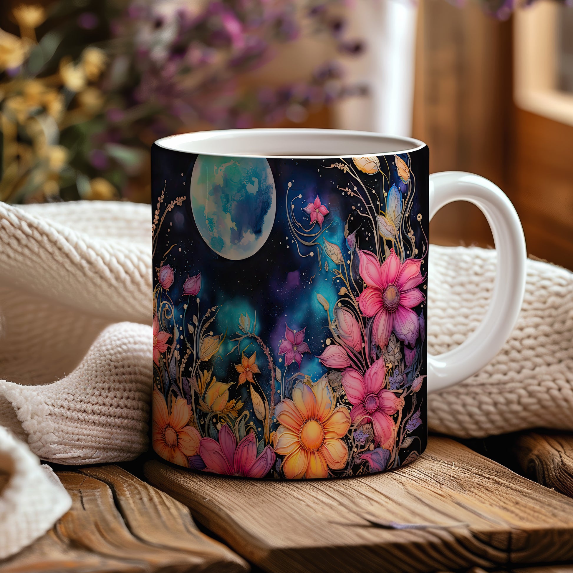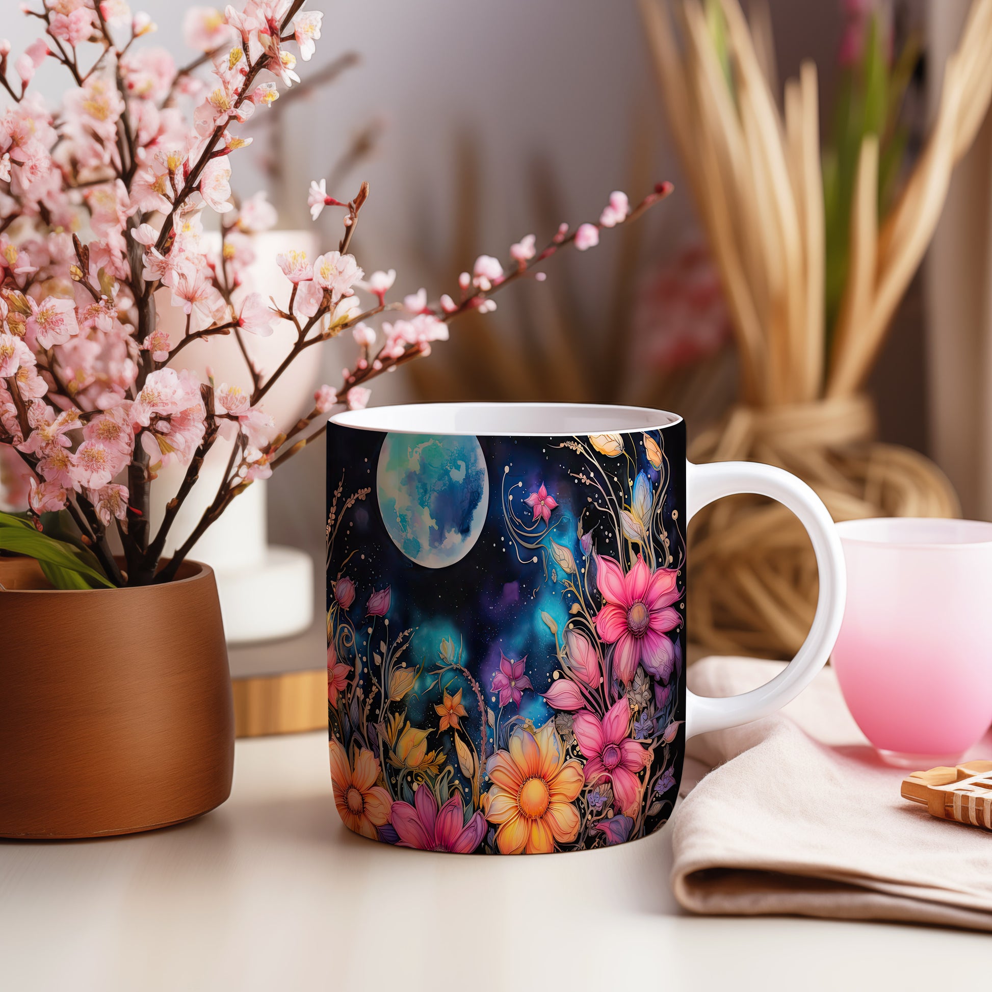 Hrnek s květinovým motivem a měsíčním pozadím