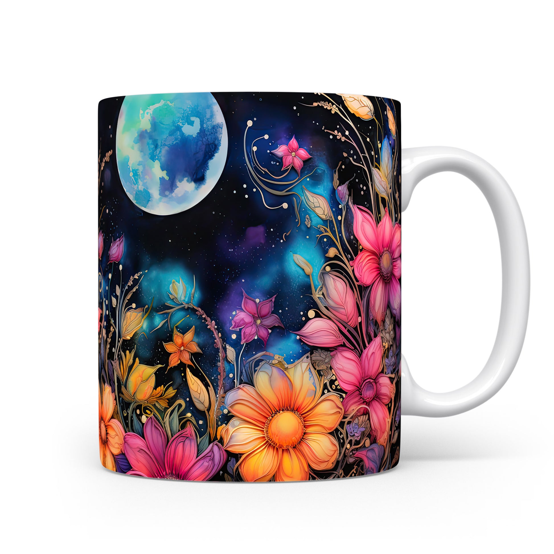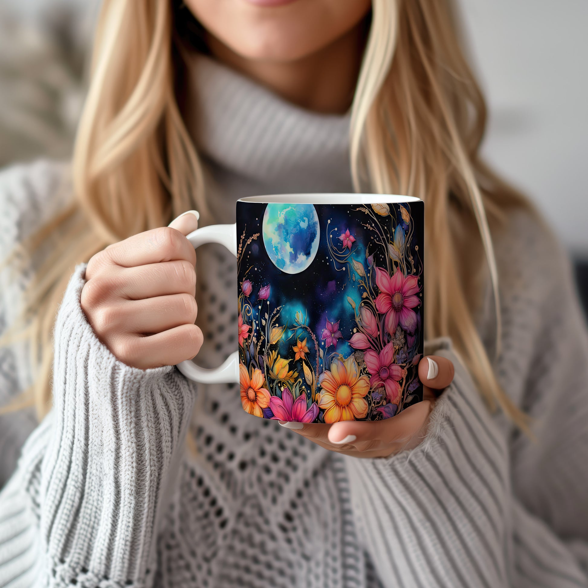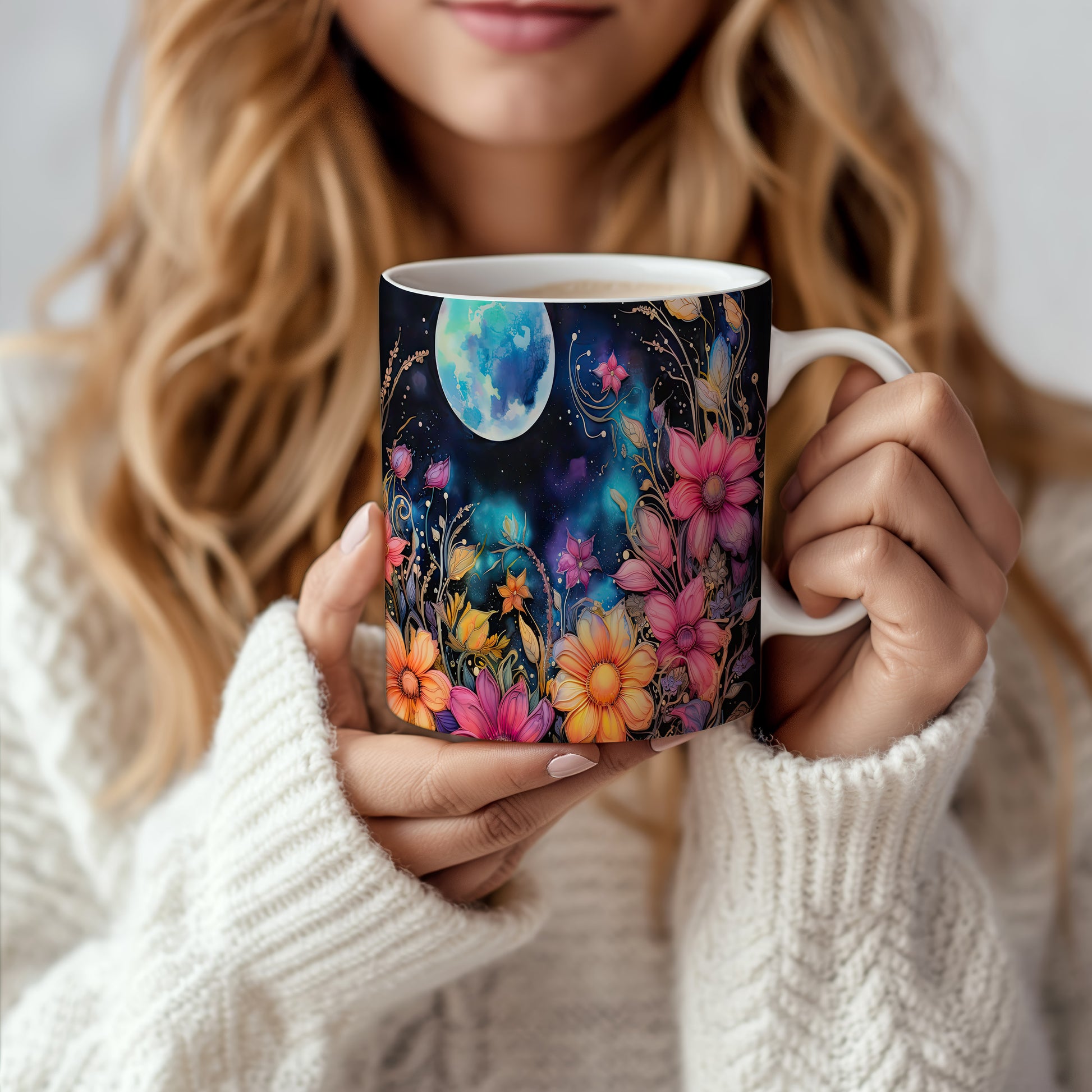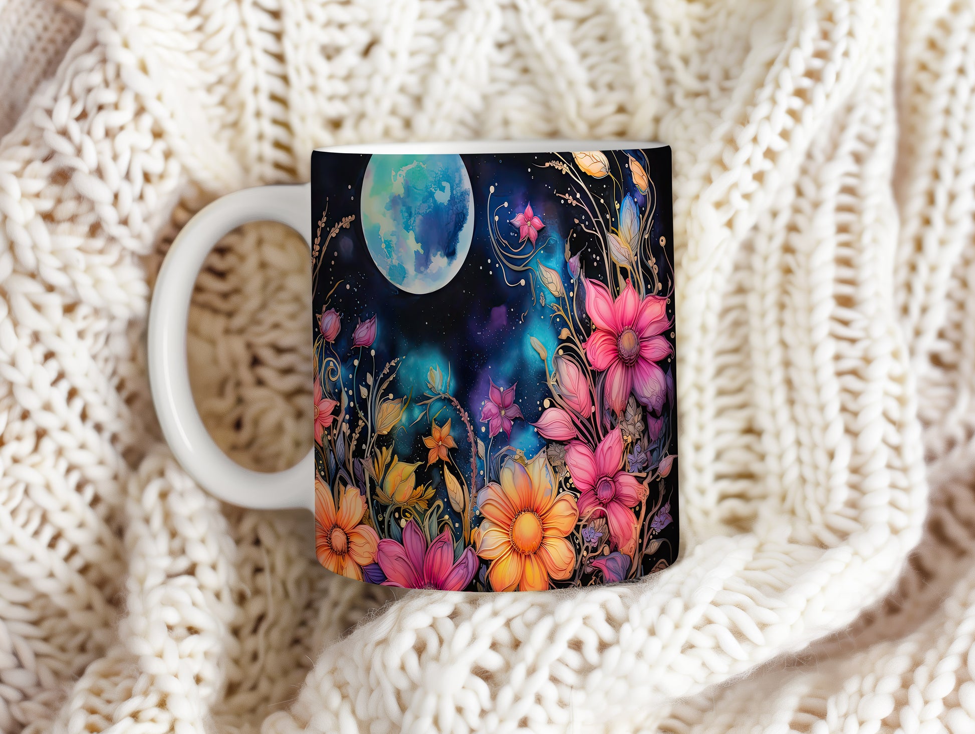 Hrnek s květinovým motivem a měsíčním pozadím
