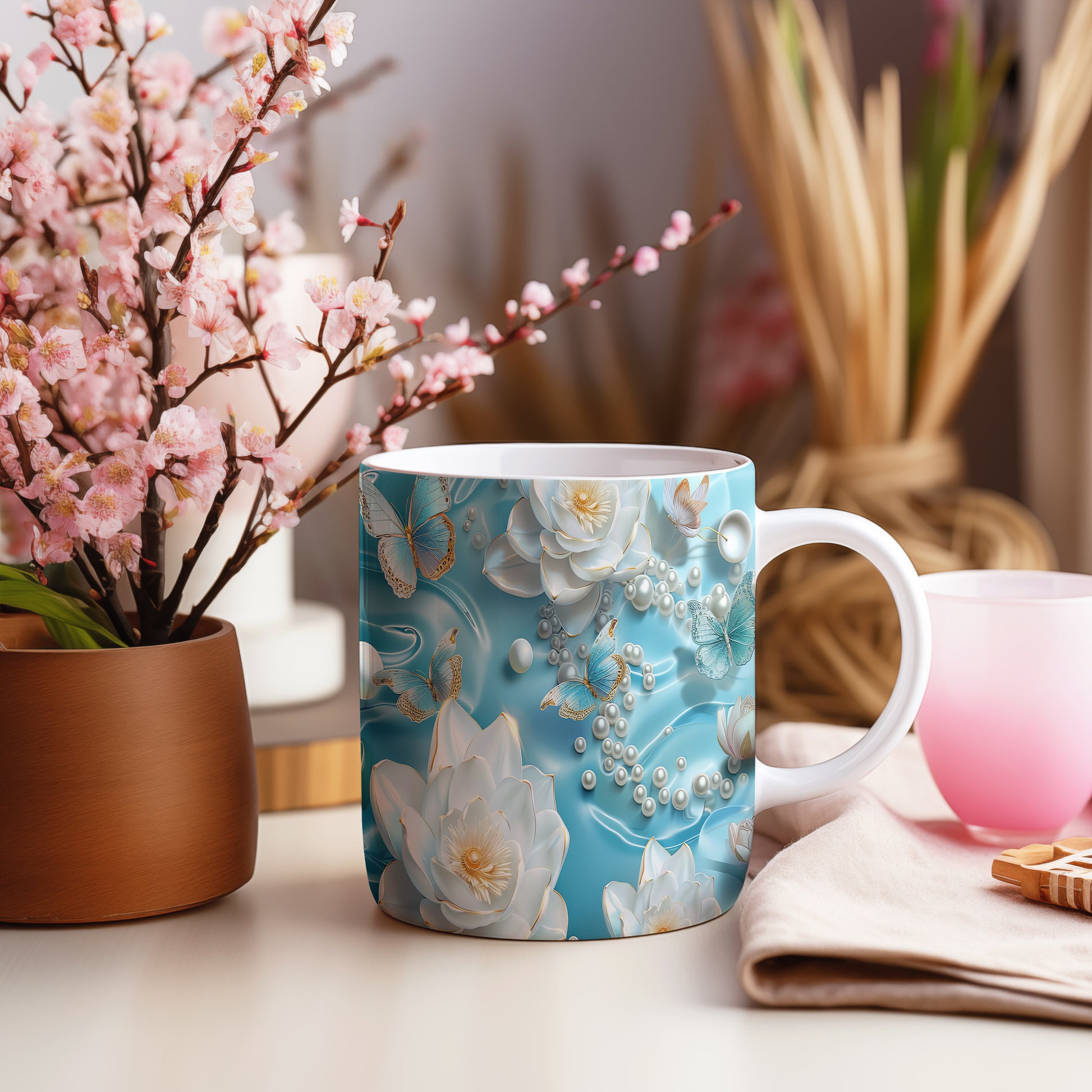 Hrnek s květinovým motivem a modrými motýly – modrými detaily