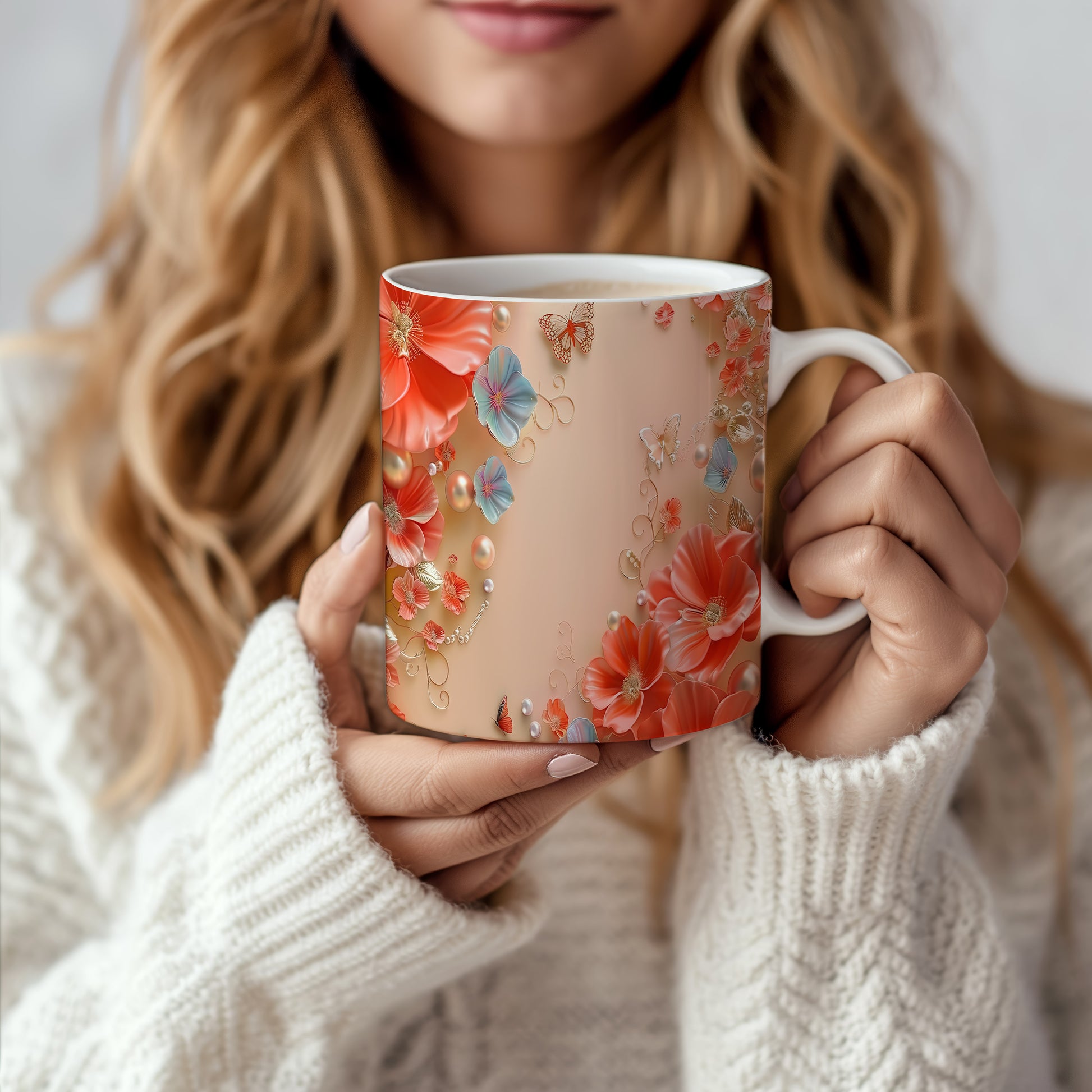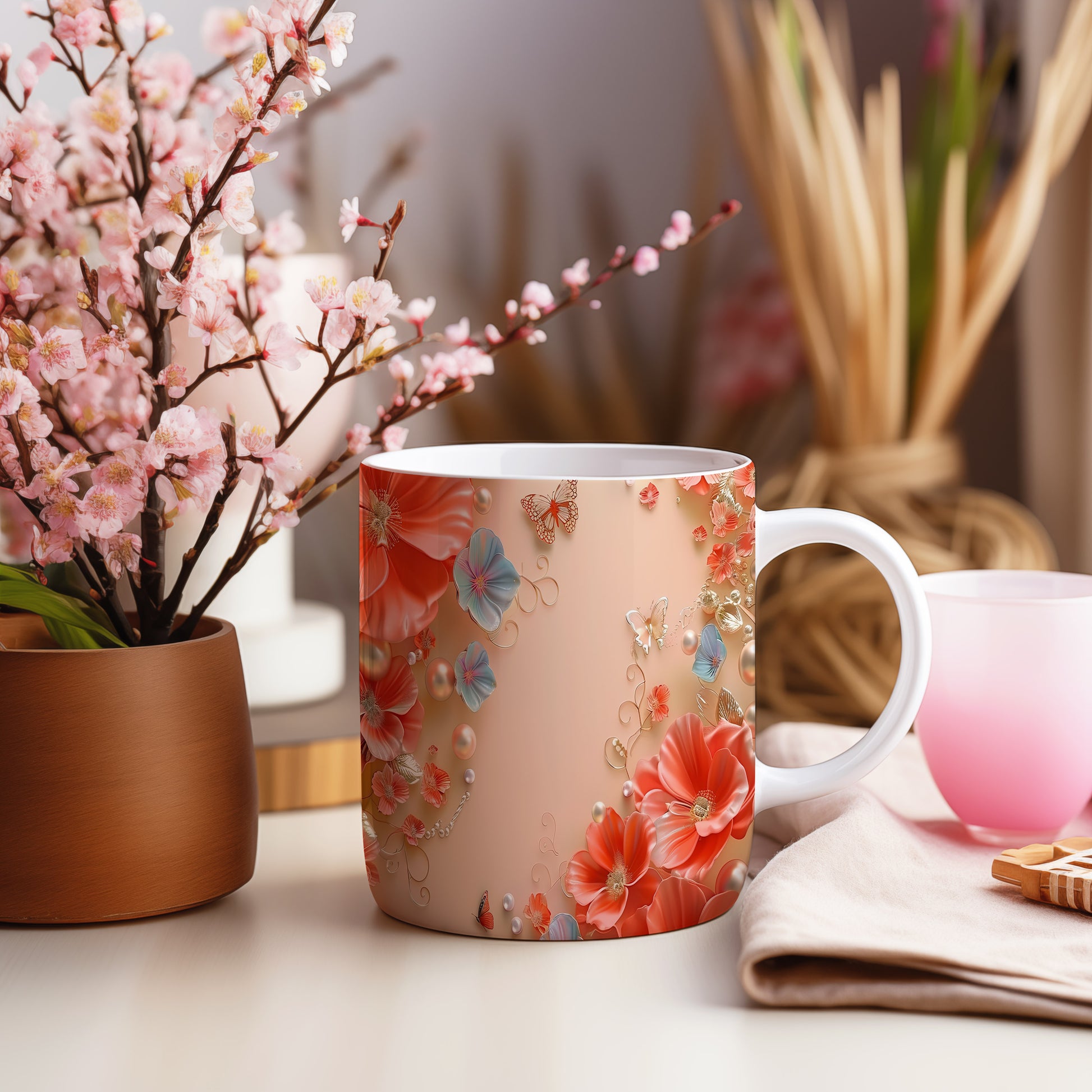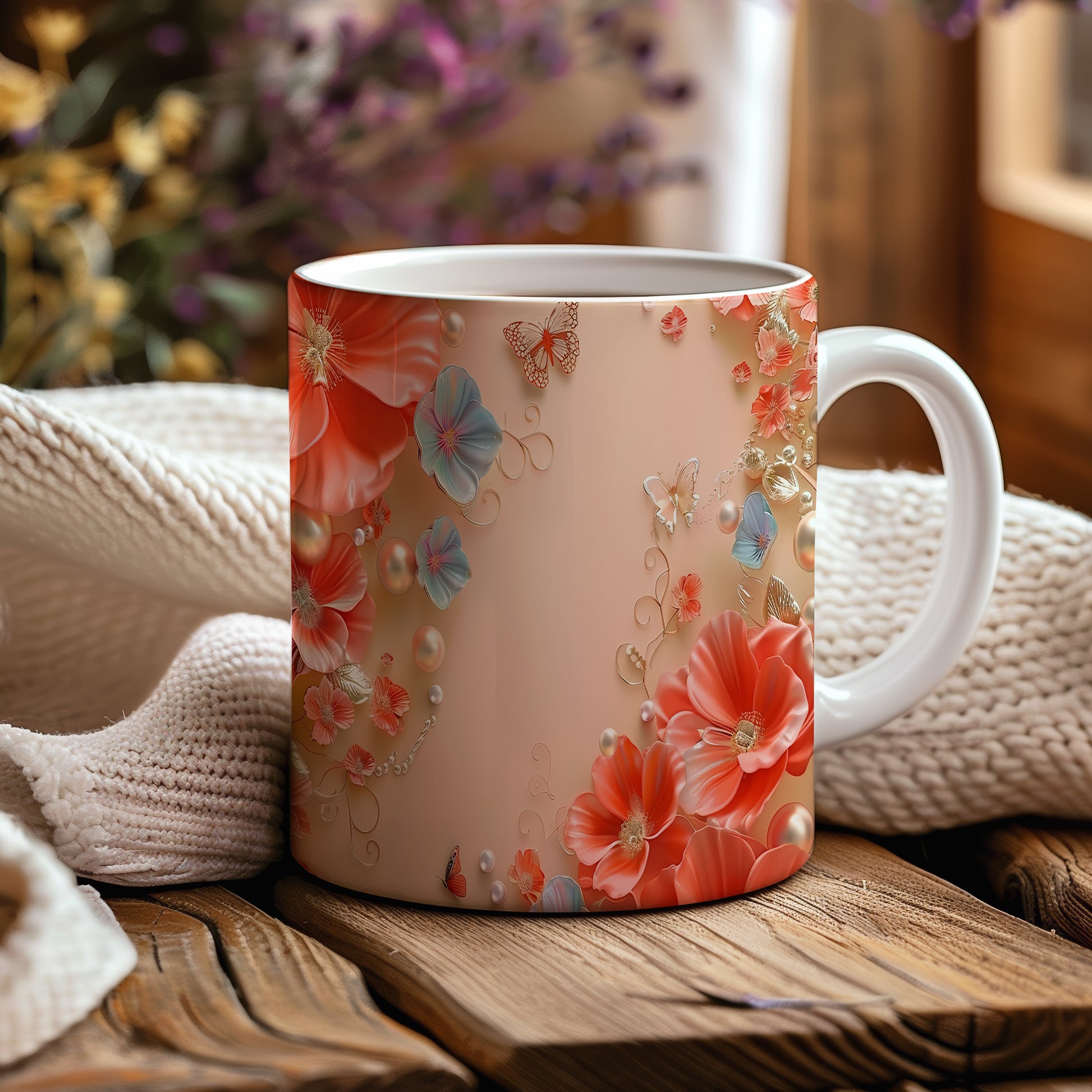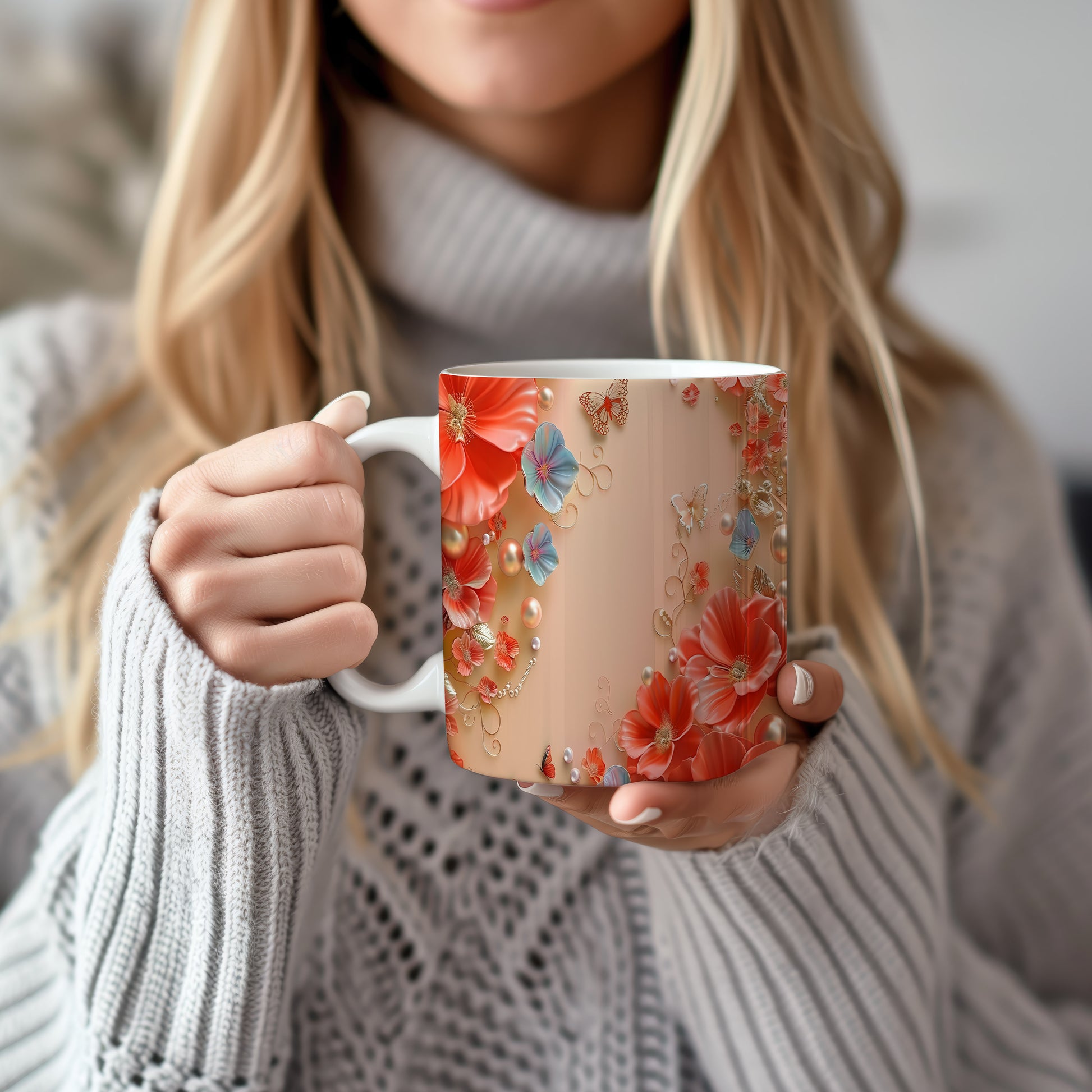Hrnek s květinovým motivem a motýly – 3D efektem