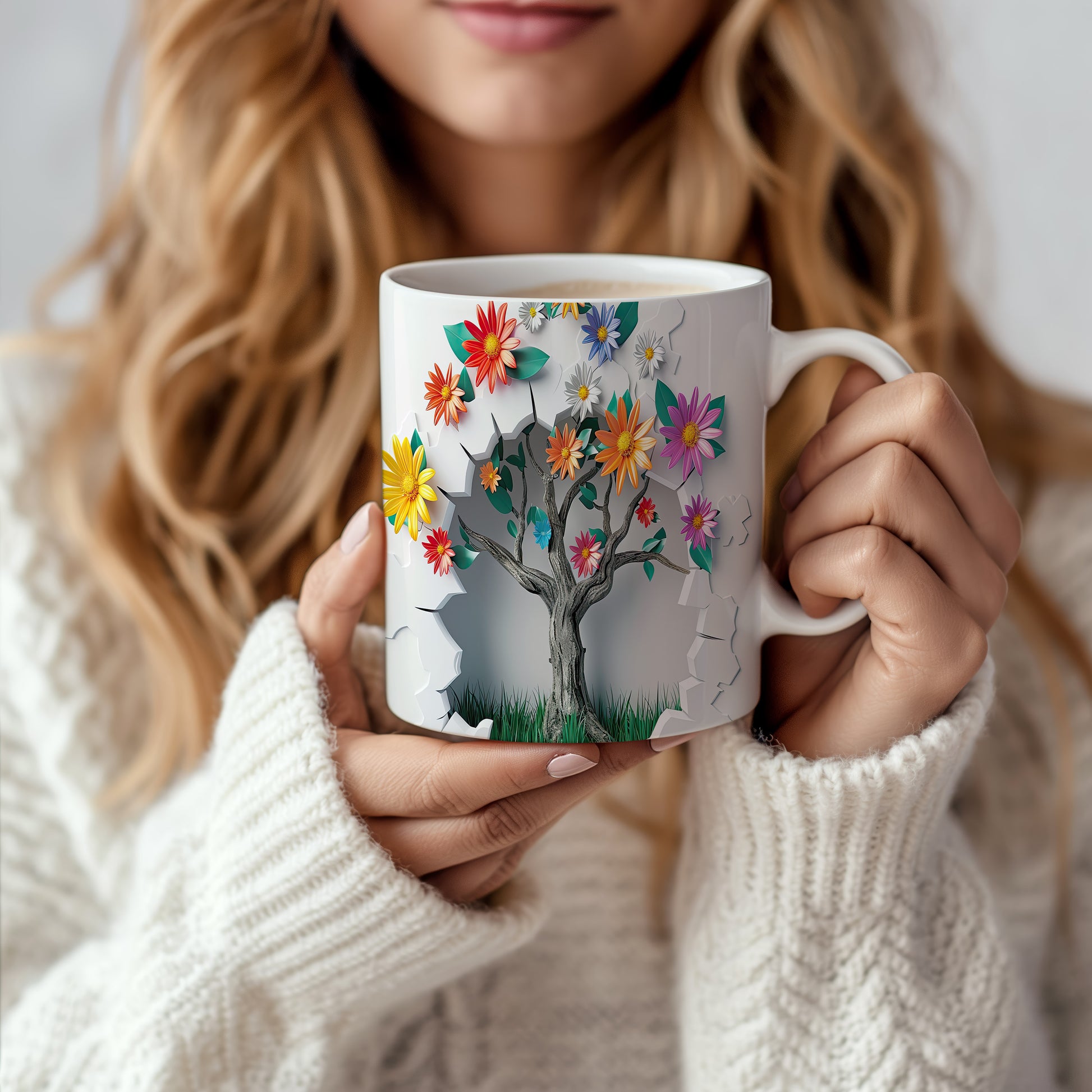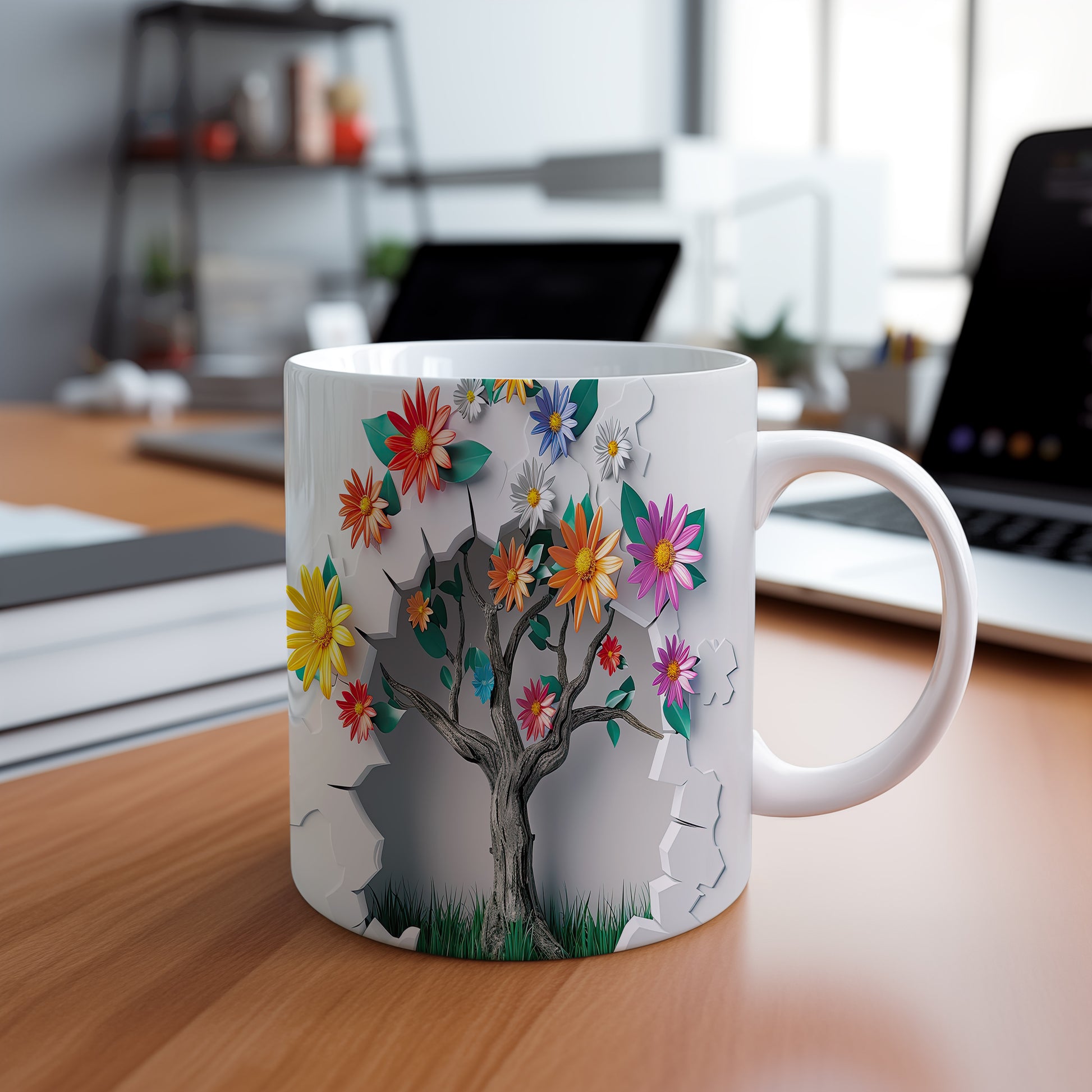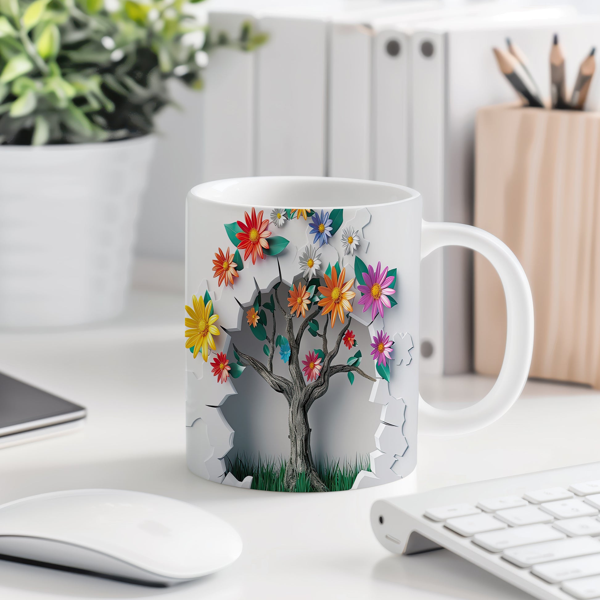 Hrnek s květinovým motivem a stromem – 3D efektem