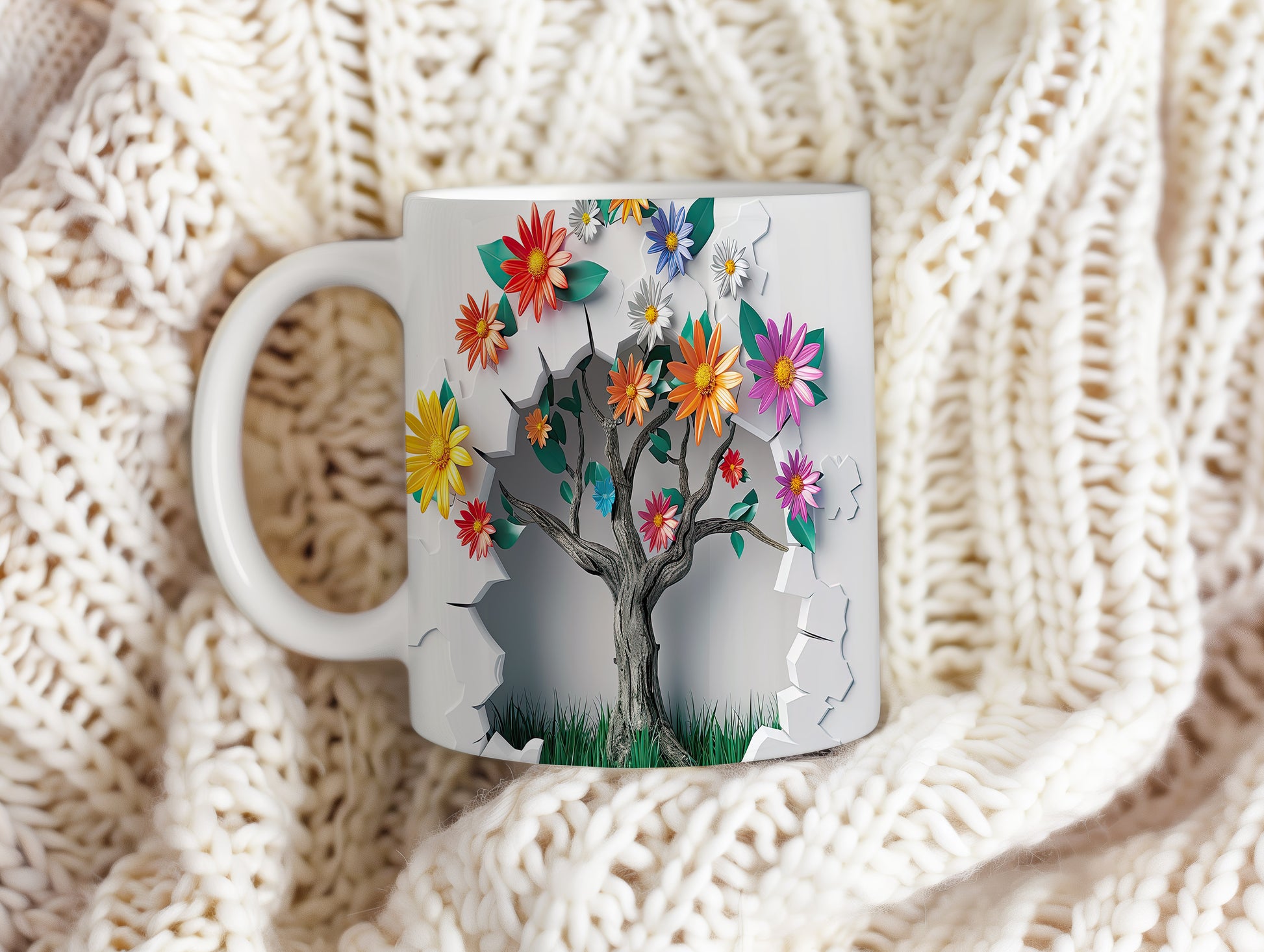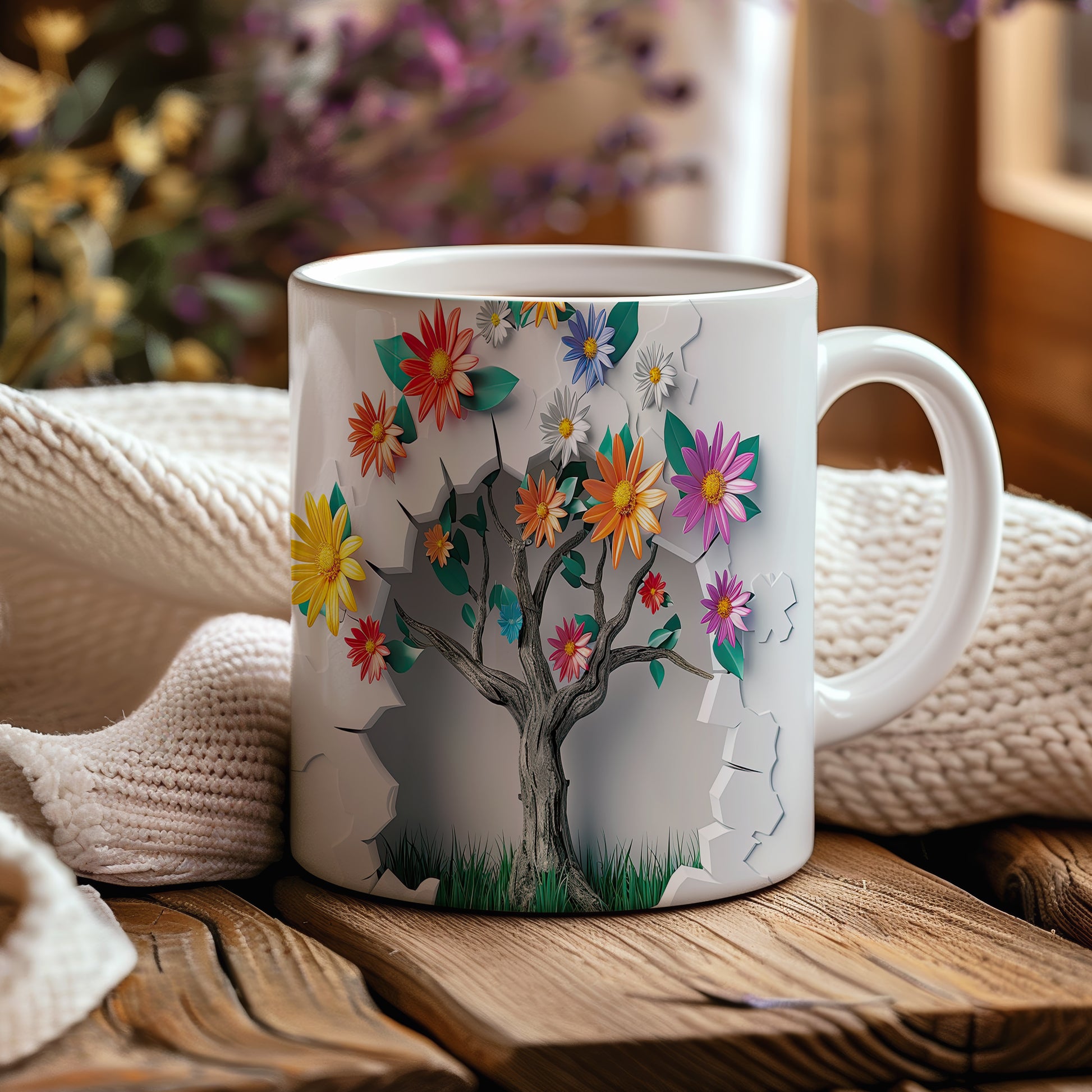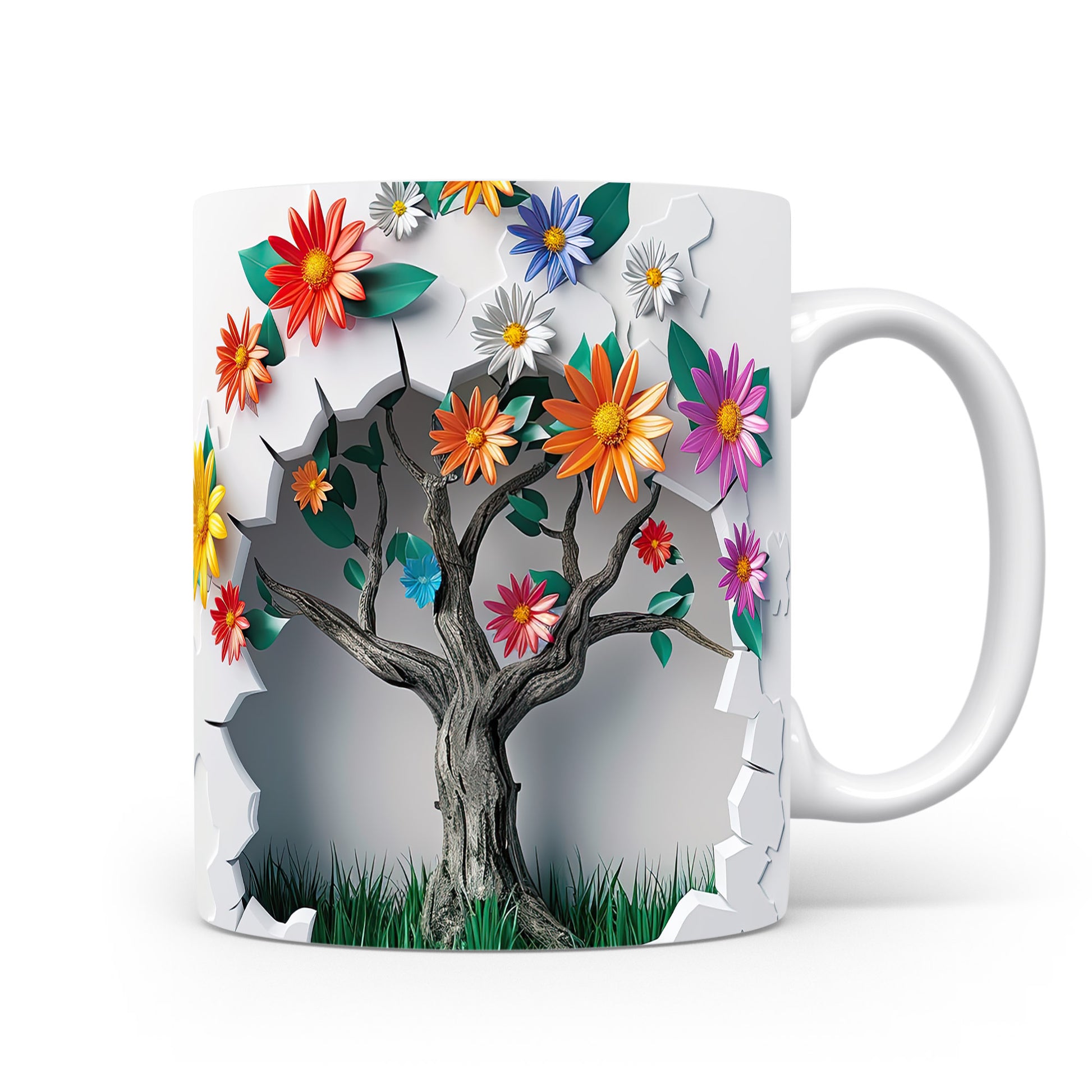 Hrnek s květinovým motivem a stromem – 3D efektem