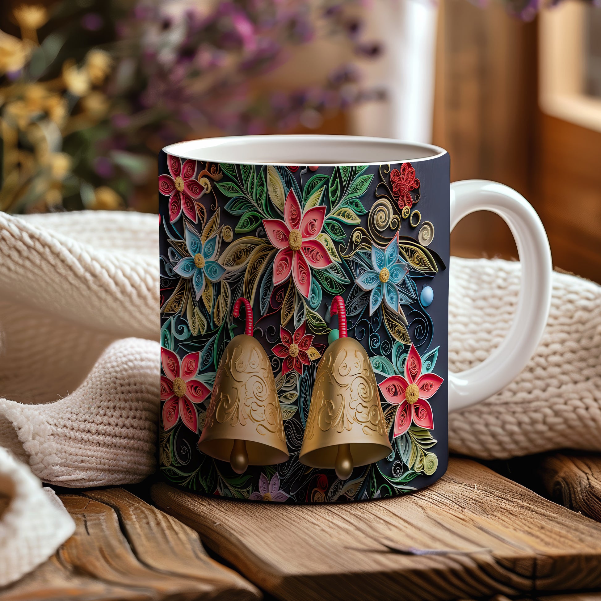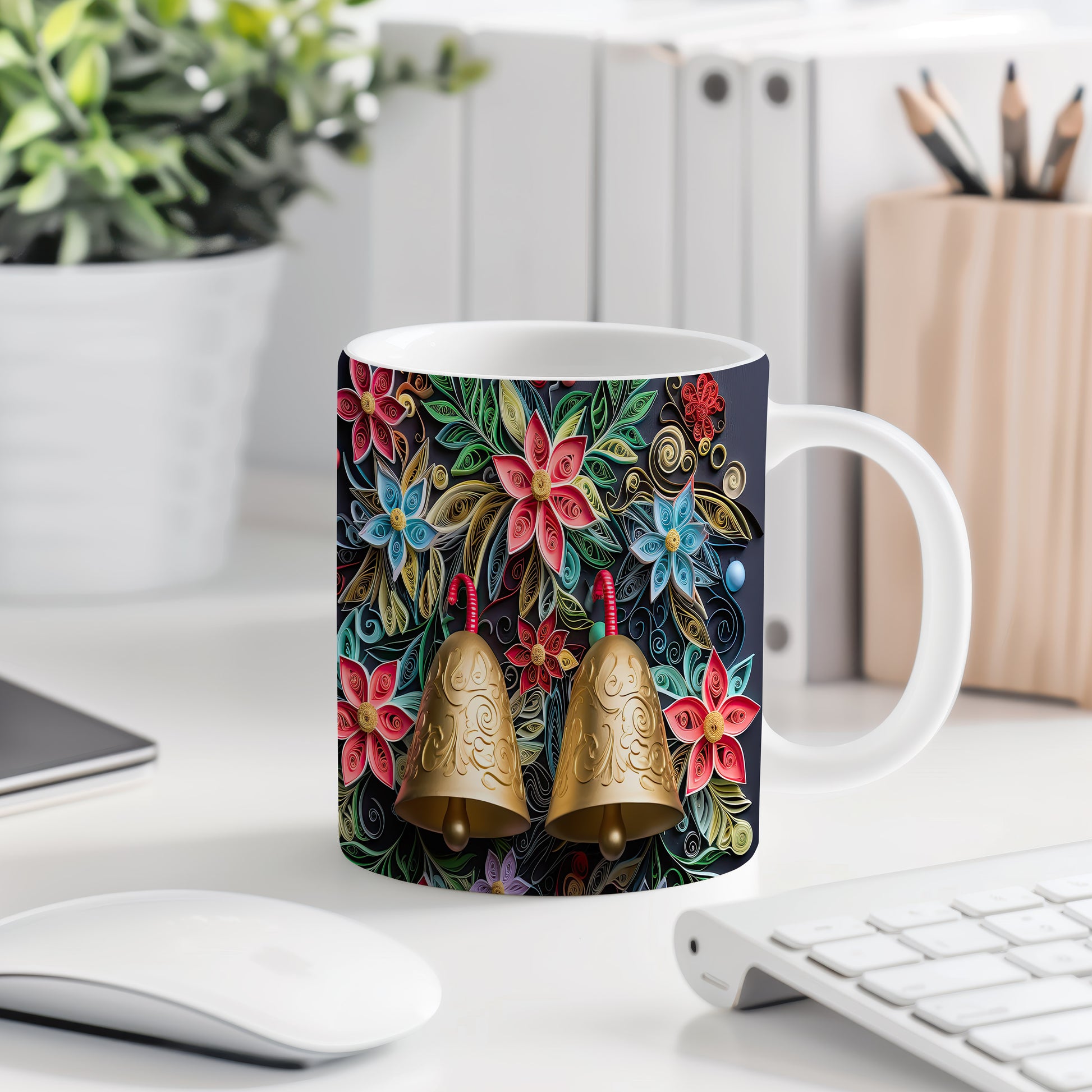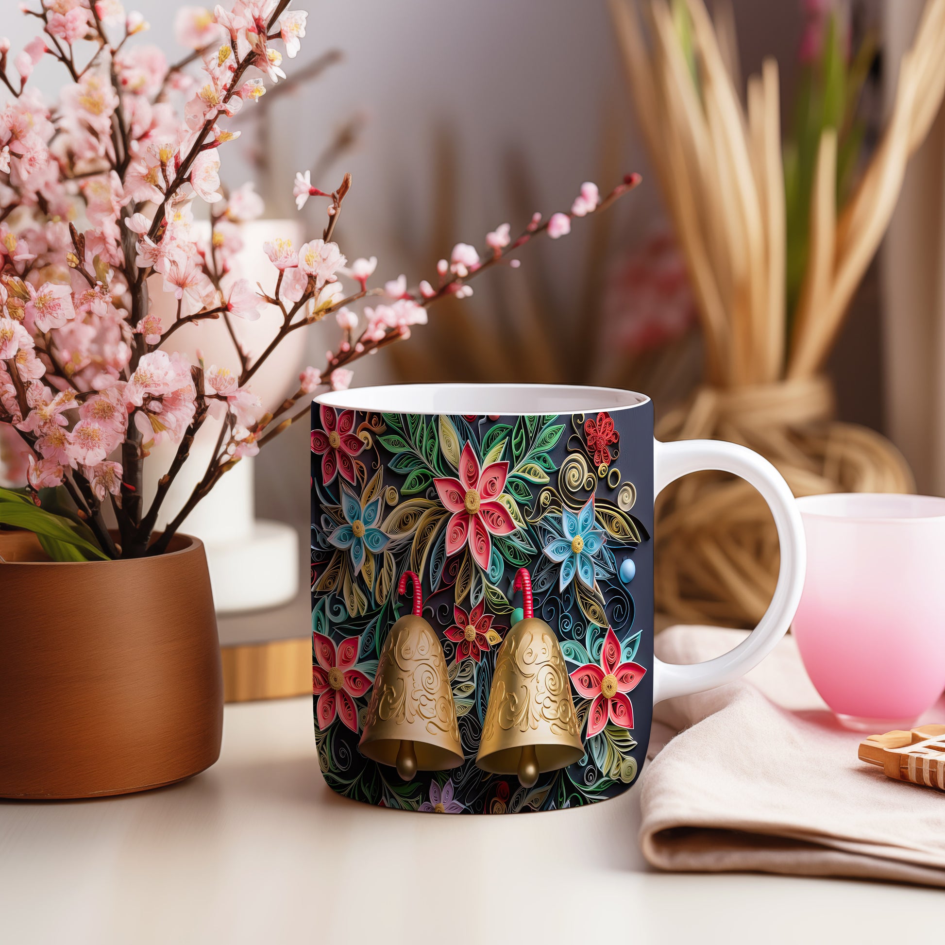 Hrnek s květinovým motivem a zlatými zvonky