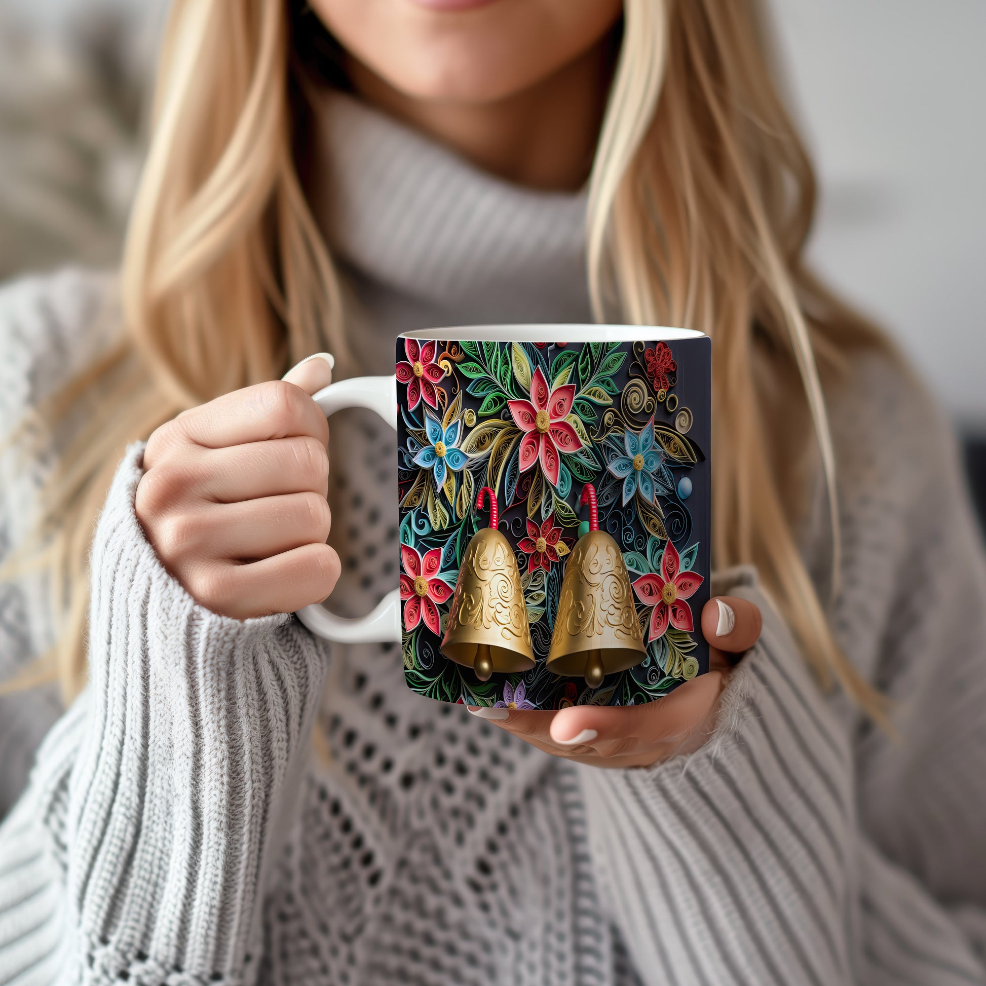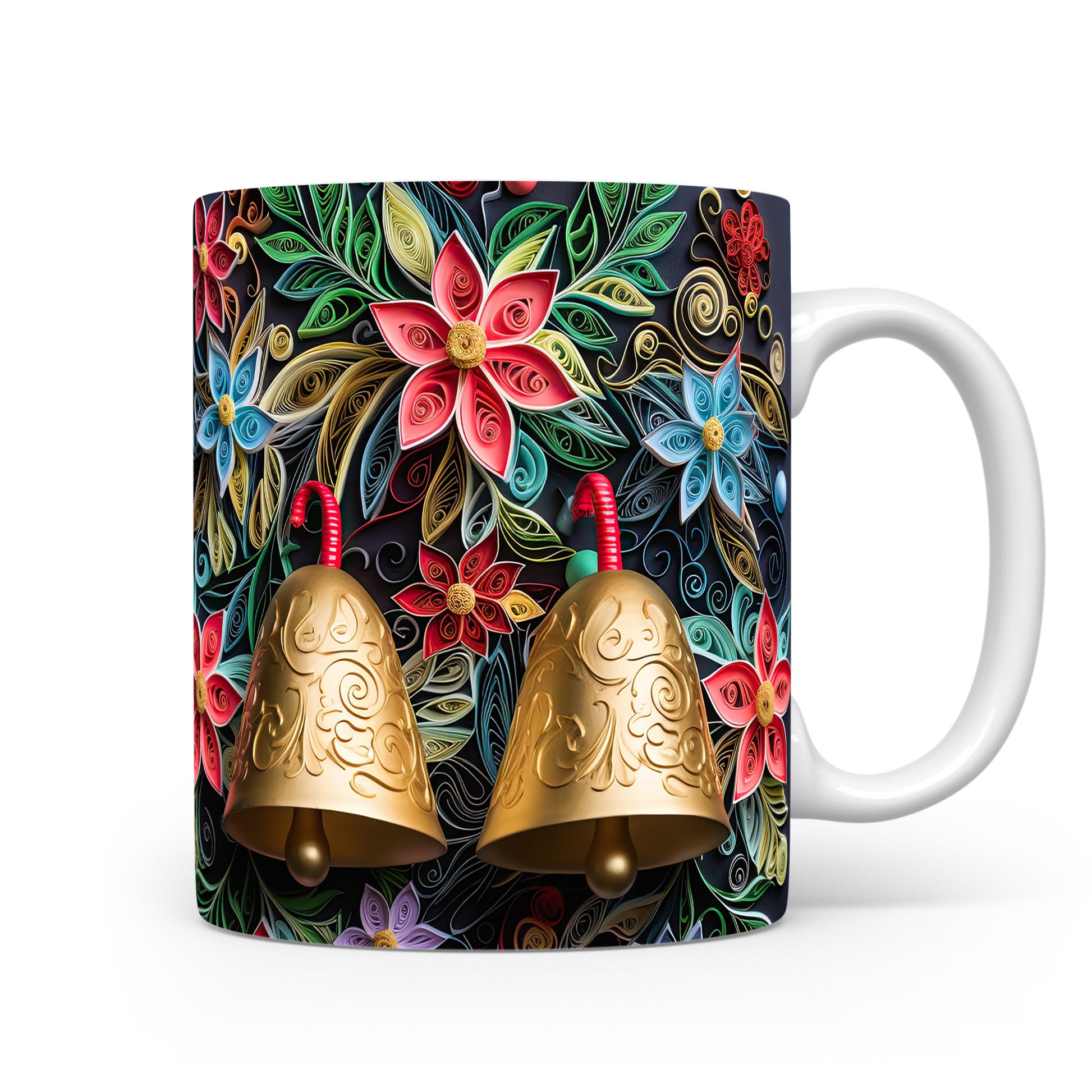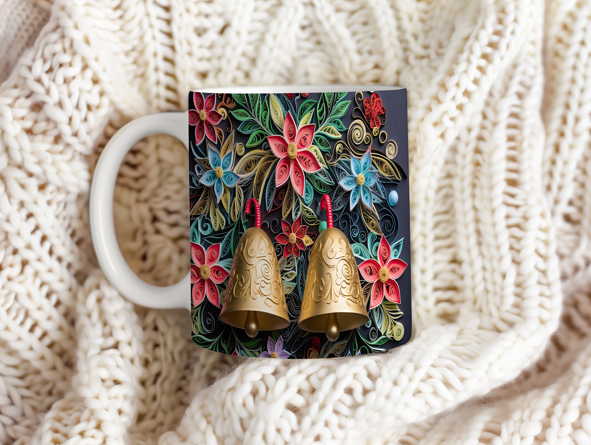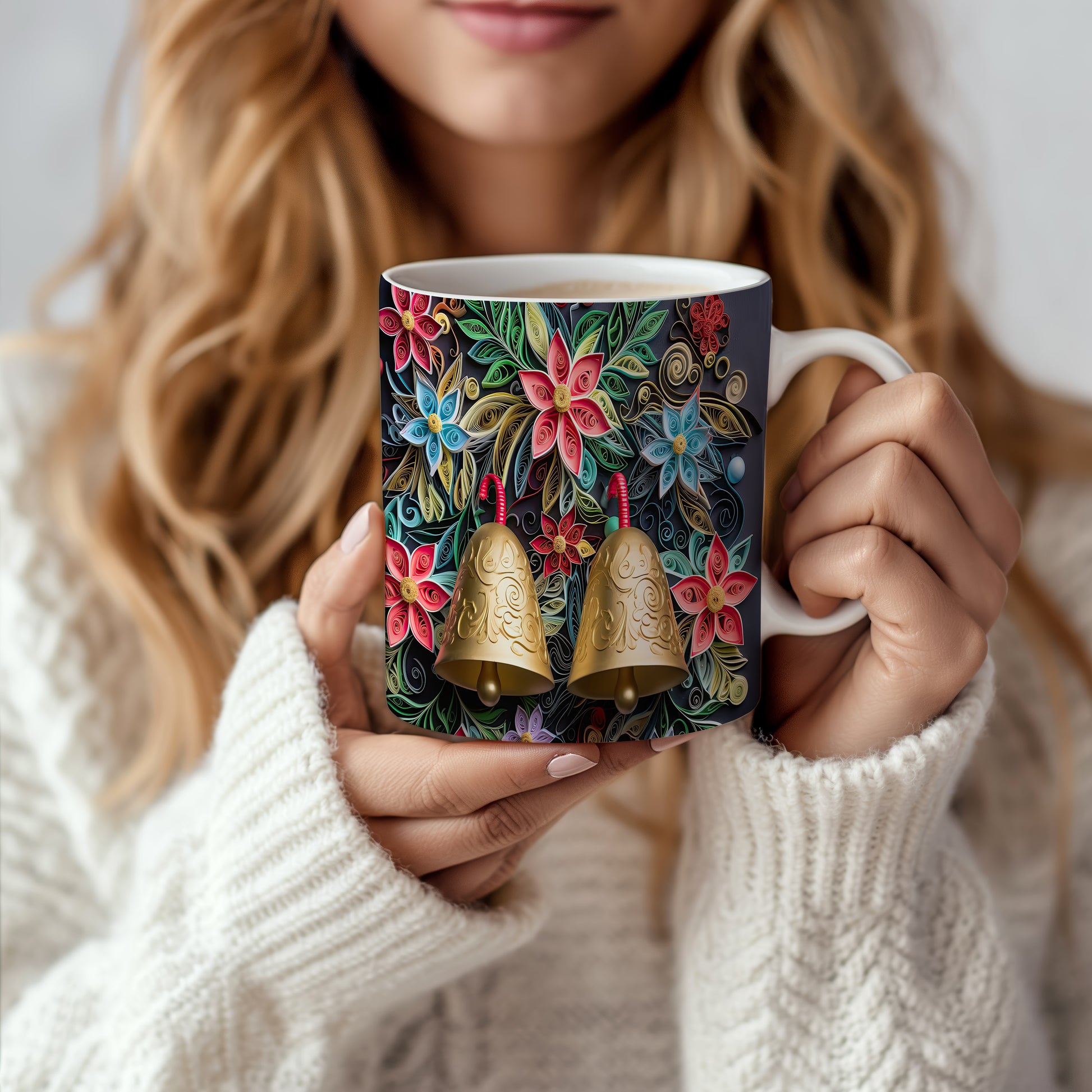 Hrnek s květinovým motivem a zlatými zvonky