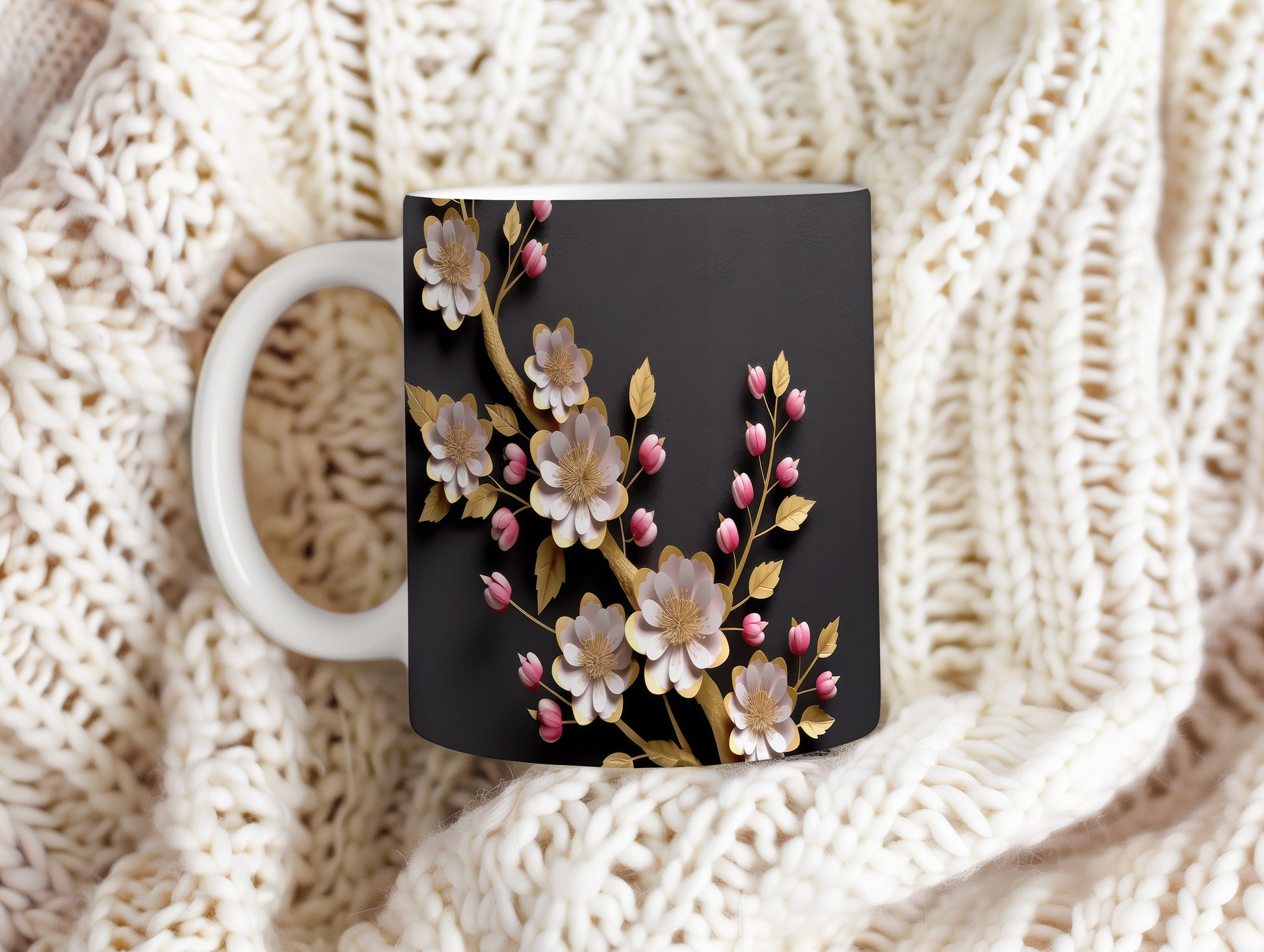 Hrnek s květinovým motivem na černém pozadí – černobílým motivem
