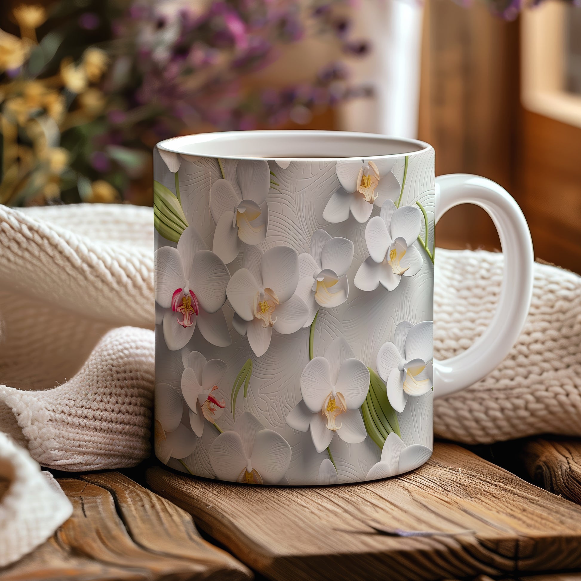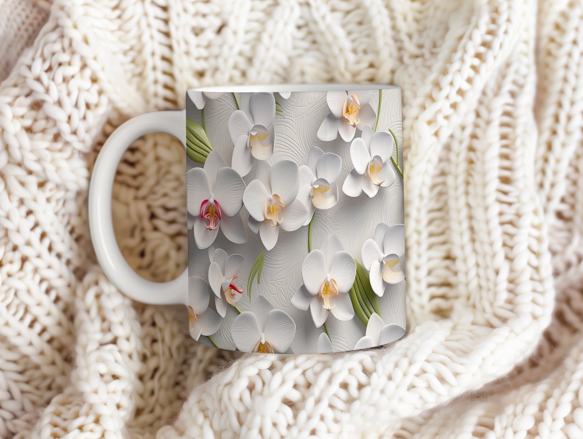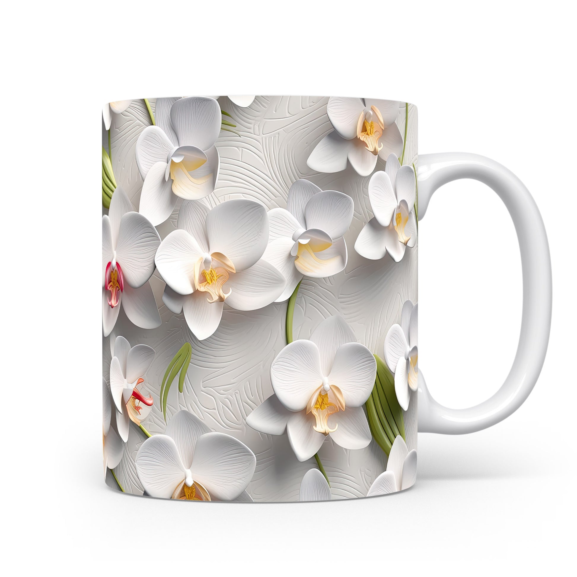 Hrnek s květinovým motivem orchidejí – bílým provedením