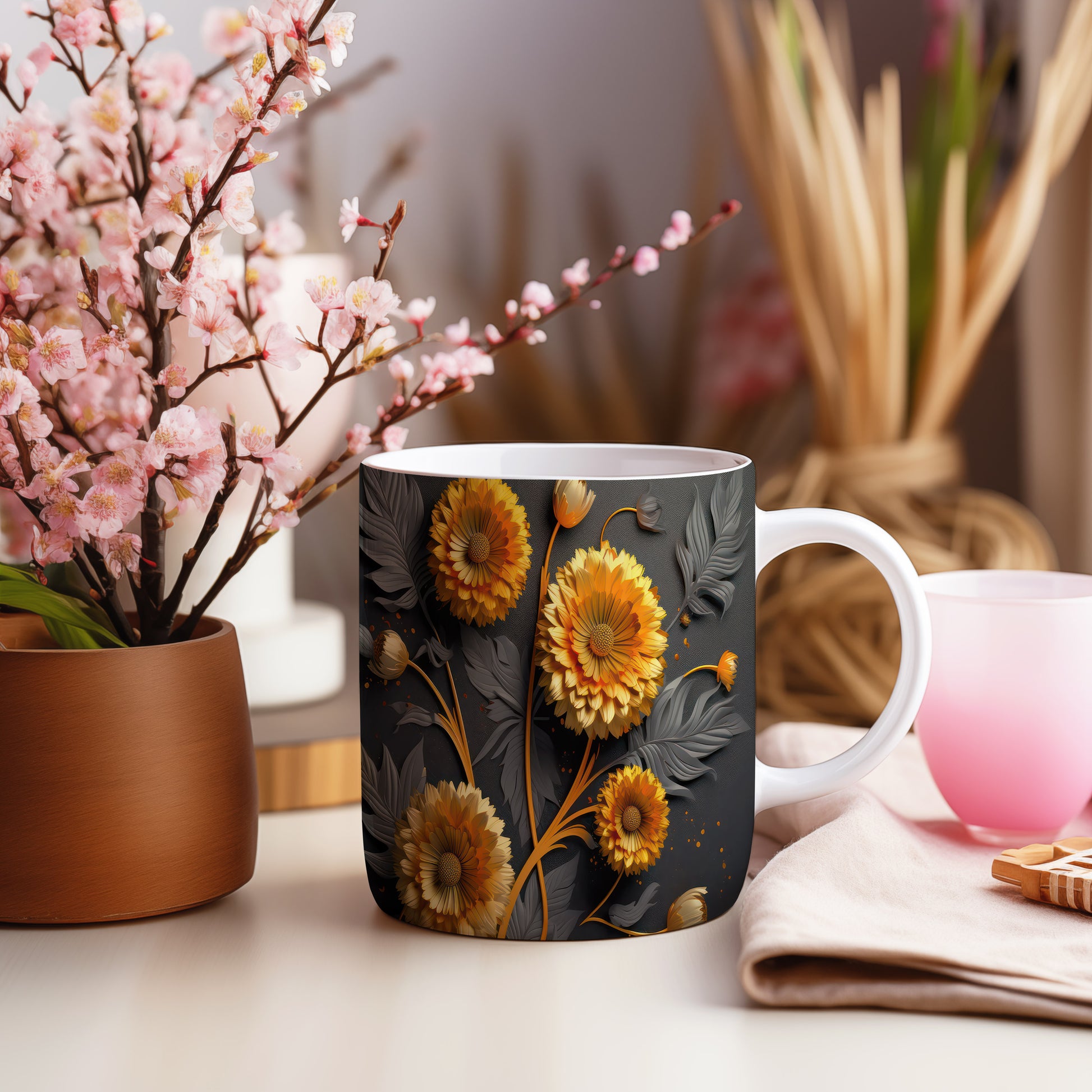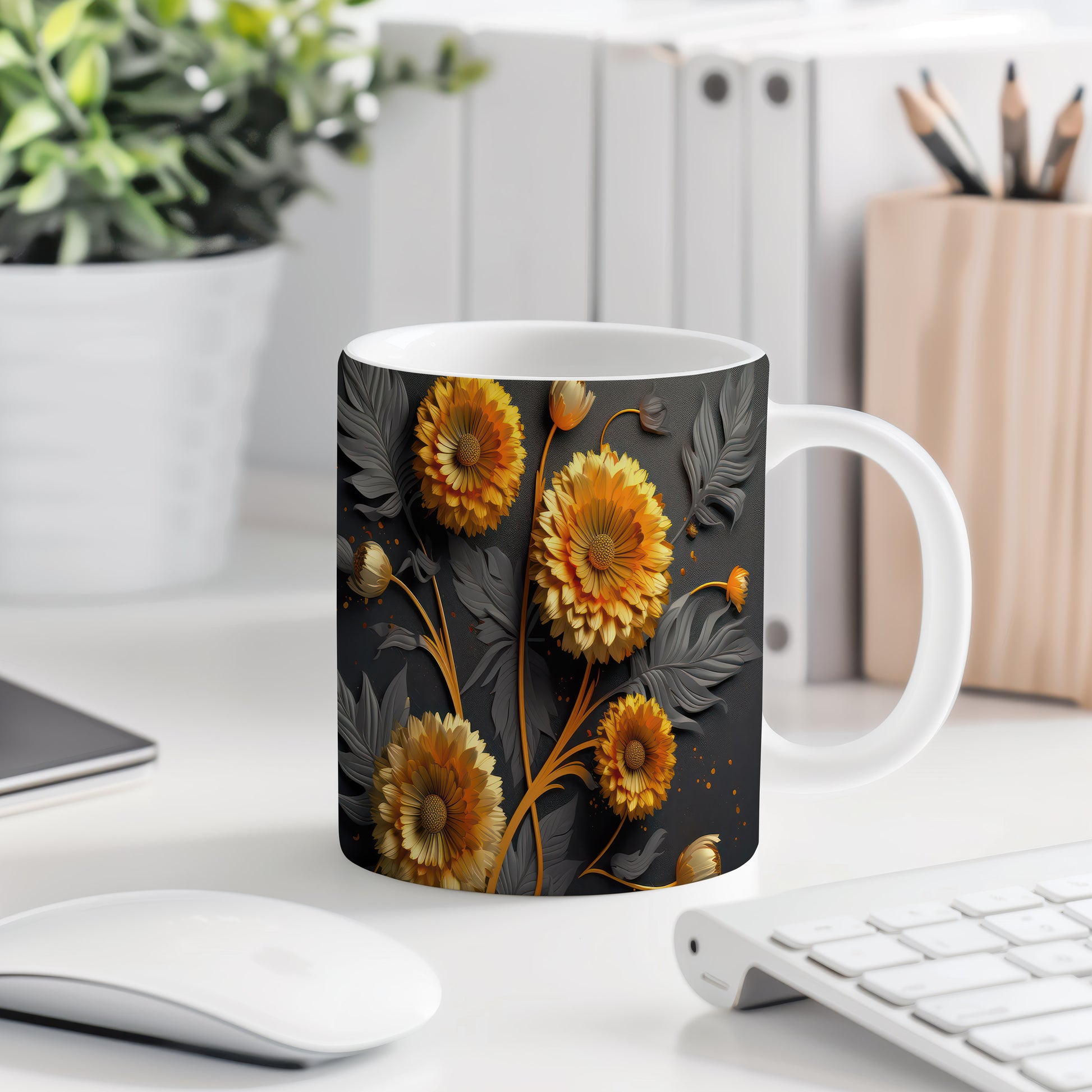Keramický hrnek s elegantním květinovým designem v oranžových a černých odstínech. Tento hrnek je ideální pro každodenní použití a skvělým dárkem pro milovníky přírody. Materiál: keramika. Objem: 330 ml. Vhodné do myčky i mikrovlnky. Užívejte si svůj oblíbený nápoj s tímto stylovým hrnkem, který přináší radost do každého dne.