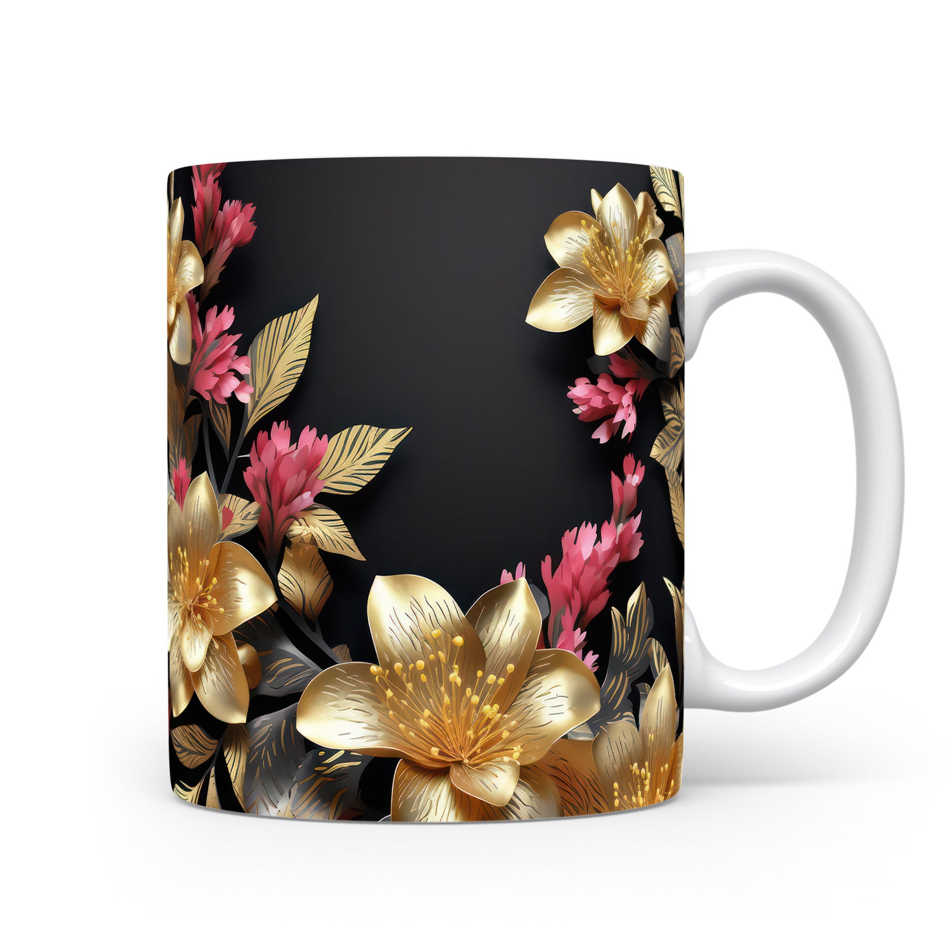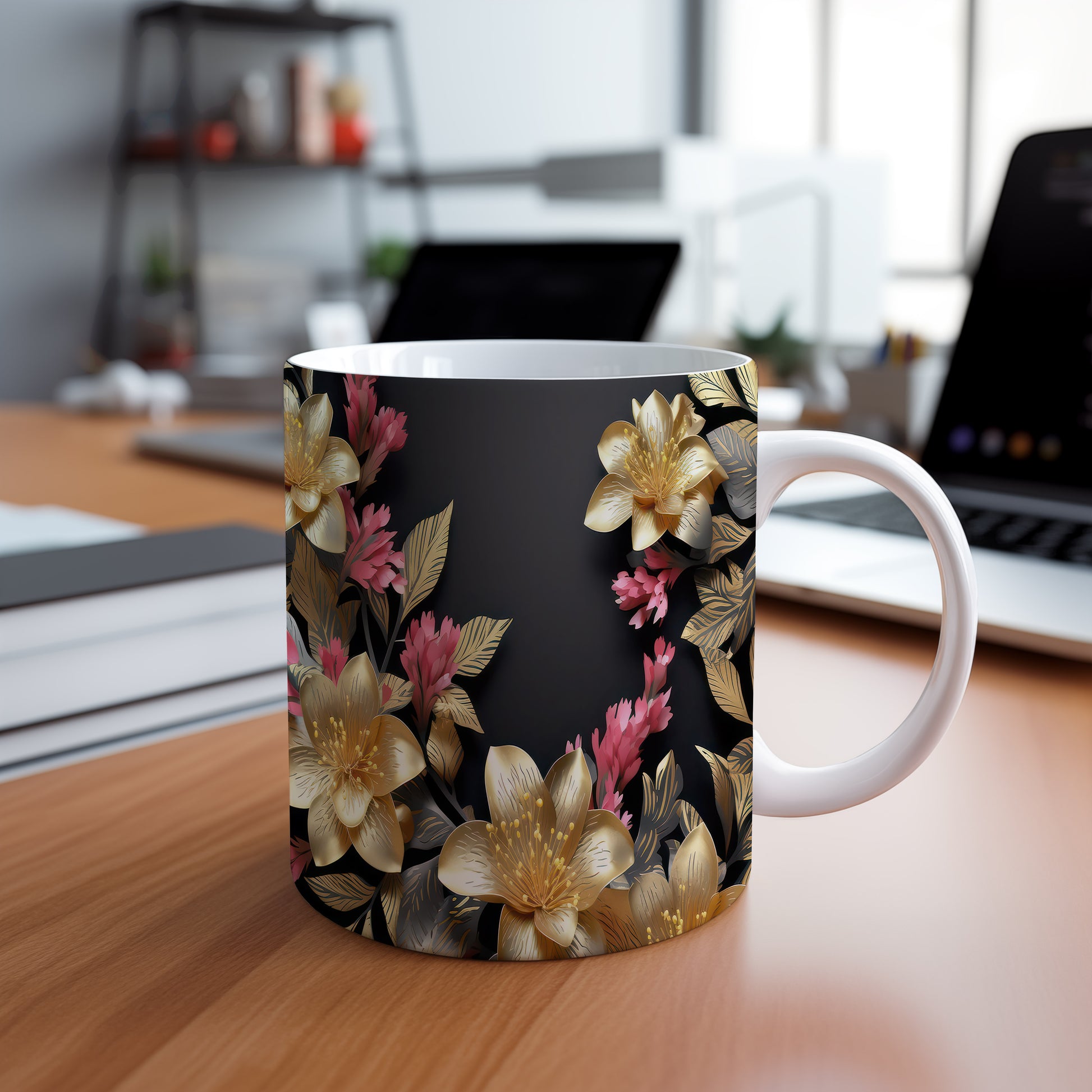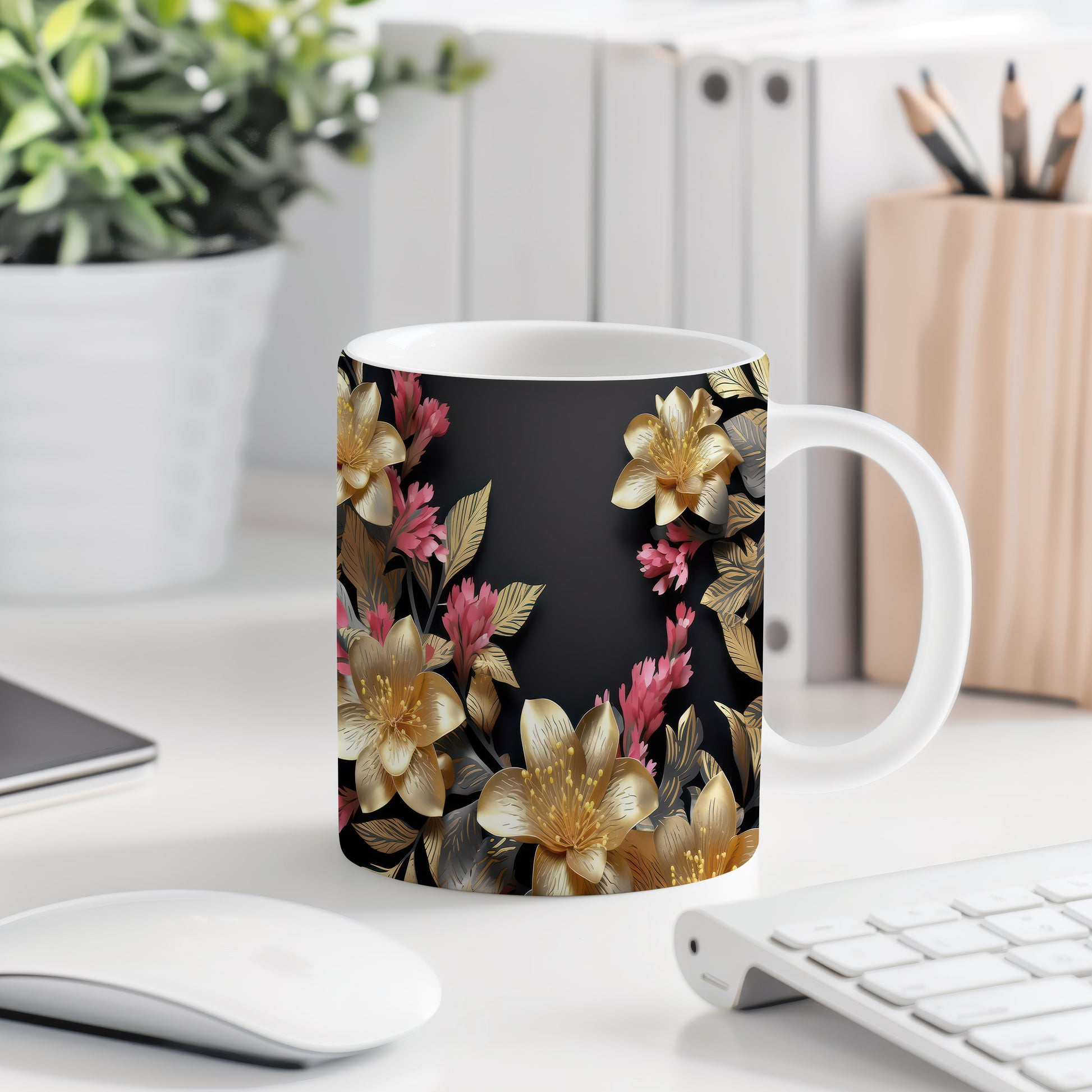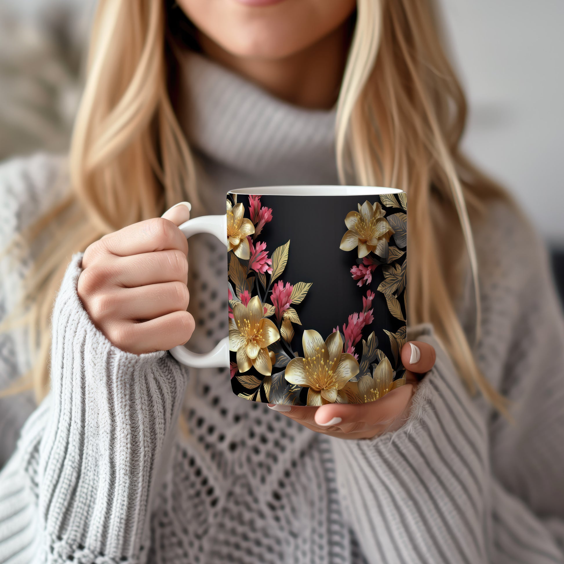 Elegantní hrnek s květinovým motivem a zlatými detaily. Tento stylový kousek je ideální pro milovníky krásného designu a skvělý tip na dárek pro vaše blízké. Materiál: keramika. Objem: 330 ml. Vhodné do myčky i mikrovlnky. Užívejte si svůj oblíbený nápoj s nádechem elegance.