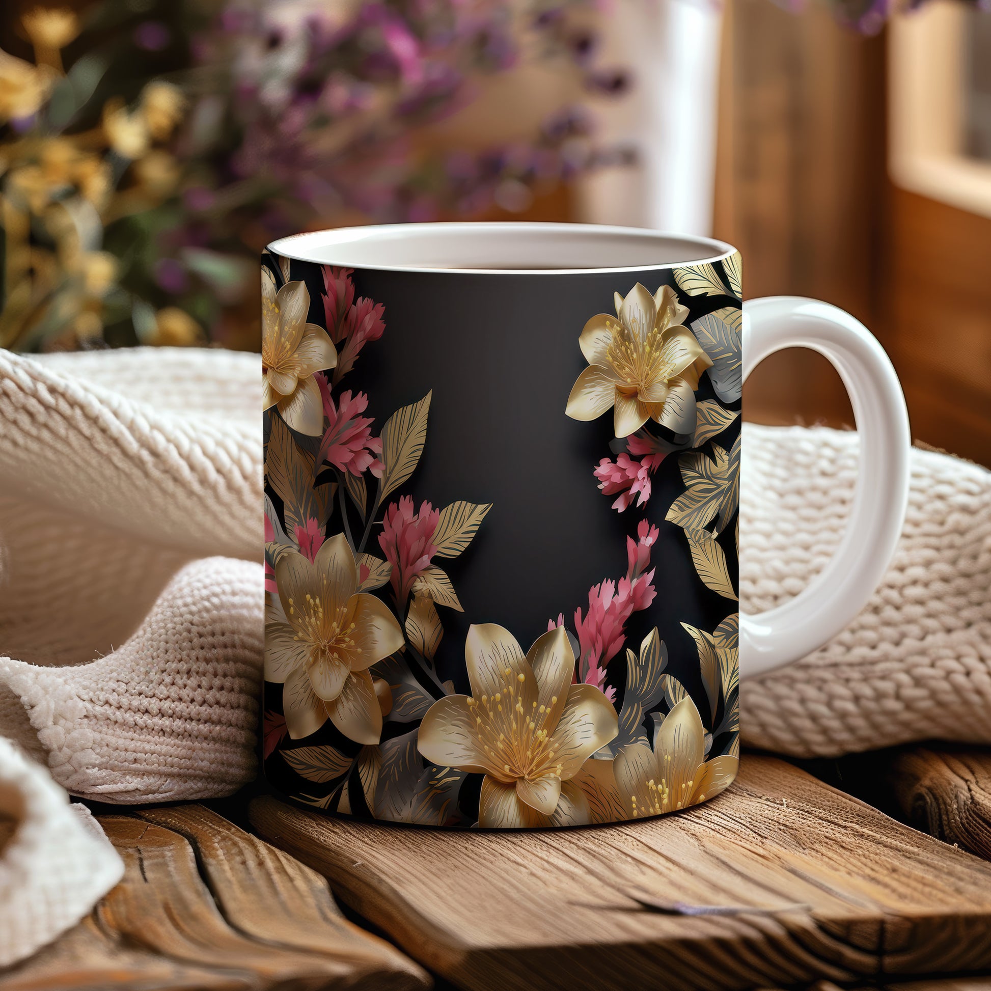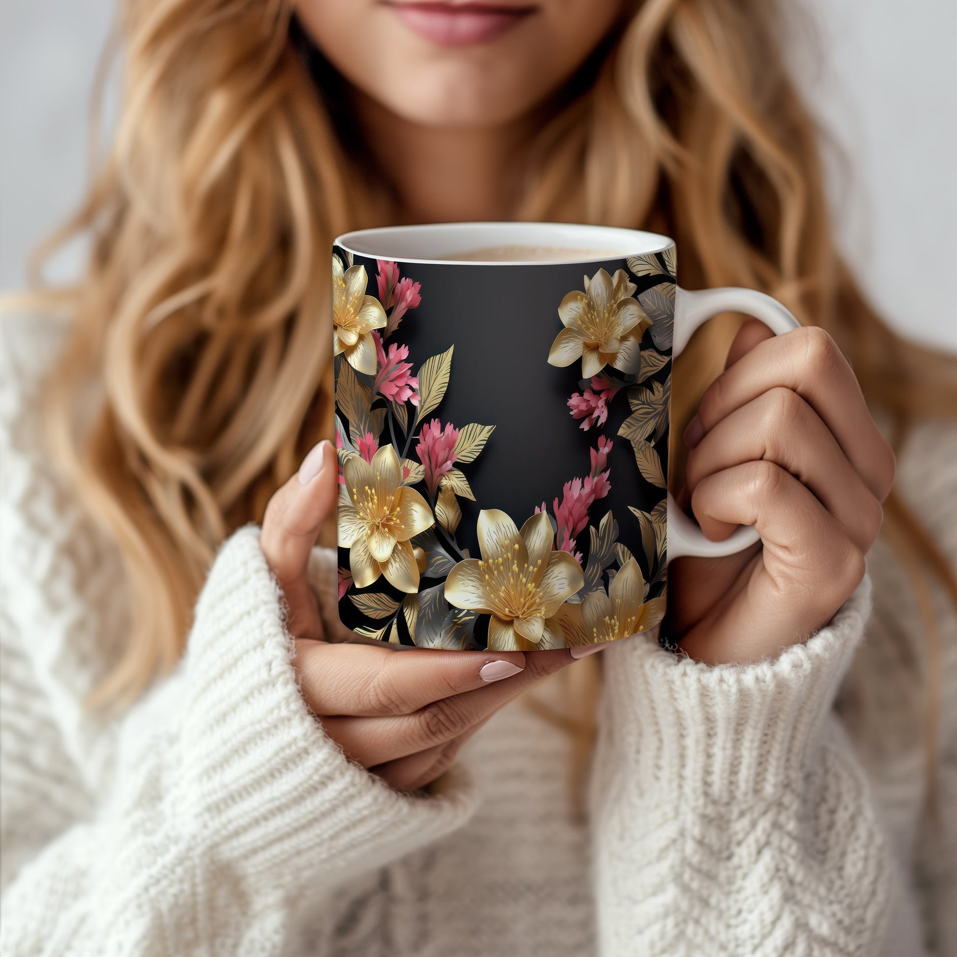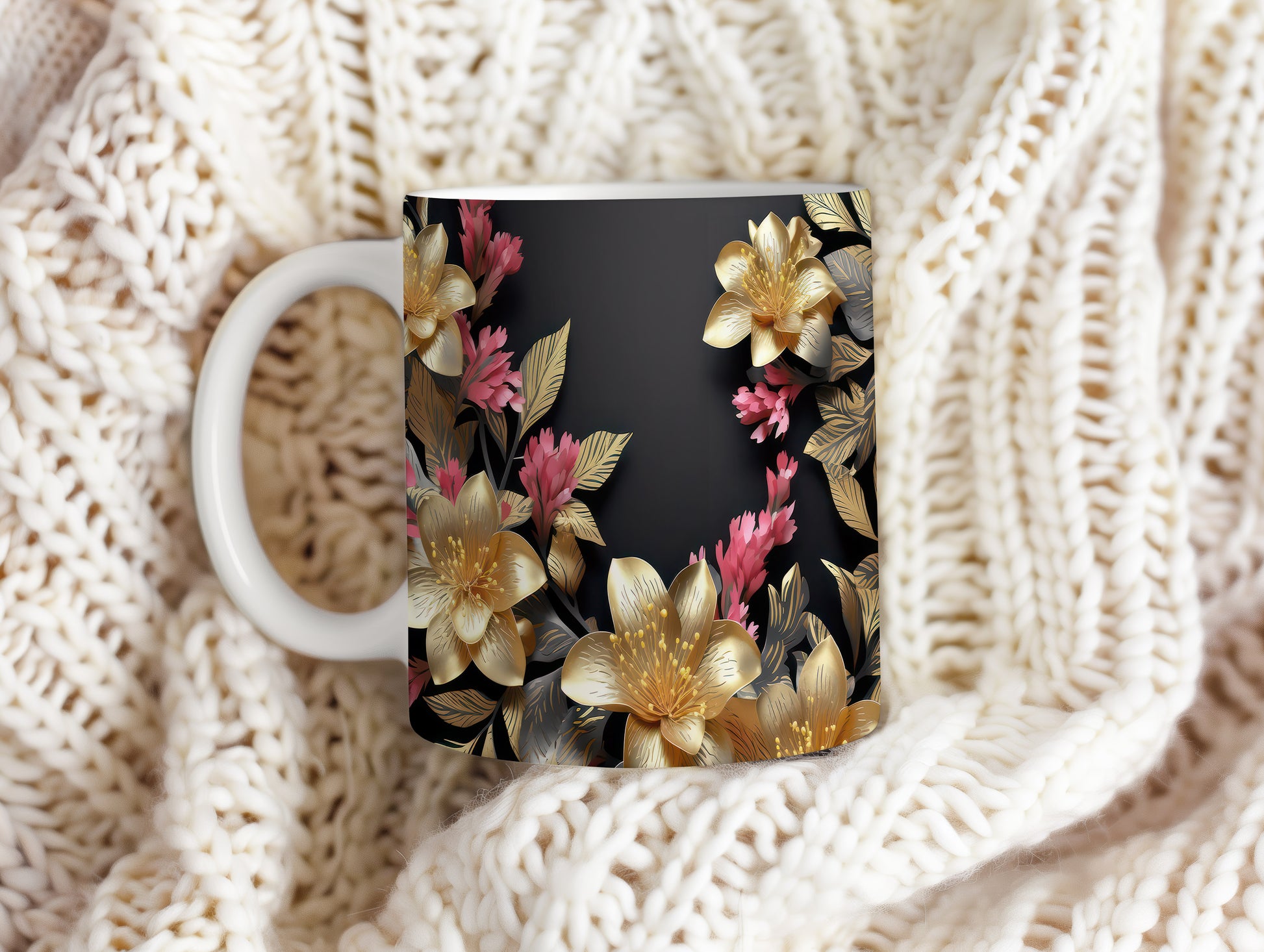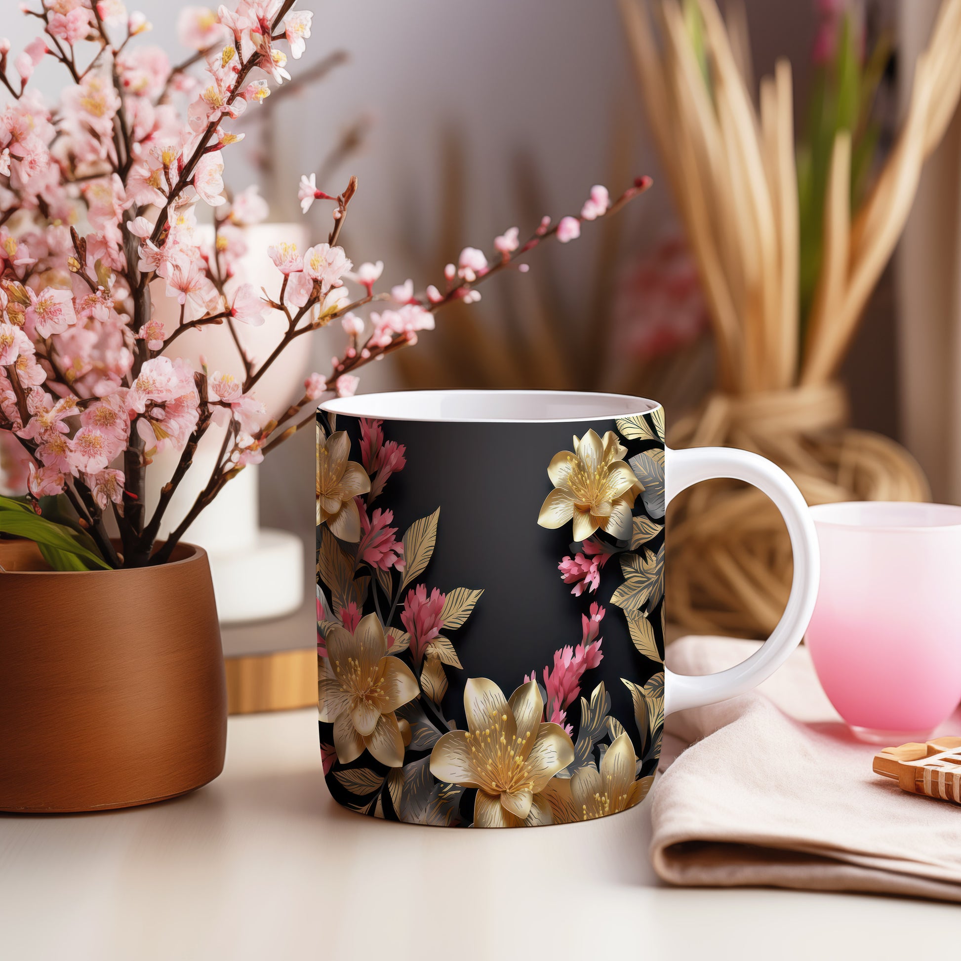Elegantní hrnek s květinovým motivem a zlatými detaily. Tento stylový kousek je ideální pro milovníky krásného designu a skvělý tip na dárek pro vaše blízké. Materiál: keramika. Objem: 330 ml. Vhodné do myčky i mikrovlnky. Užívejte si svůj oblíbený nápoj s nádechem elegance.