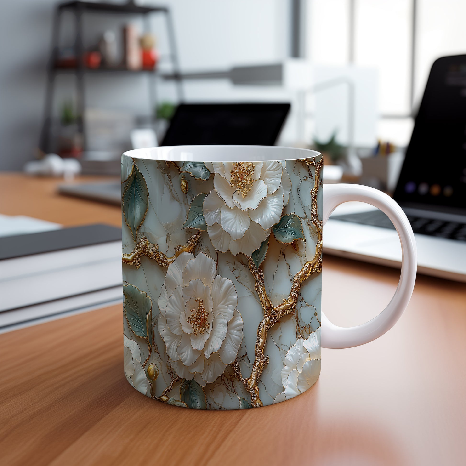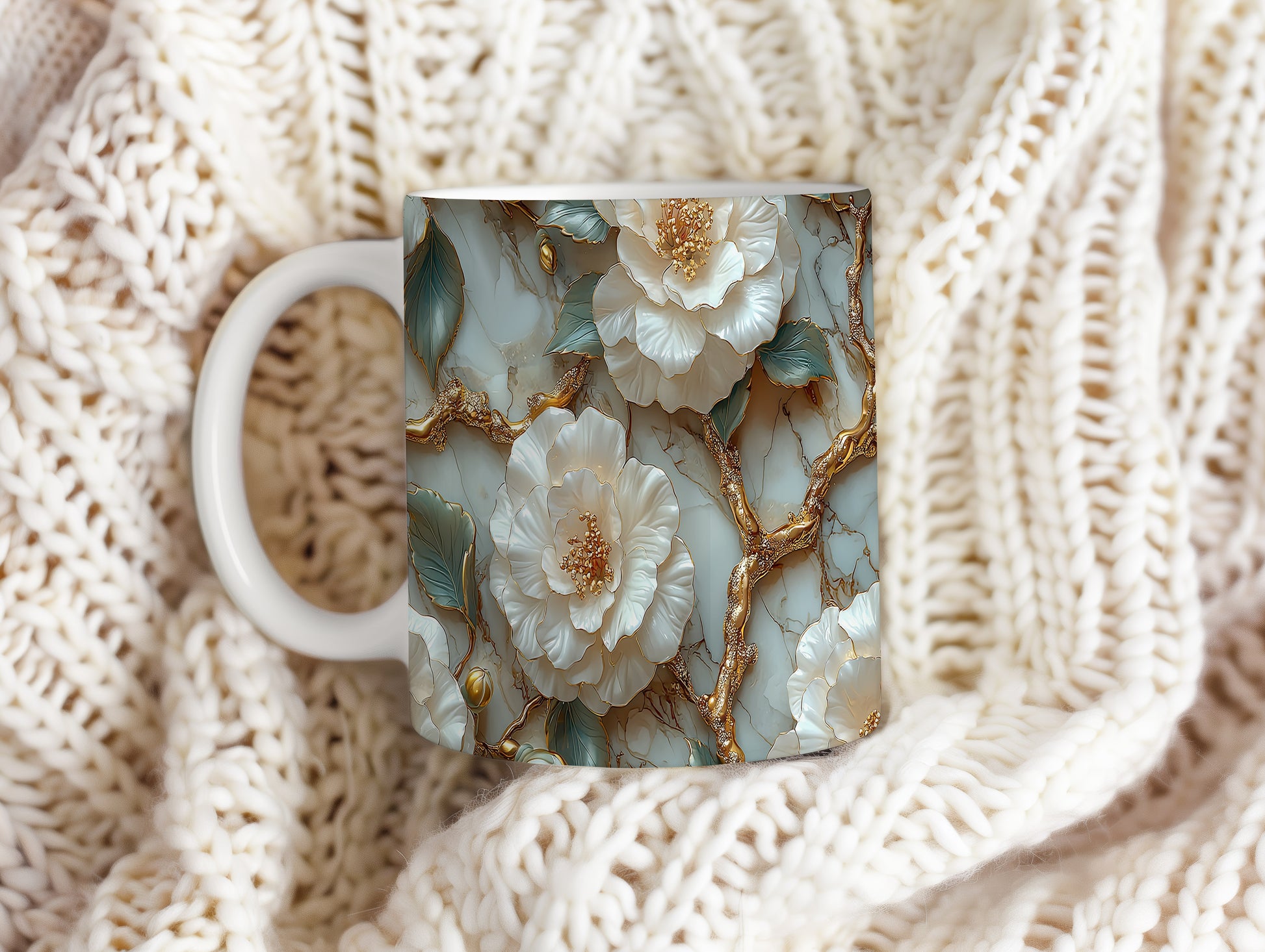Hrnek s květinovým motivem v bílých tónech – bílým provedením